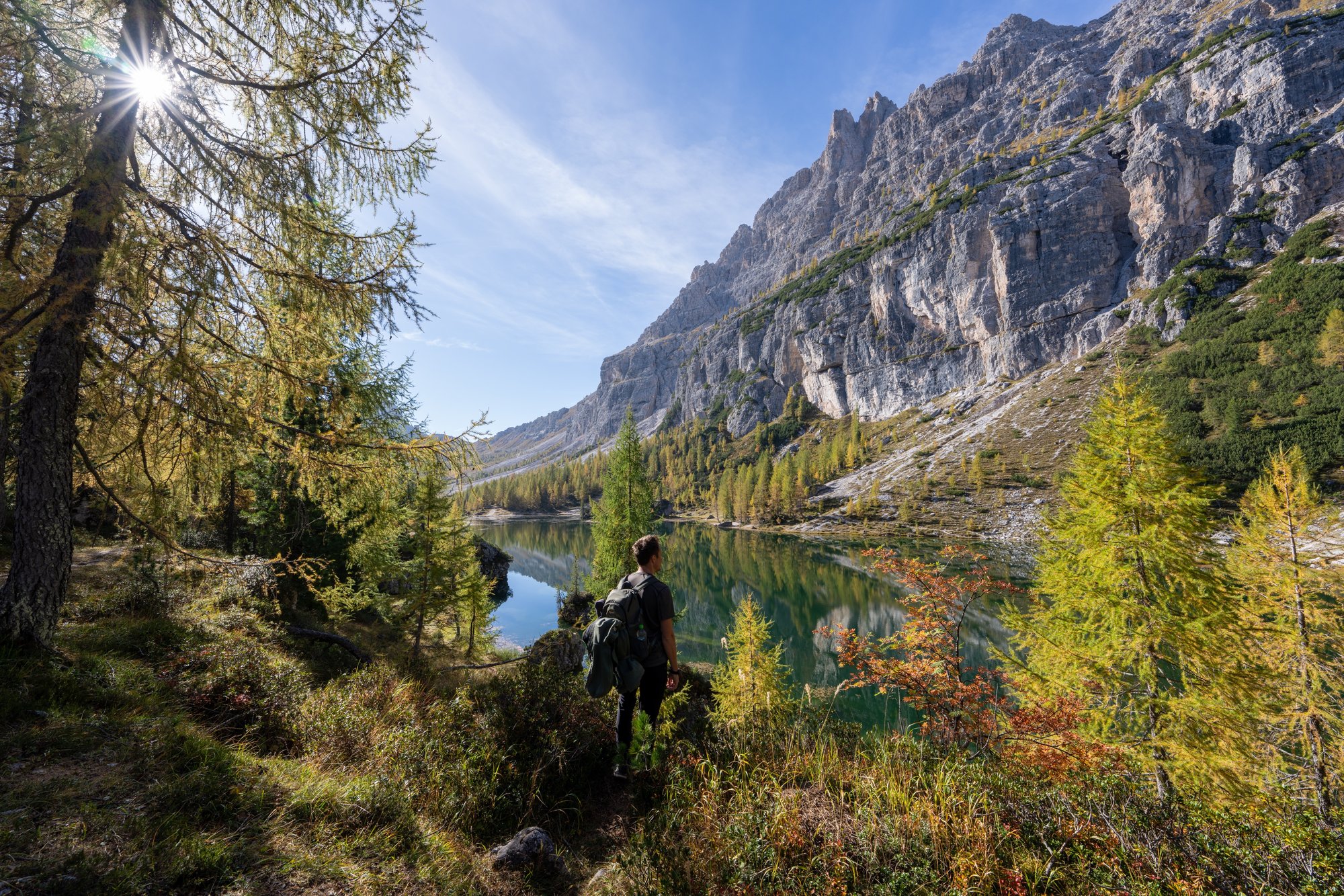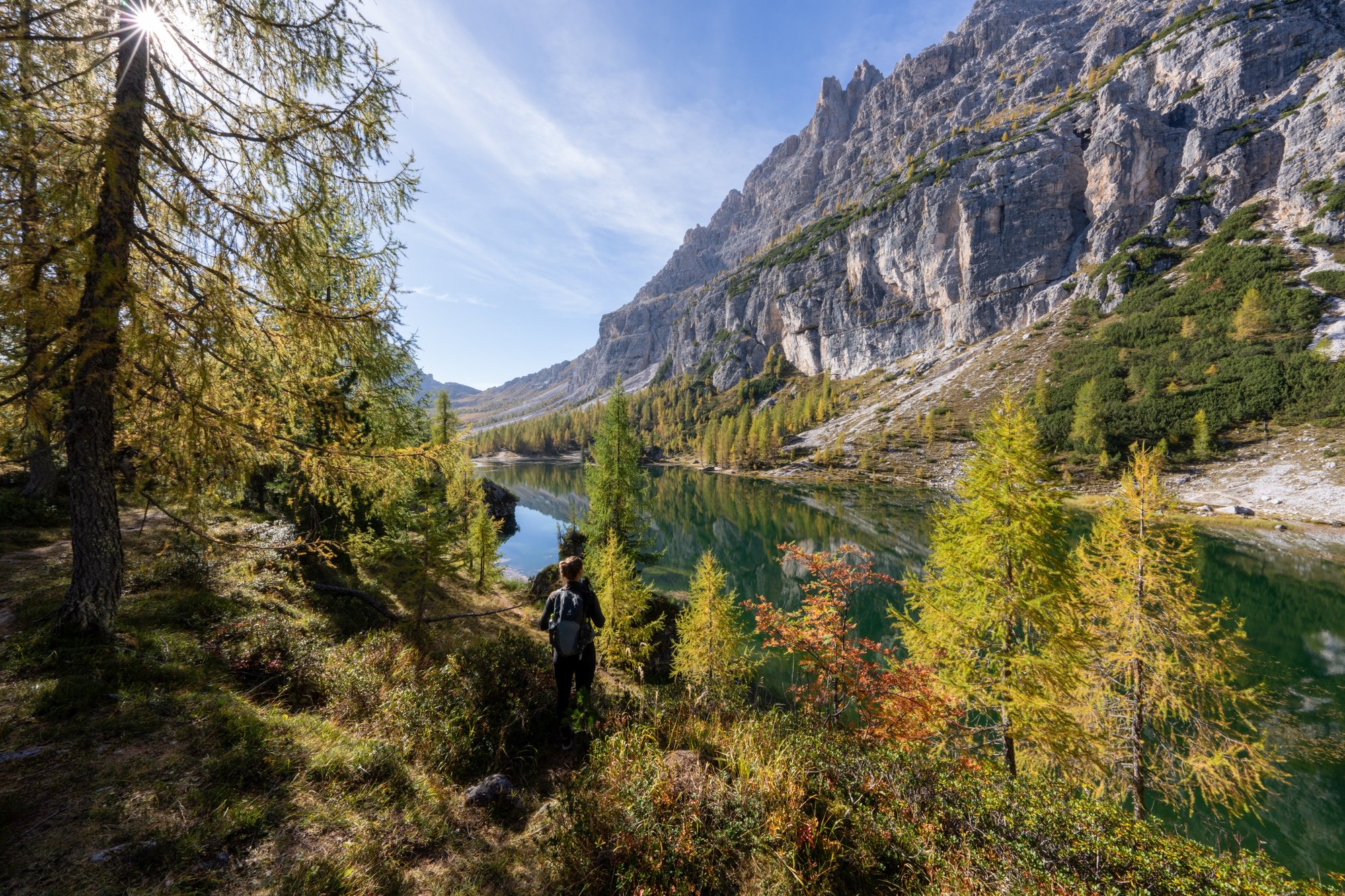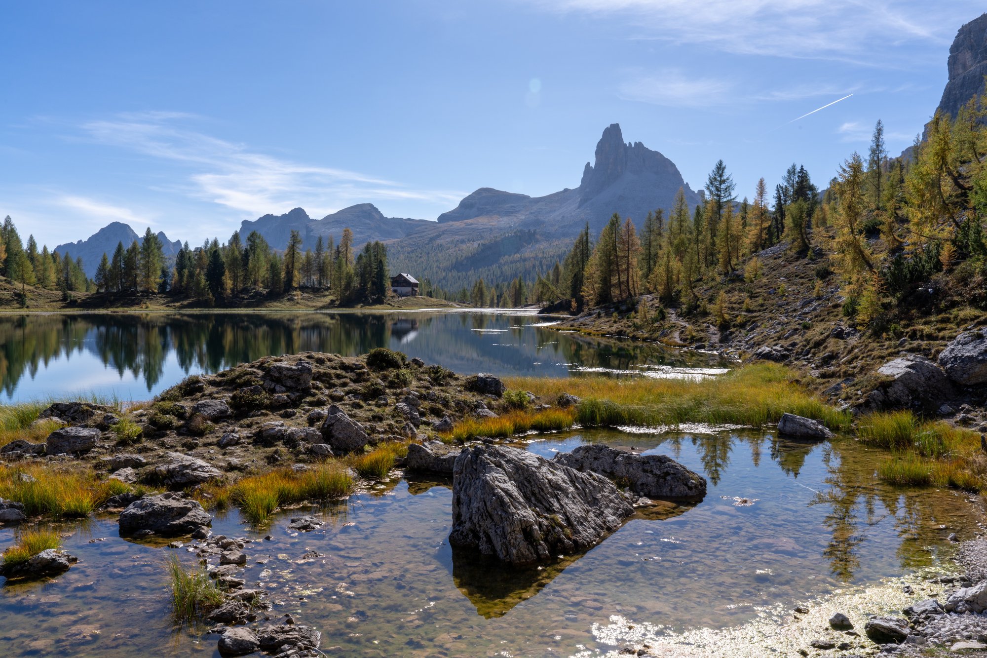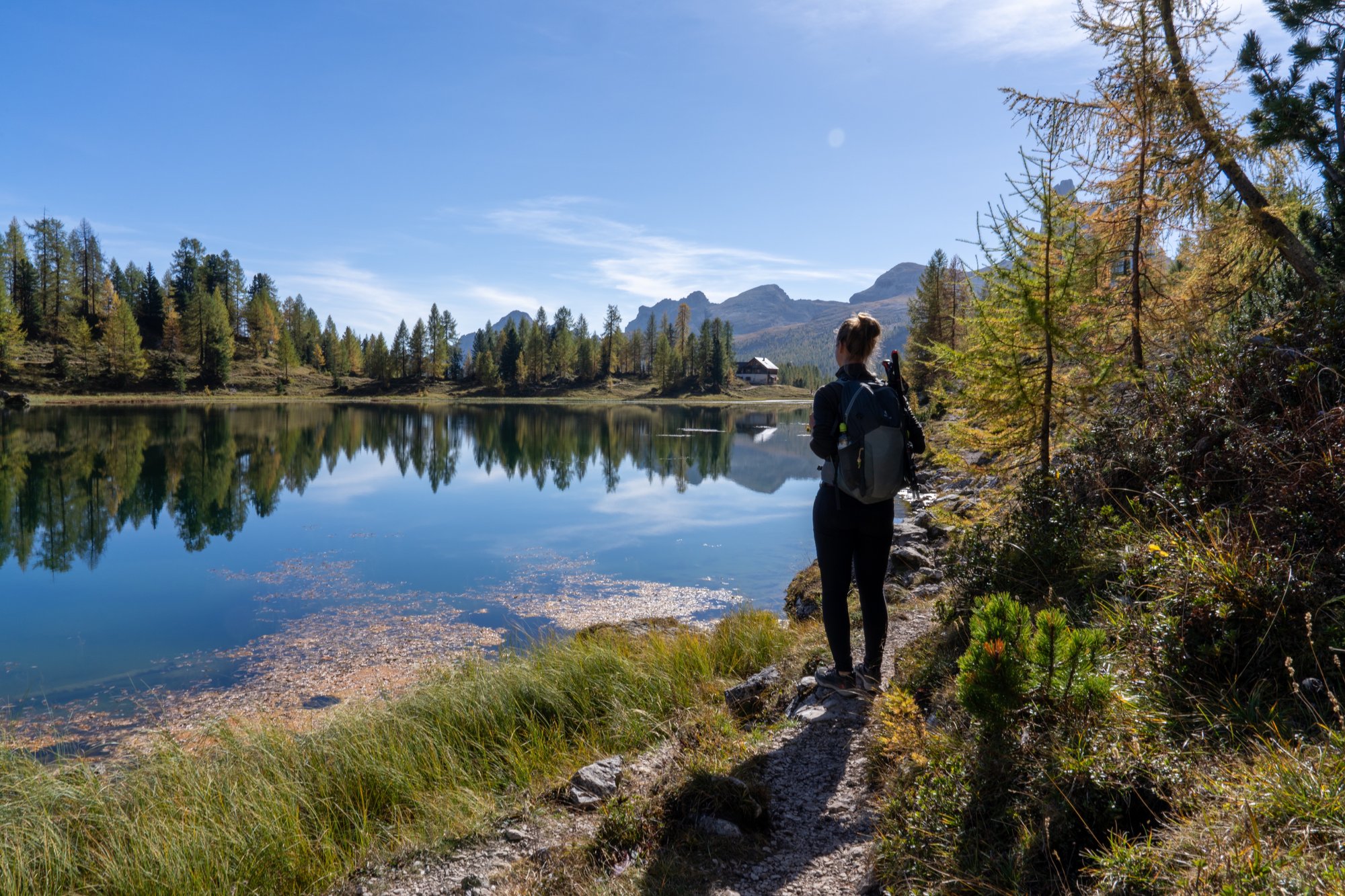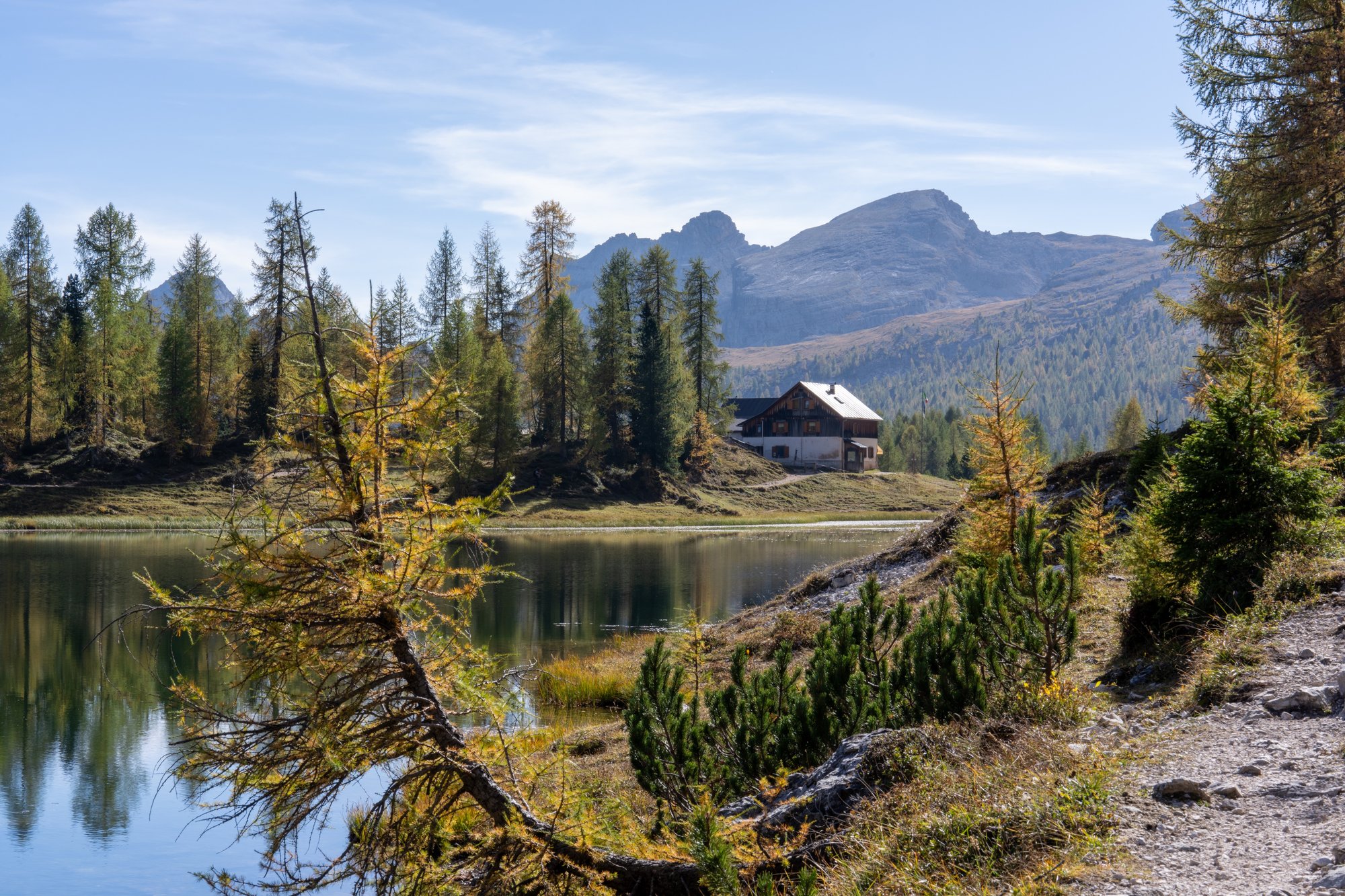 We lopen dan ook eerst een rondje om het gehele meer, voordat we bij de berghut die aan de oever ligt (Rifugio Croda da Lago) neerploffen voor een kopje koffie. We willen deze plek vanuit alle hoeken bekijken en vooral heel veel foto’s maken om dit wonderschone moment vast te leggen. Als we na een uur voldaan zijn, pakken we alsnog dat bakkie koffie bij de berghut. Leuk dat deze nog open is in oktober!