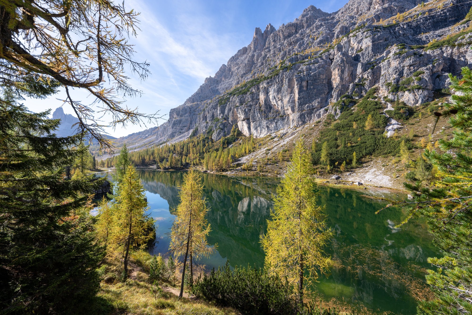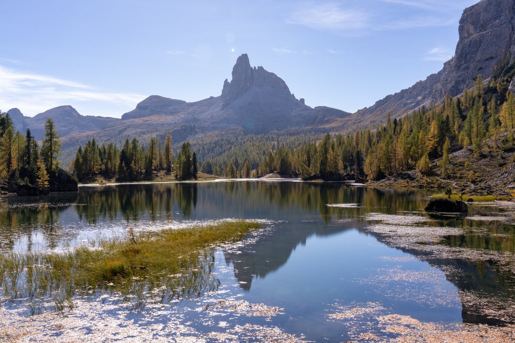 We zien op dit deel van de hike nog geen 10 andere mensen. Heerlijk, die rust! Het laatste deel tot Lago Federa is vrij vlak. Ongeveer 1,5 uur na vertrek staan we aan de rand van Lago Federa. Wauw! De kleuren zijn zo intens. Het water ligt er heel vredig bij en weerspiegelt zijn omgeving. Aan de overkant van het water torent de enorme bergwand van Croda da Lago woest boven alles uit. In de verte zien we de bergtop Becco di Mezzodi. Deze plek heeft alles: water, kleuren, bergen. Het is een compleet plaatje. En er is bijna niemand!