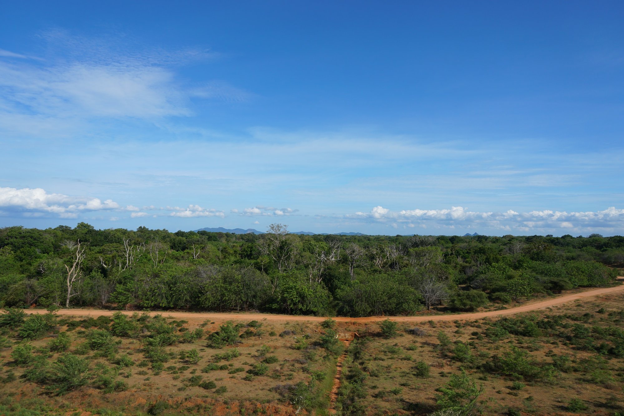 Na een fijn verblijf bij het Yala National Park is het tijd om verder te rijden. Met onze gehuurde tuktuk rijden we over de B35 weg richting de zuidkust van Sri Lanka. Deze weg loopt dwars door het nationaal park en we hebben al weleens gehoord dat er hier zomaar wilde dieren kunnen oversteken. Meestal schuilen de dieren midden op de dag tussen de bosjes, zodat ze wat schaduw hebben. Pas rond zonsondergang is de kans groter op een 'vreemde weggebruiker' op de weg.