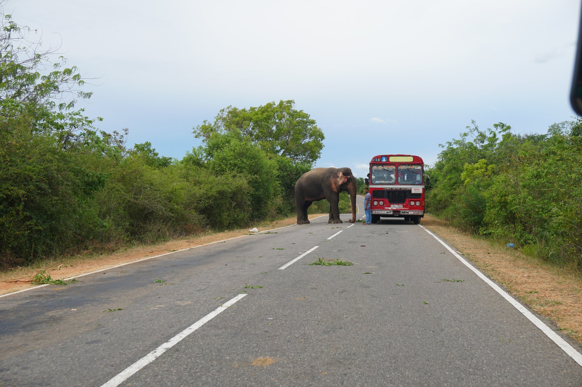 Gelukkig hebben we geen strakke planning vandaag, want een half uur later staat de olifant nog steeds midden op de weg. Een buschauffeur die vanaf de andere kant komt, ziet ons staan en schiet ons te hulp. Hij parkeert zijn bus tussen de olifant en de rechterkant van de weg, zodat wij veilig kunnen passeren met de bus als ‘schild’ ertussen. We zijn nog nooit zo dichtbij een wilde olifant geweest. Een moment om nooit te vergeten!