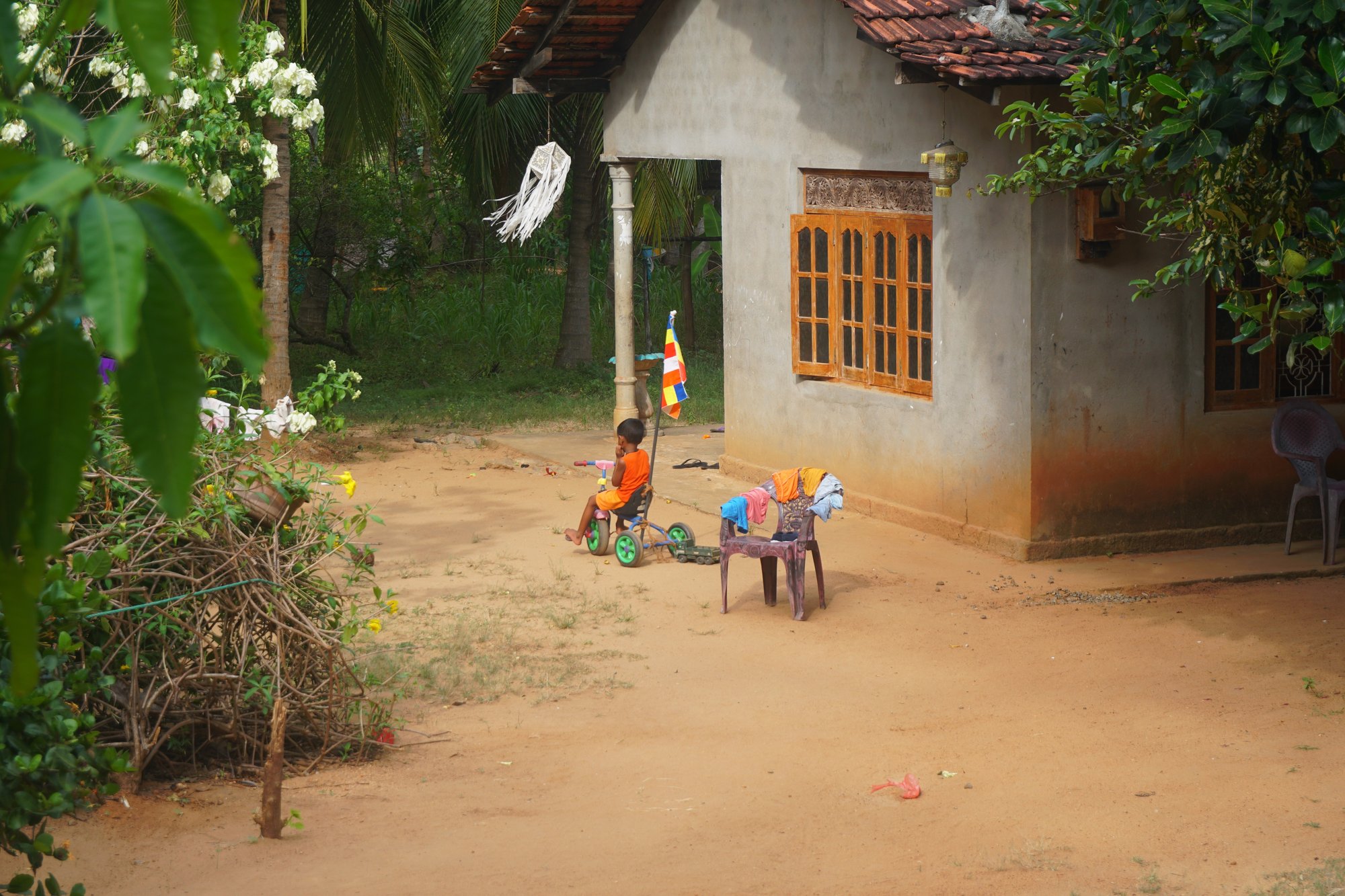 Als de zon ondergaat en we terug rijden richting de homestay, komen we nog langs de zogenaamde 'elephant watch'. Dit groepje mensen houdt iedere nacht de wacht rondom het dorp, omdat er geregeld 's nachts geplunderd wordt door olifanten. Ook vertelt Bhagya ons welke buitenlichten we vannacht aan moeten houden bij onze kamer om de olifanten op afstand te houden. Deze mensen wonen écht tussen de wilde dieren. Dat de leefwerelden van de Sri Lankanen en de wilde dieren zo dicht bij elkaar liggen levert soms spanningen op, maar ondanks alle hinder die ze ervan ondervinden zijn ze onlosmakelijk met elkaar verbonden en zouden de locals de dieren nooit pijn willen doen. Goed om te zien!