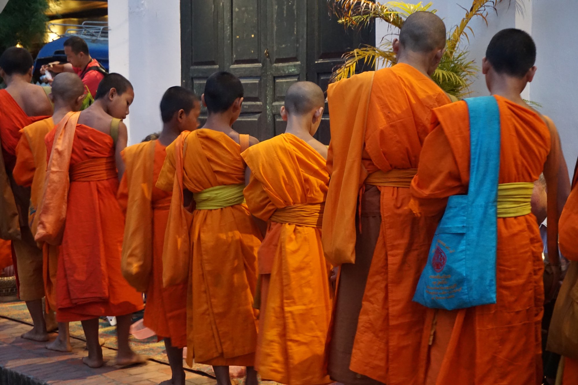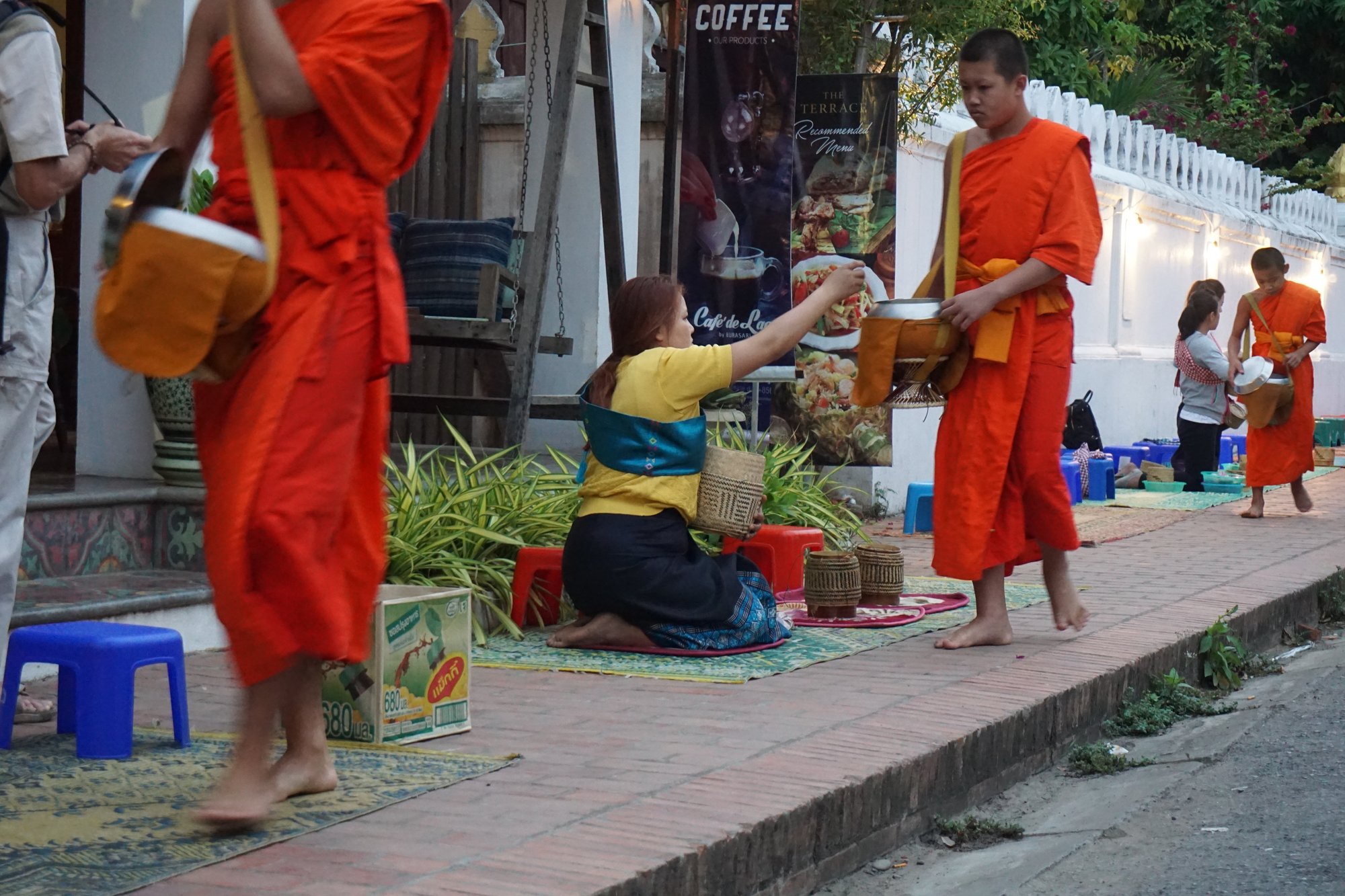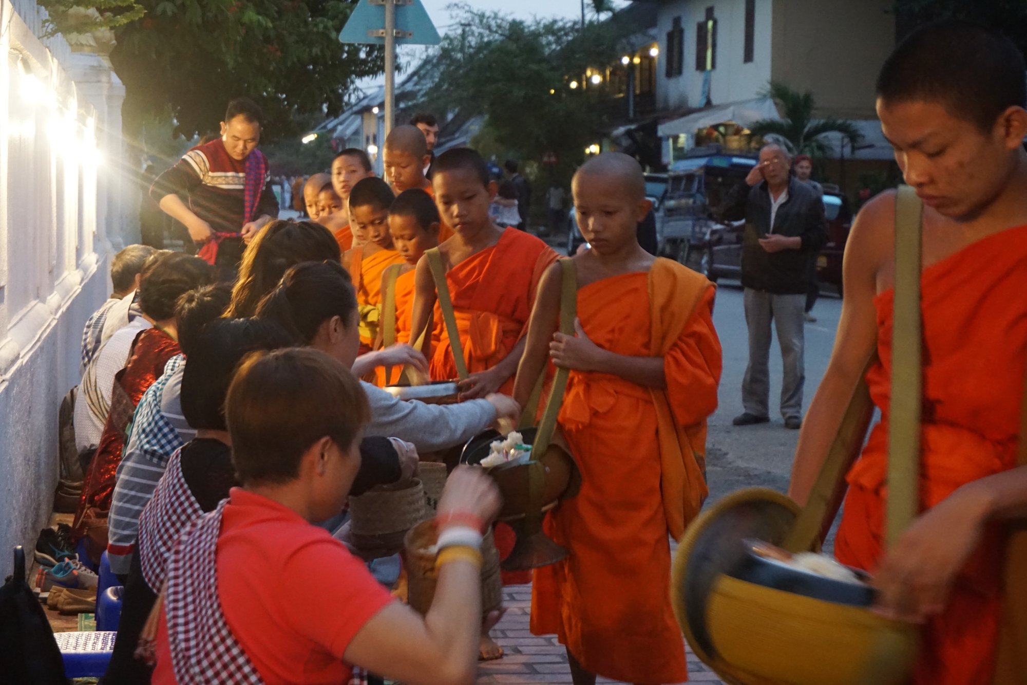 Wat wij echt een tegenvaller vonden is de aalmoes-ceremonie in de ochtend. Bij zonsopkomst lopen de monniken door de straten en krijgen aalmoezen aangereikt van gelovigen. Althans, dat is de bedoeling. Tegenwoordig is het helaas een poppenkast geworden. Alle richtlijnen en tradities worden overtreden door de toeristen. Alleen gelovigen mogen namelijk een aalmoes aanbieden van zelf bereid voedsel. Verder is het de bedoeling dat je afstand houdt van de monniken en hen niet stoort. Als er busladingen vol luidruchtige Aziatische toeristen toekijken en zelfs deelnemen aan de ceremonie, dan is voor mij het authentieke er echt wel vanaf. Wel heel jammer, zeker als je om 5 uur bent opgestaan uit bed. ;-)