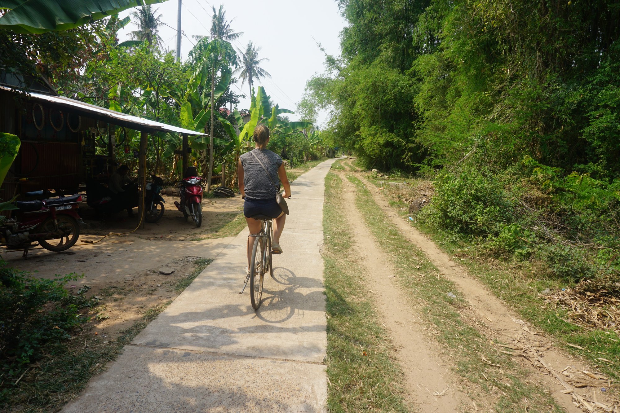 We fietsen langs mango-bomen, rijstvelden en bananenbomen. Er worden nog koeien gebruikt om spullen te vervoeren, het is alsof je even terug gaat in de tijd op dit eilandje. Ook al hebben ze misschien minder comfort dan de Cambodjanen op het vasteland, de mensen lijken hier heel tevreden. Met een vrolijk gevoel verlaten we het eiland na een uurtje. Dat was leuker dan gedacht!