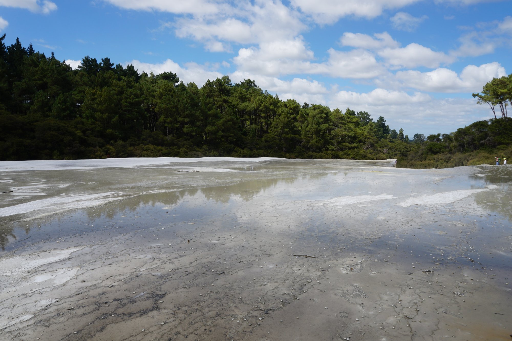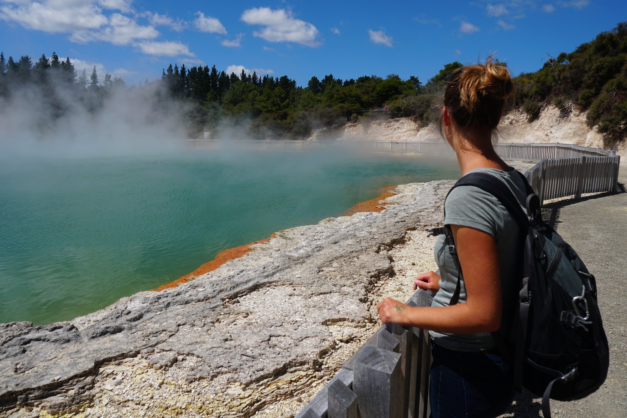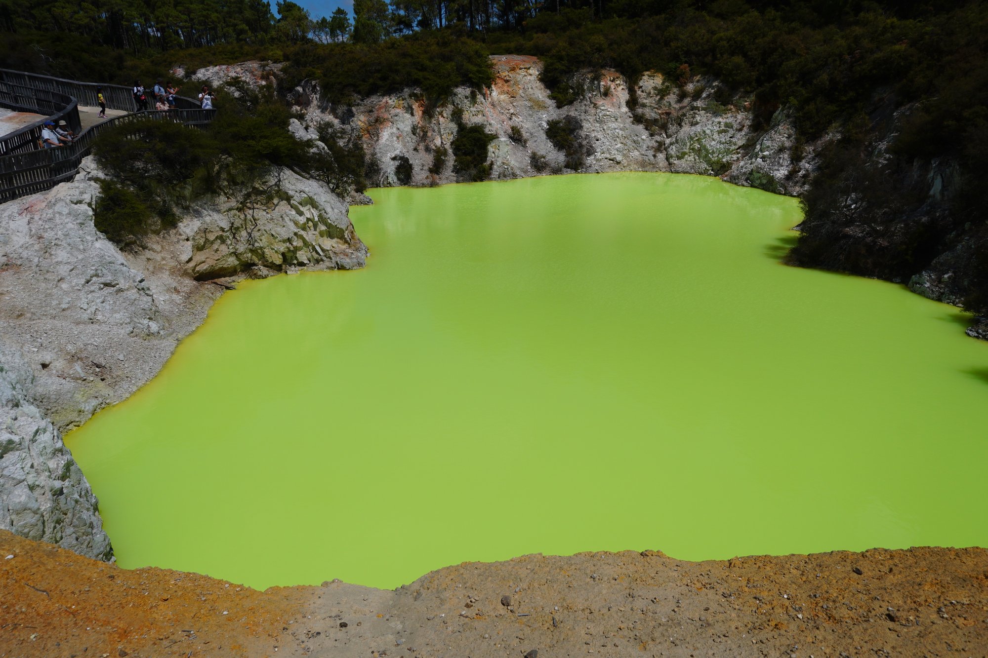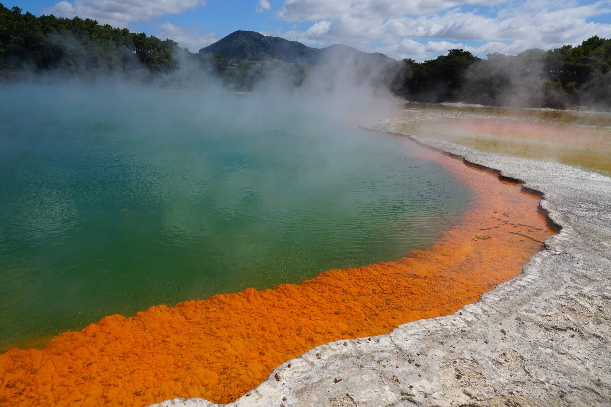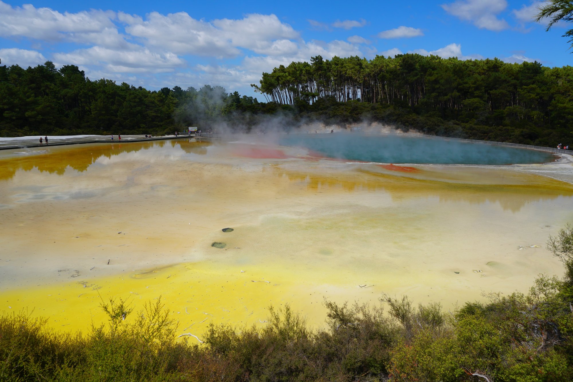 Champagne Pool is een groot meer (doorsnede van 60 meter) met aan de zijkanten een feloranje kleur door de mineralen. Als je goed kijkt, zie je hele kleine belletjes in het water. Vandaar de naam Champagne Pool. ;-) De kleuren in het water, de damp die omhoog komt, het is een fotogenieke plek! Alleen de geur is wat minder... ;-)