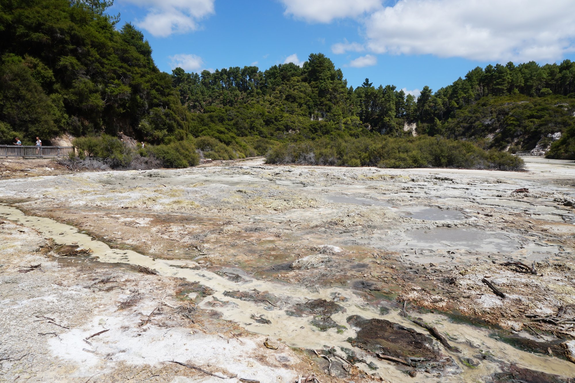 We lopen door een prachtig bos en komen langs toffe uitzichtpunten en vlaktes vol kleuren van alle mineralen. Het is belangrijk om echt op de paden te blijven, want overal om ons heen zien we kleine waterpoelen borrelen en stoom uit de grond komen. De aarde zit hier niet stil!