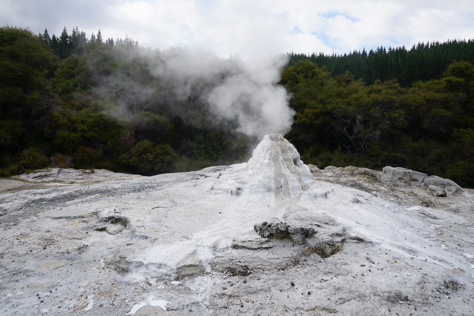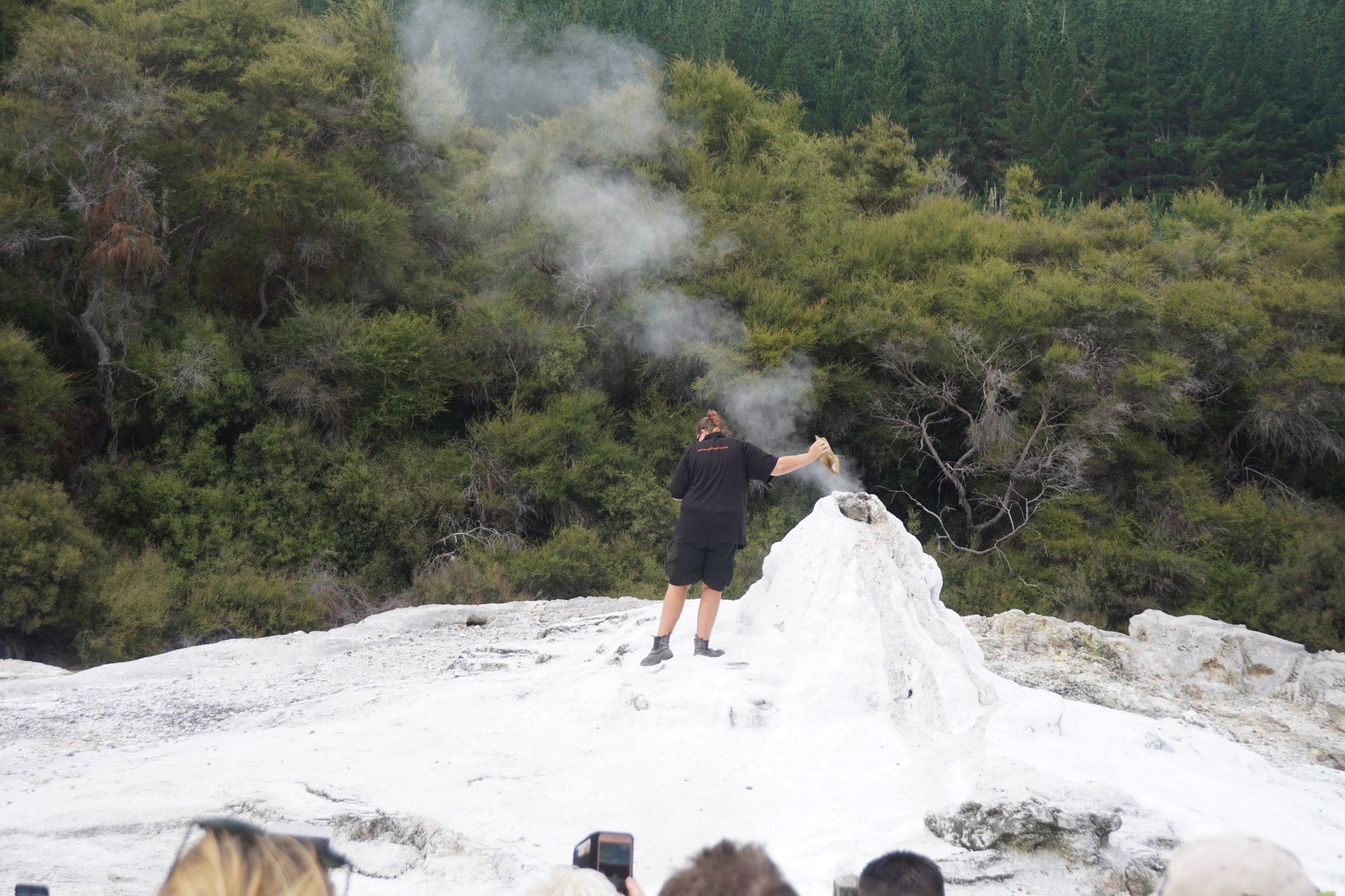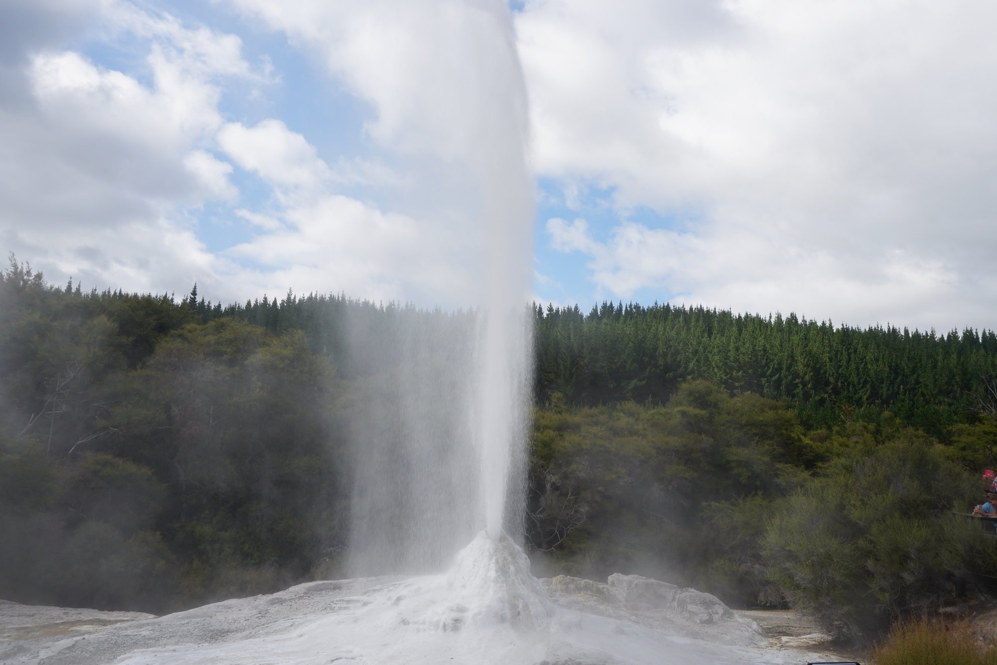 Aan de ene kant natuurlijk tof, want je bent er nu van verzekerd dat je het spuiten van de Lady Knox geiser kunt zien. Aan de andere kant voelde het net alsof we naar een voorstelling zaten te kijken. Rondom de geiser is een soort tribune gemaakt en de parkmedewerker die Lady Knox 'een handje komt helpen' geeft informatie en maakt er ook daadwerkelijk een show van. Ze heeft zelfs een microfoon! Wat ons betreft dus niet de highlight van het park, maar wel leuk om even gezien te hebben. ;-)