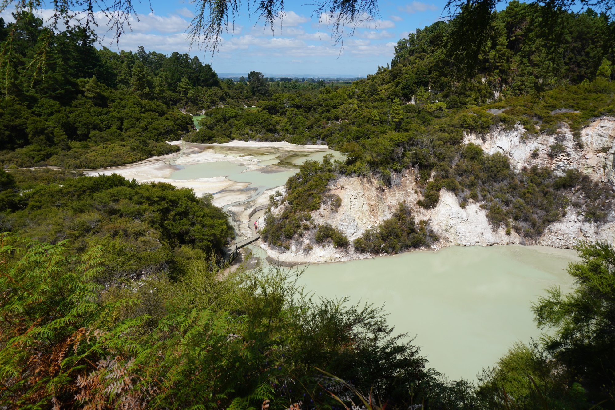Nadat we de Lady Knox geiser hebben gezien, lopen we terug naar de hoofdingang van het park. We beginnen aan de wandeling langs de highlights in het Wai-O-Tapu Wonderland. Eerst komen we langs een aantal stomende kraters en borrelende modderpoelen. Daarna komen we bij één van de bekendste plekken in het park: Champagne Pool. Wauw, wat een kleuren!
