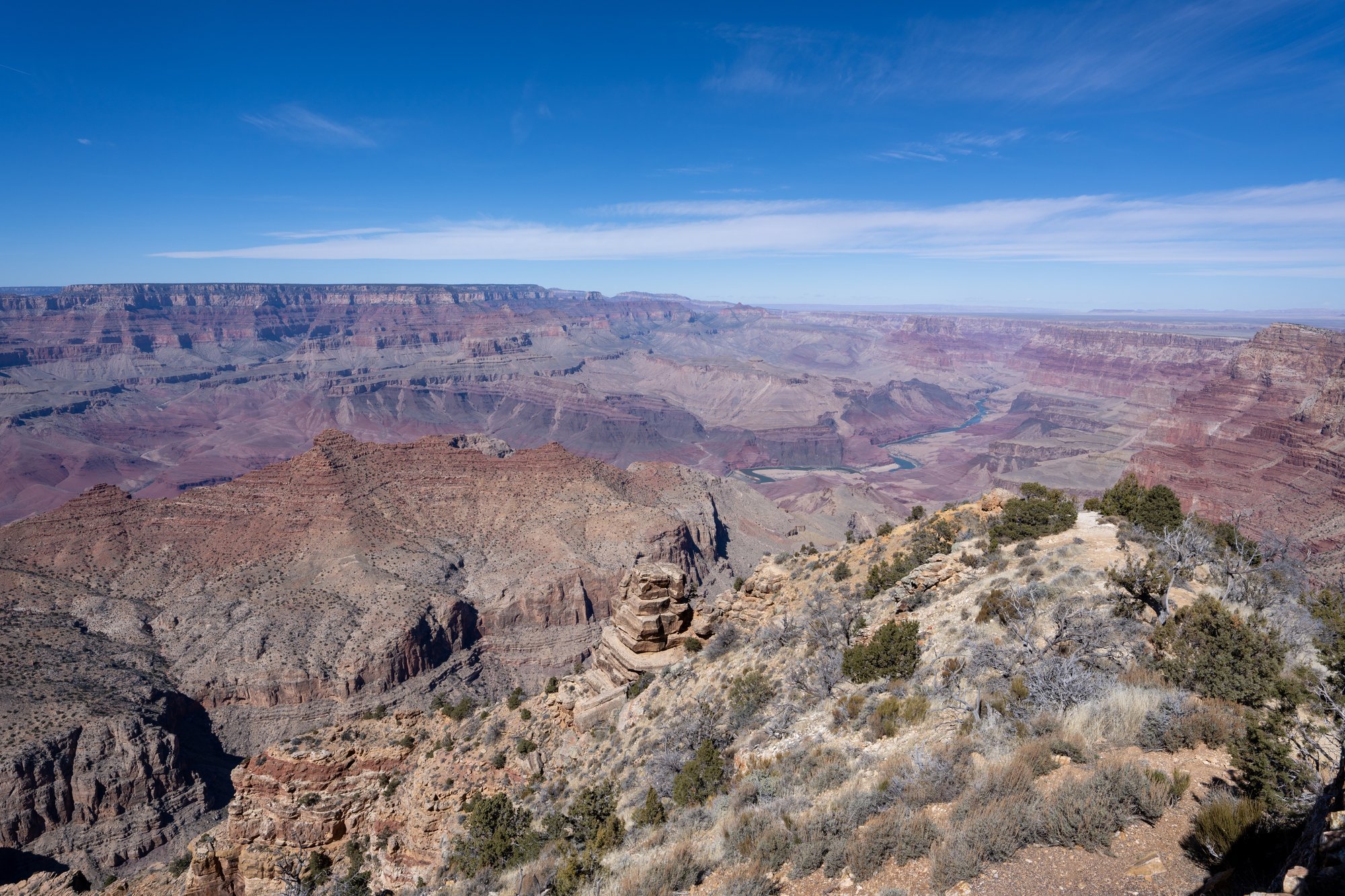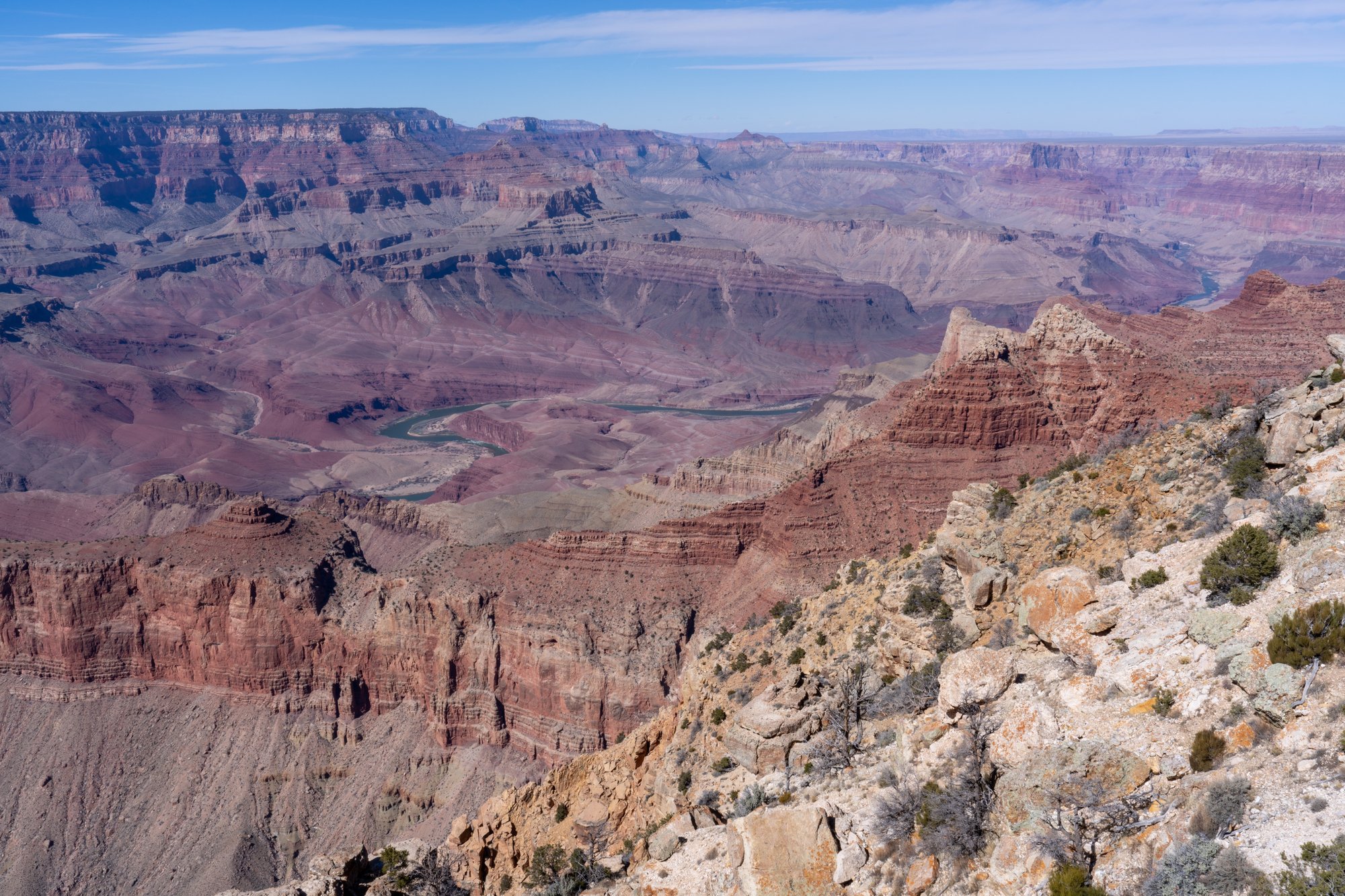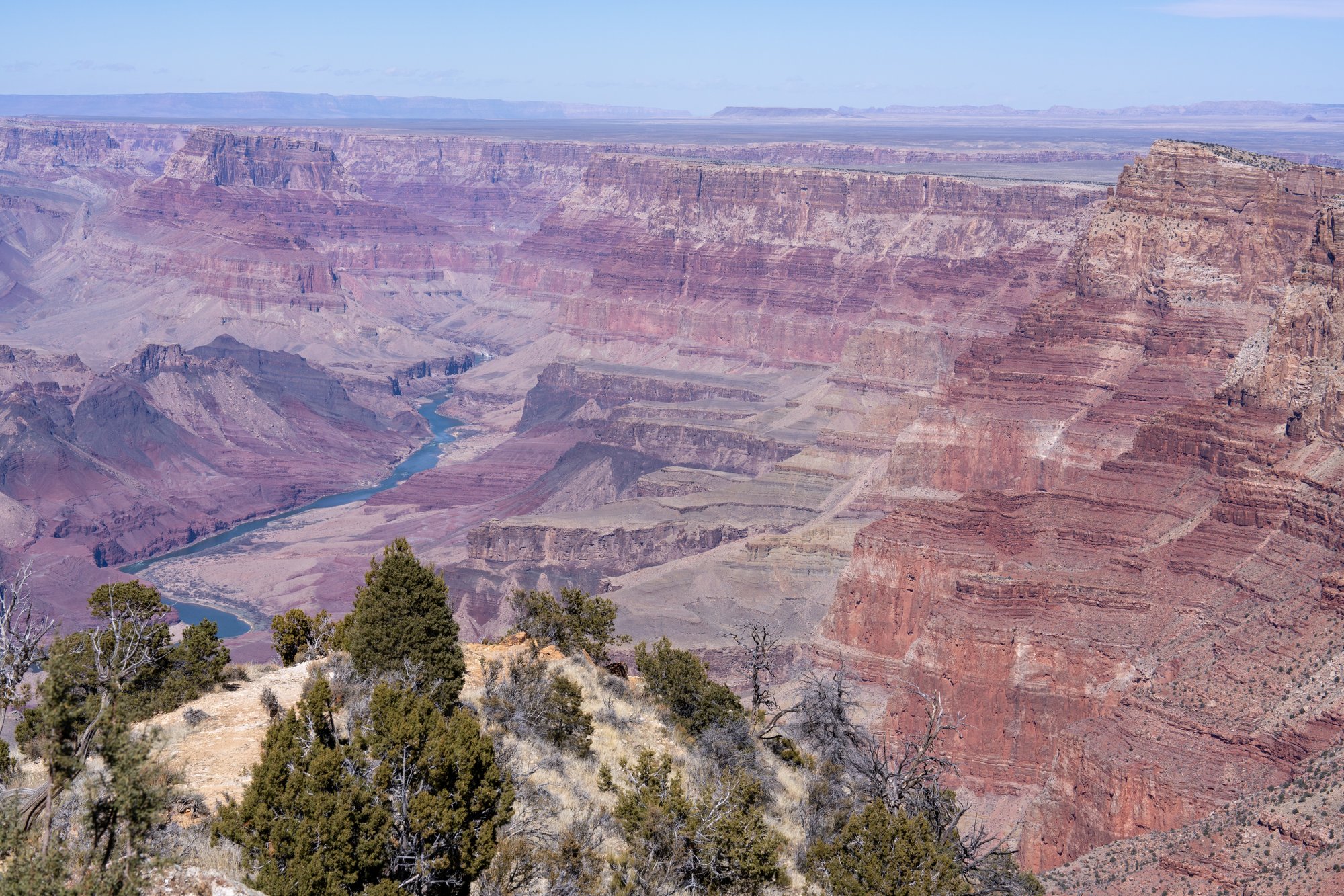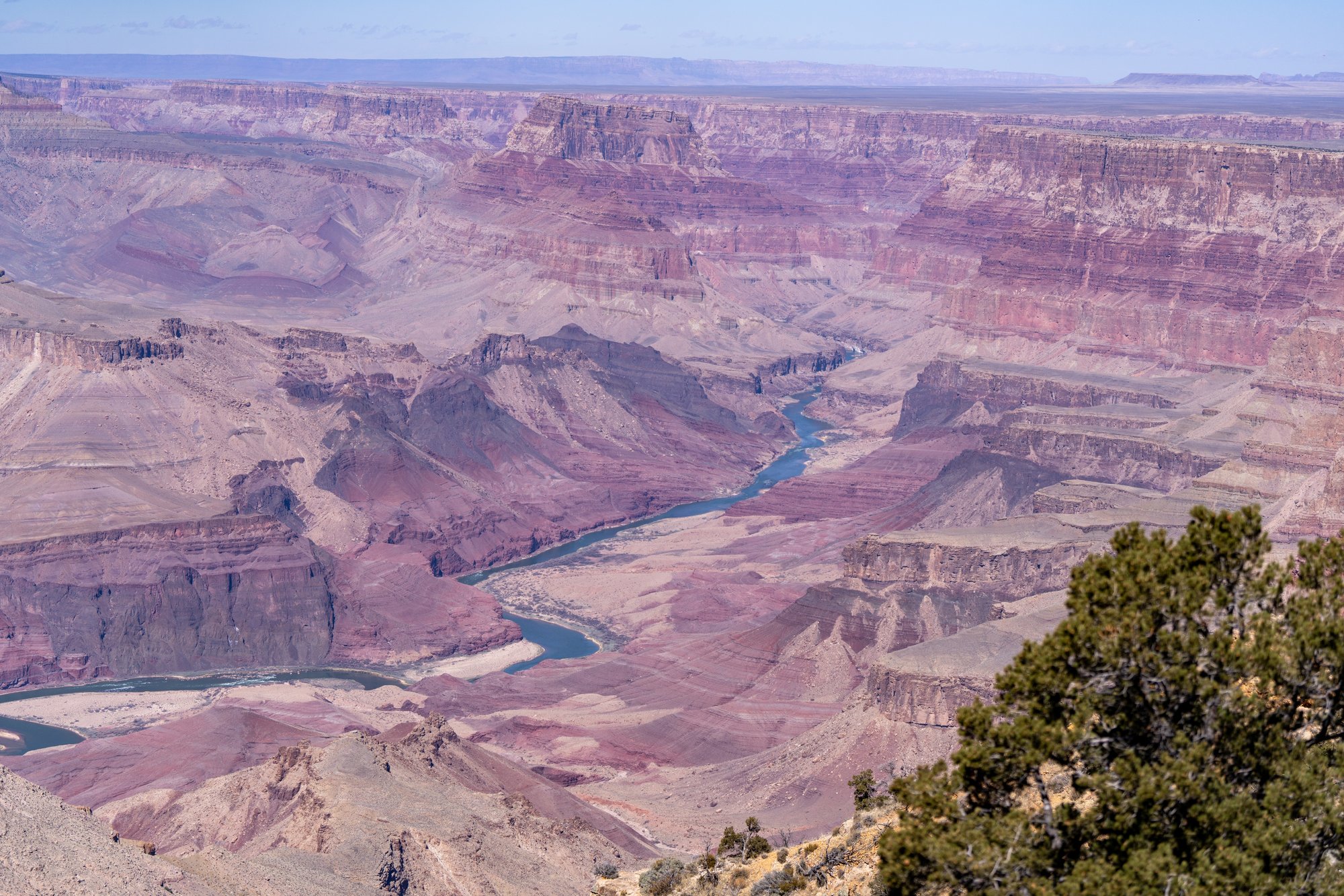 Vanaf sommige uitzichtpunten kun je de Colorado rivier beneden in de kloof zien liggen. Het is onvoorstelbaar om je te bedenken dat deze immense kloof is ontstaan door dat ogenschijnlijk rustige en smalle riviertje daar onderin. Althans, van een afstandje ziet de rivier er niet groot uit. Waarschijnlijk is hij groter en ruiger als je aan de oever staat, maar zover zullen wij niet komen tijdens ons bezoek aan de Grand Canyon.