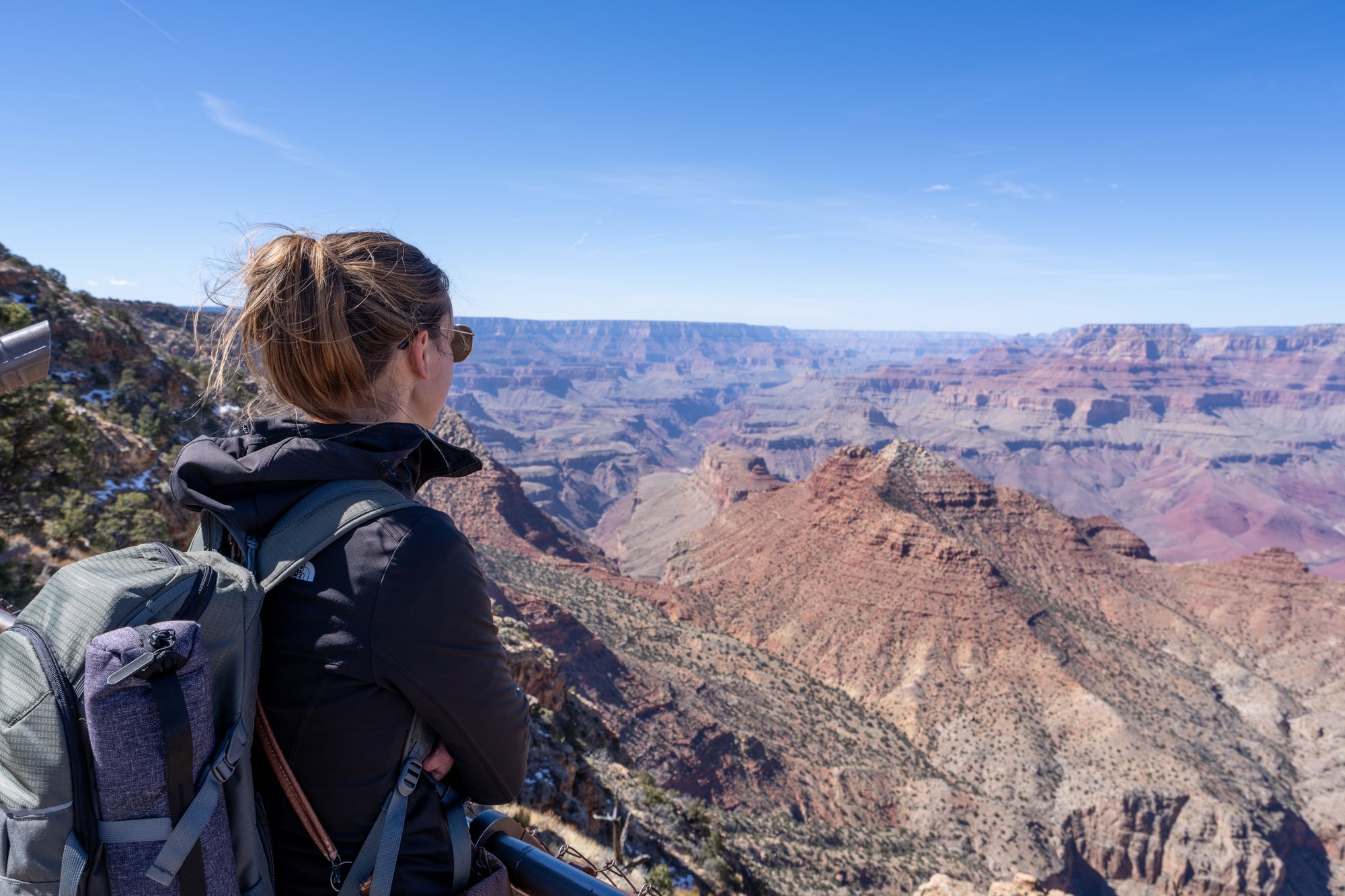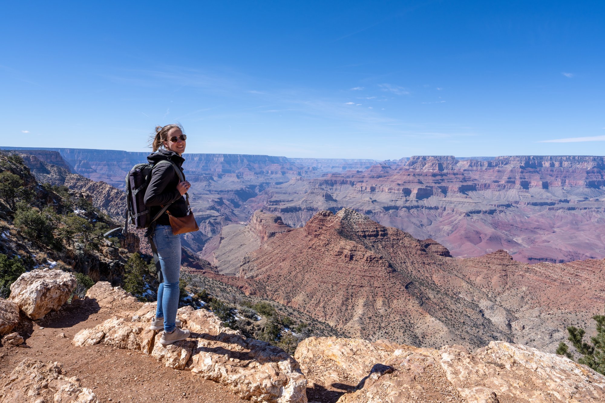 De Grand Canyon ligt in een woestijnachtig gebied, maar vergis je niet. Beide ‘rims’ liggen vrij hoog, minstens zo’n 1.600 meter boven zeeniveau. Dat betekent dat het fris kan zijn, ook in het voorjaar als het op andere plekken in Arizona al aangenaam of zelfs warm is. Tijdens ons bezoek stond er veel wind en daardoor lag de gevoelstemperatuur een stuk lager dan gedacht. Er lag op sommige trails de canyon in - waar weinig zon komt - zelfs nog wat ijs op het pad toen wij er waren. Dat zegt genoeg, denk ik!