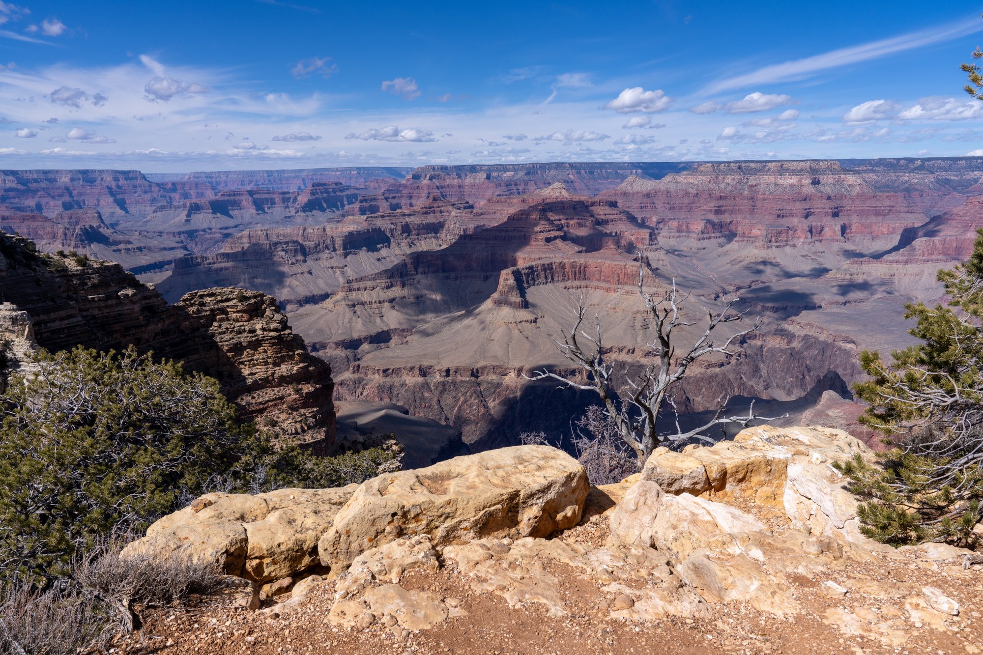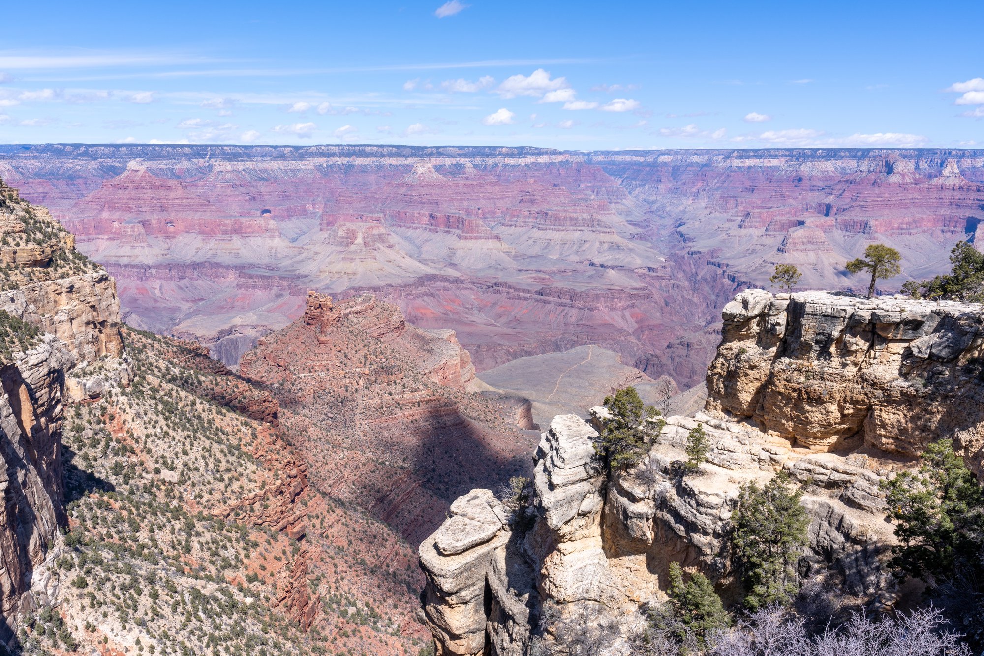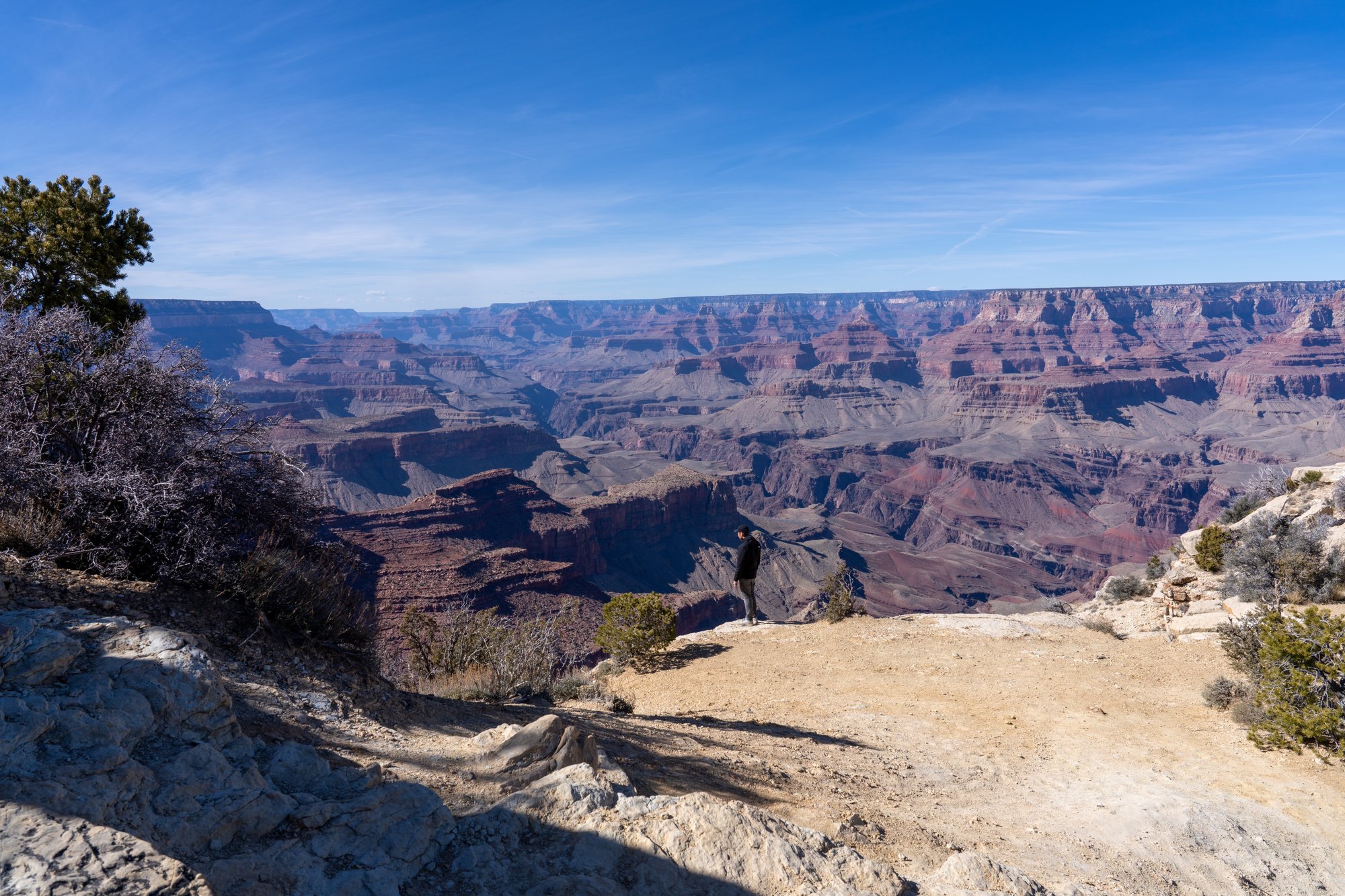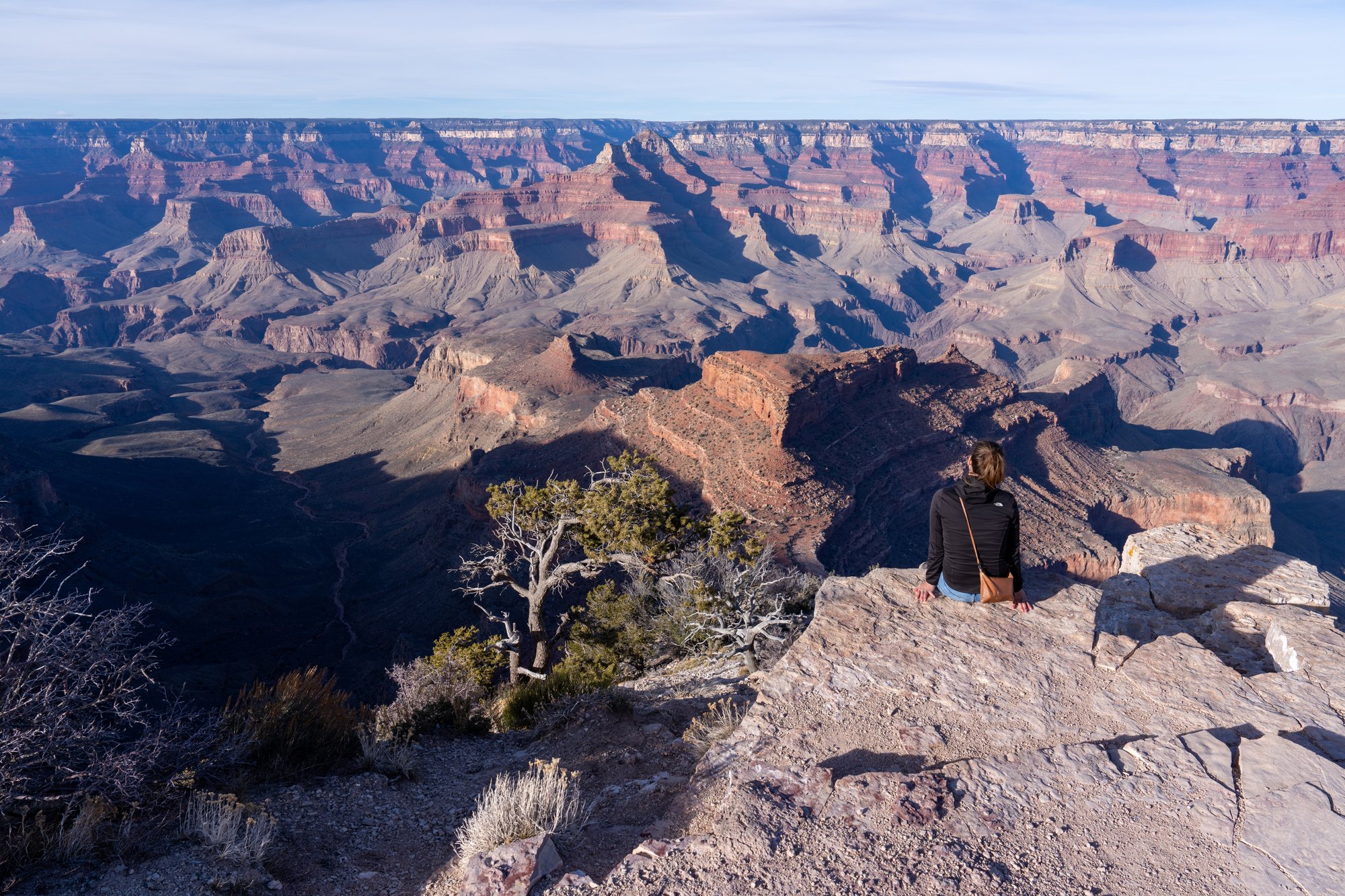 De volgende dag hebben we - na wat werk in de ochtend - wel zin om nog een kijkje te gaan nemen bij de Grand Canyon. Dit keer kiezen we voor de uitzichtpunten aan de westelijke kant van het nationaal park, namelijk aan Hermit Road. Het grootste deel van het jaar mag je niet met je eigen voertuig over Hermit Road rijden, maar gaan er shuttlebussen die continu tussen de uitzichtpunten pendelen. Handig!