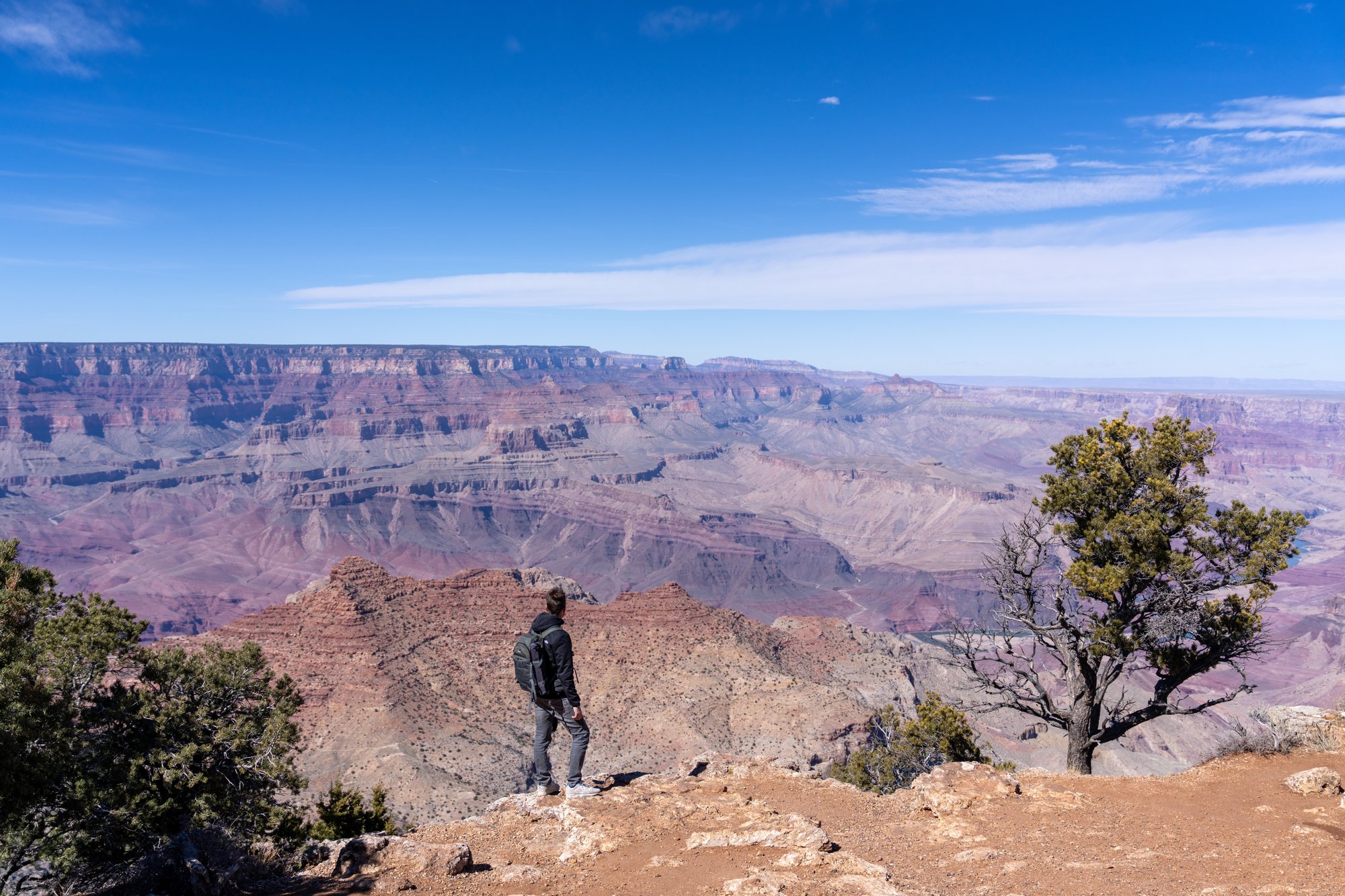 We eindigen onze middag ‘viewpoint hoppen’ met de korte wandeling naar Shoshone Point. Het is slechts 1,6 kilometer lopen vanaf de parkeerplaats naar dit uitzichtpunt, maar blijkbaar is dat genoeg voor veel mensen om deze plek over te slaan. Het is namelijk heerlijk rustig op het bospad en bij Shoshone Point zelf. We zijn blij dat wij wel die 20 minuutjes hebben genomen om naar Shoshone Point te lopen, want dit is onze favoriet van de dag. Bij Shoshone Point sta je namelijk op een soort peninsula, waardoor je op het uiteinde omringd bent door de Grand Canyon. Echt heel gaaf!