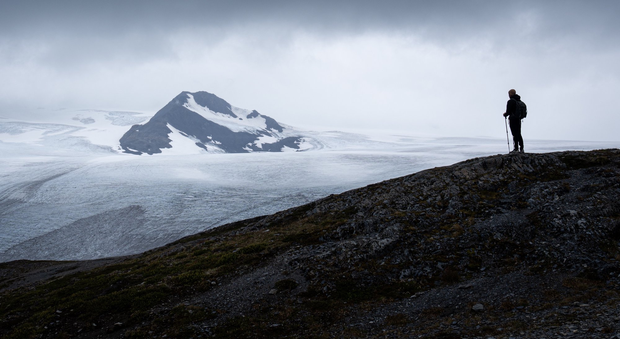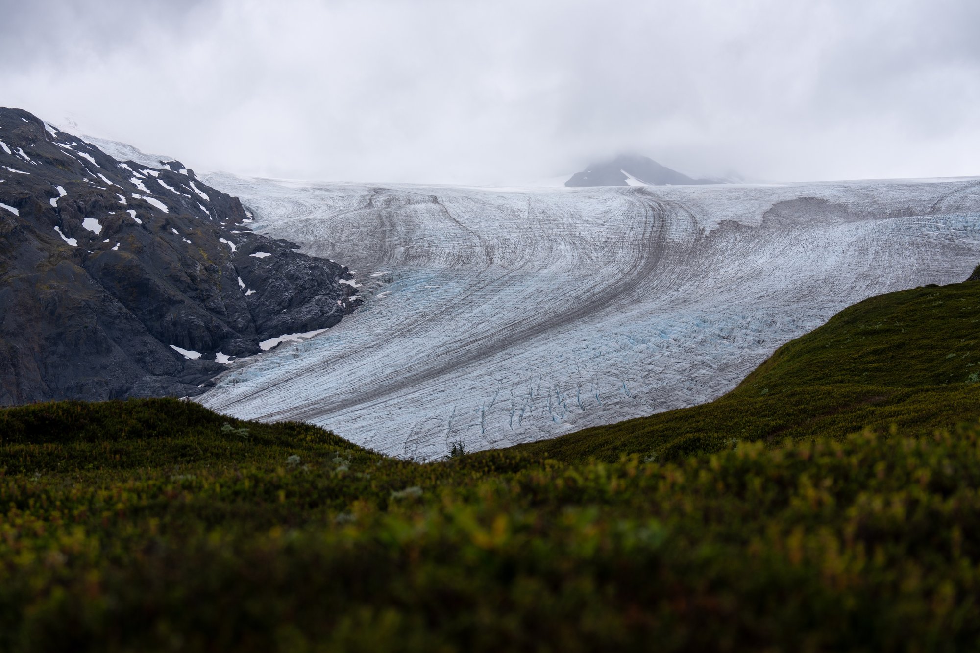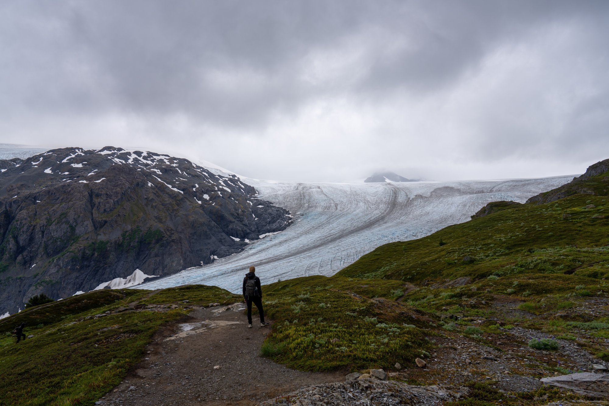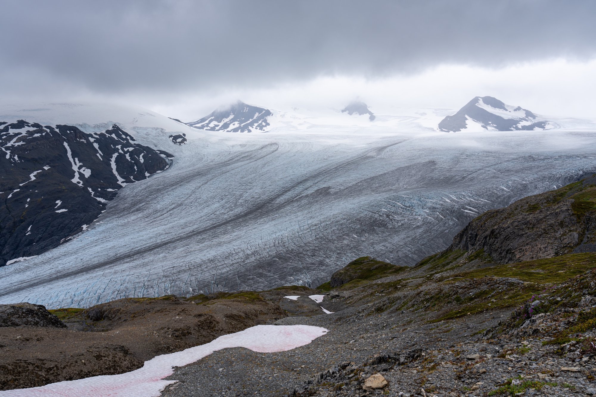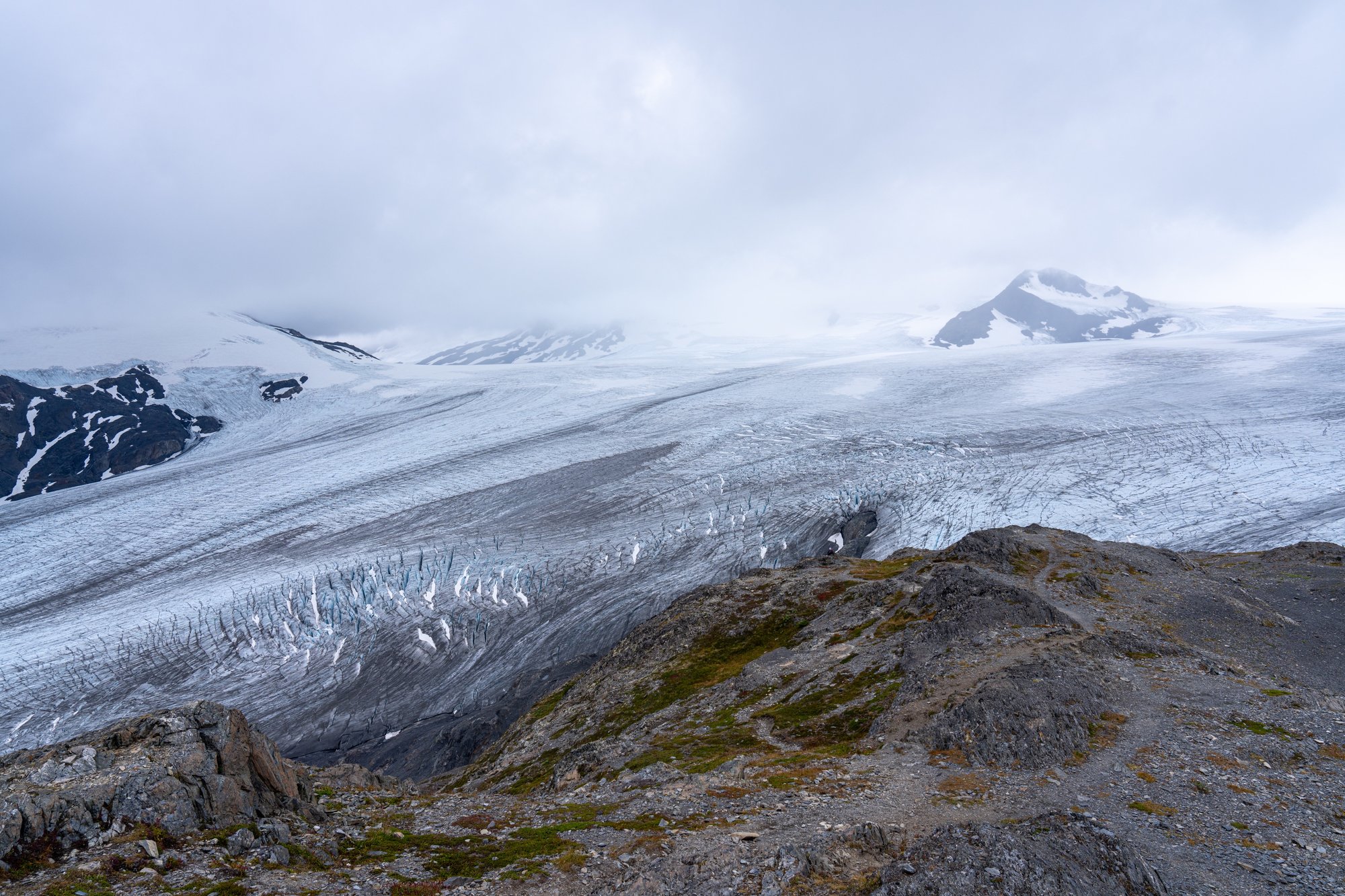 Een uur of 3 na ons vertrek komen we bij het eindpunt van de Harding Icefield Trail. De uitgestrektheid van het ijsveld beneemt ons even de adem. Wat is dit puur en ruig. Het zicht is niet erg goed met alle wolken laag op het ijsveld, maar alsnog is dit een fantastische plek.