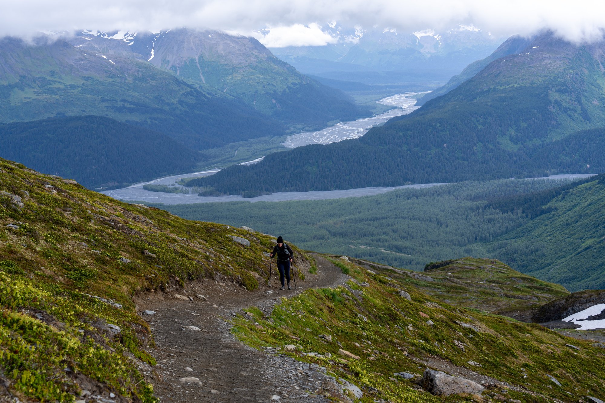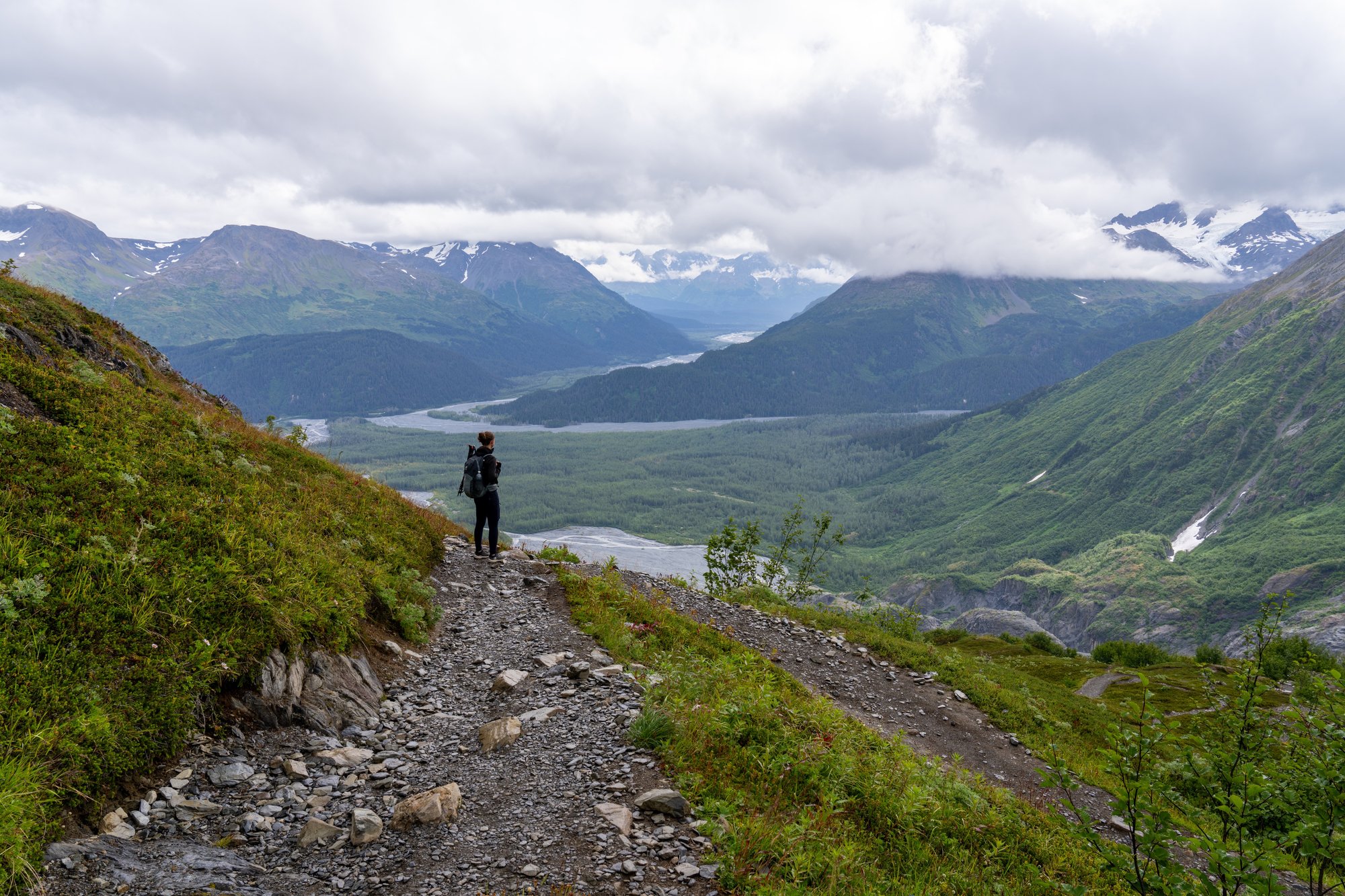 De weersvoorspellingen zijn verre van ideaal voor een lange hike. Het is grijs, de wolken hangen laag en het is een koude dag in Alaska. We twijfelen of het de moeite is om bijna 1.000 meter te klimmen met dit beperkte uitzicht, maar we gaan het toch maar proberen. We zijn wel een tijdje onderweg en wie weet trekt het in de tussentijd open. En als het echt bar en boos is, kunnen we bij de lager gelegen uitzichtpunten altijd nog een rechtsomkeert maken.