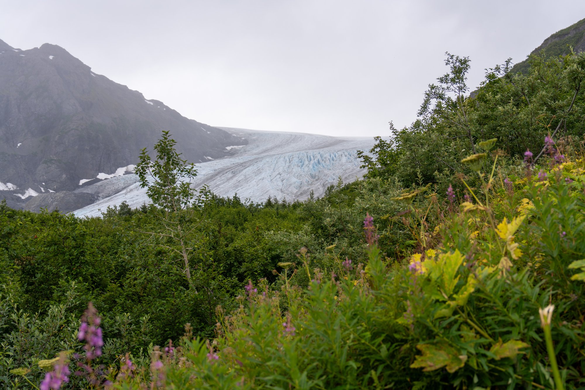 Af en toe komen we langs een open plek en kunnen we de vallei beneden en de bergen om ons heen zien. Ook vangen we soms een glimp op van Exit Glacier. Na 2,5 kilometer bereiken we het eerste uitzichtpunt: Marmot Meadows.