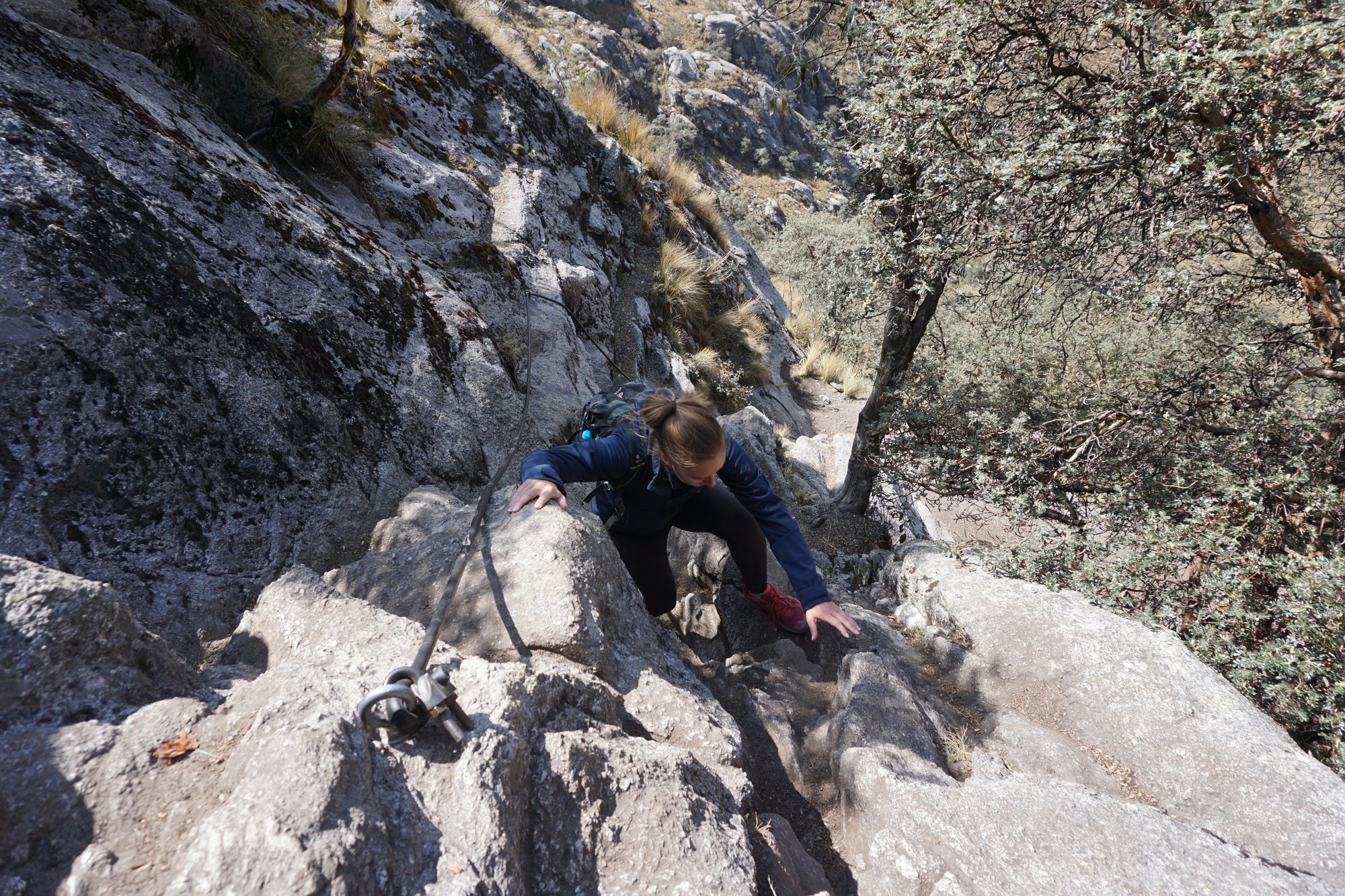 Eenmaal bij het startpunt van de hike schrijven we ons in, betalen we 30 soles entree (€7,80) en starten we op een hoogte van 3.850 meter. Op naar de 4.450 meter! Het is niet even rustig opwarmen, nee het pad loopt gelijk steil naar boven. Na een half uur lopen we eindelijk over een redelijk vlak paadje. Het is maar voor even, maar toch fijn om even bij te komen. Dit duurt alleen niet lang, het overgrote deel bestaat uit steile hellingen tijdens deze hike. Vlak voordat we bij het meer zijn moeten we nog één uitdagend stuk overwinnen. Enorm steile rotsen waar je met behulp van touwen tegenop moet klimmen. Spannend, maar wel een leuke afwisseling op het lopen!