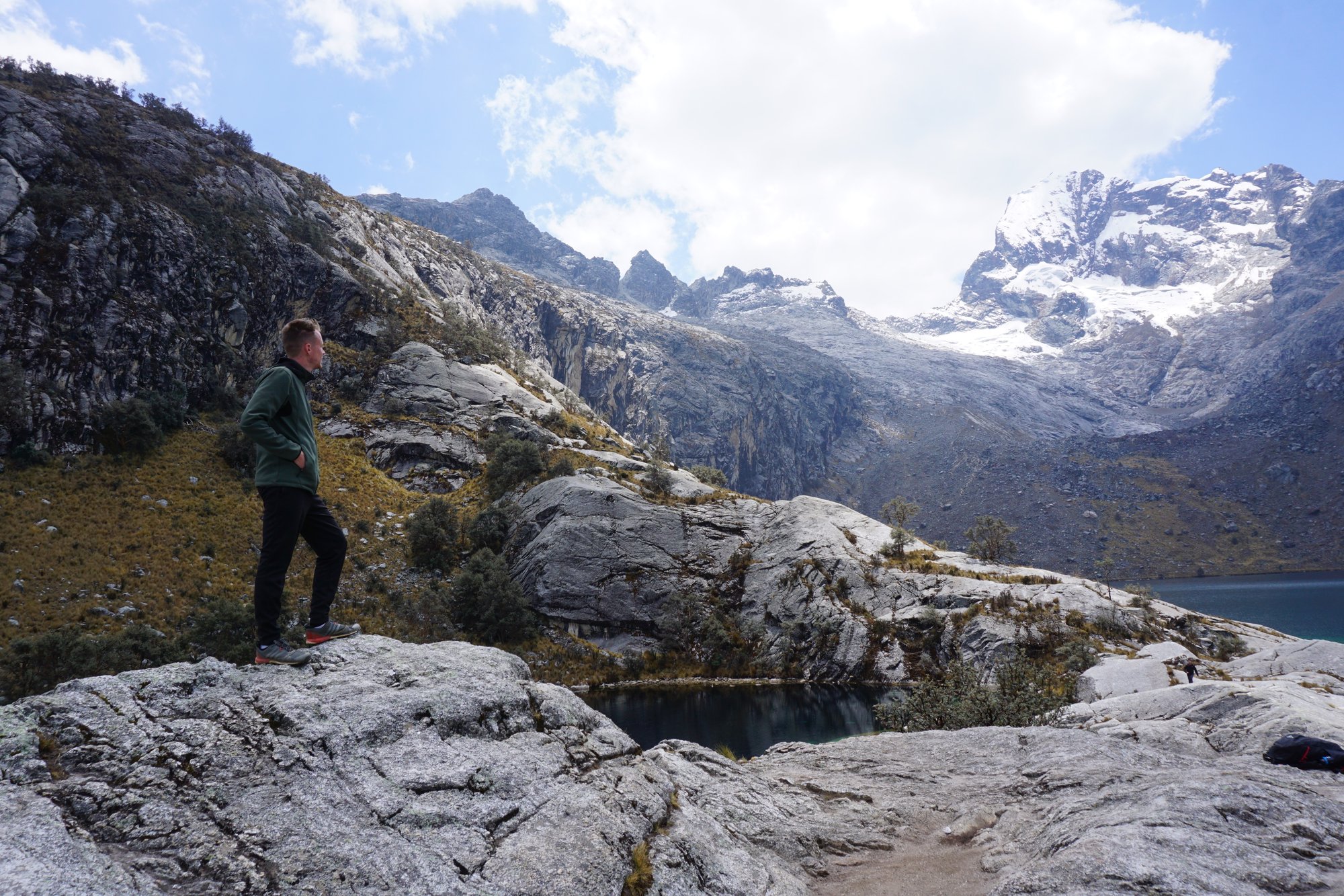 Na tientallen foto's en het vliegen met onze drone tot hij op is, is het dan toch tijd om terug te gaan lopen. De collectivo zou namelijk wachten om ons en wat andere hikers terug te brengen naar Huaraz. Veel meer vervoersopties terug zijn er niet, dus we mogen de collectivo niet missen. Je kunt dezelfde weg terug als je heen gelopen bent, maar wij kiezen voor een klein gedeelte voor een alternatief. Vanaf het meer lopen we naar een uitzichtpunt en vervolgens loopt dit pad terug naar het 'hoofdpad'. Op deze manier hoef je ook niet via de touwen weer af te dalen. Dat leek me namelijk best ingewikkeld, zeker met mijn evenwichtsgevoel. ;-)