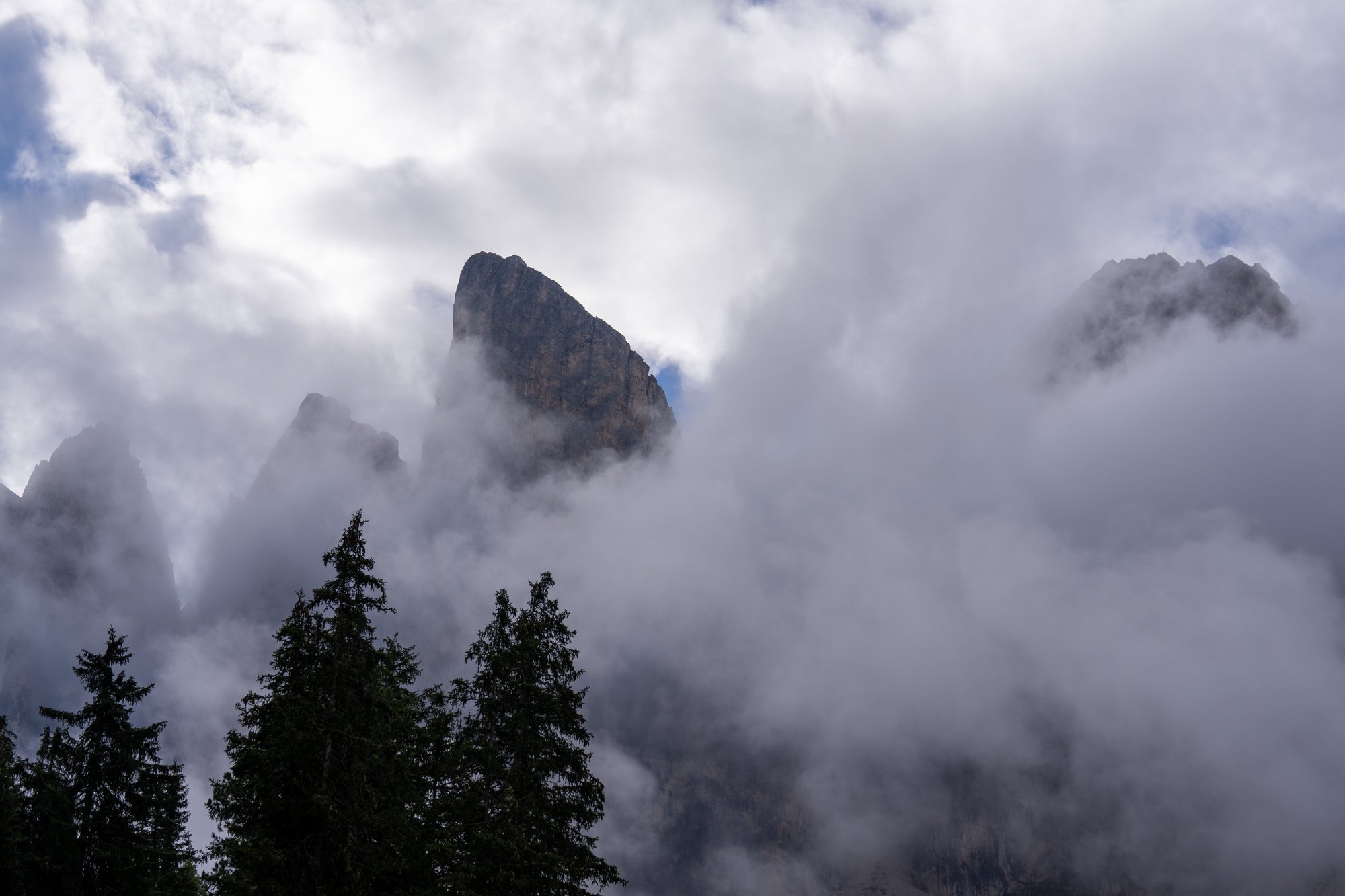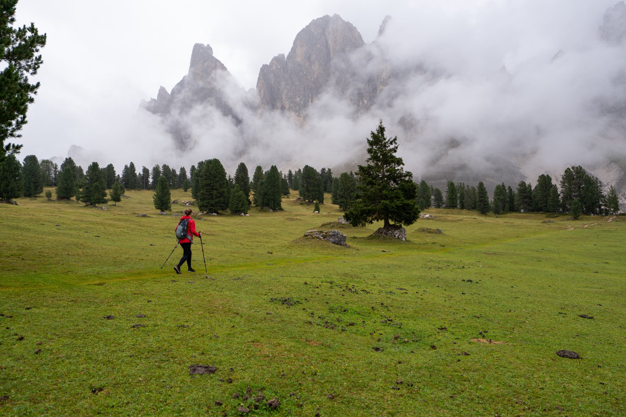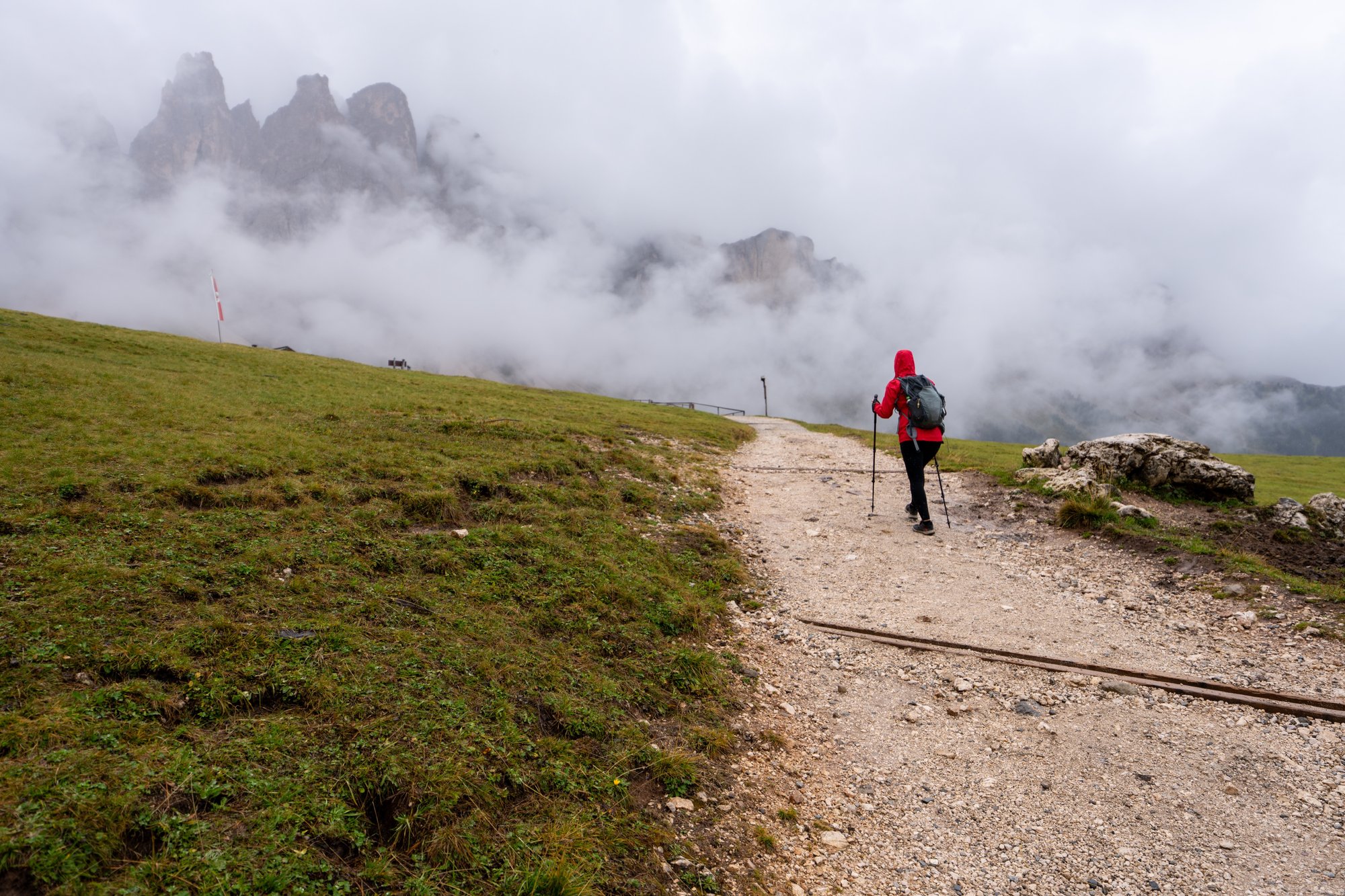 Na een uur lijkt de theateropvoering van de Geisler pieken voorbij. De wolken pakken zich steeds meer samen en het begint ook weer te regenen. We zijn blij met wat we gezien hebben en gaan verder met de hike. De Adolf Munkel Trail moet namelijk nog beginnen!