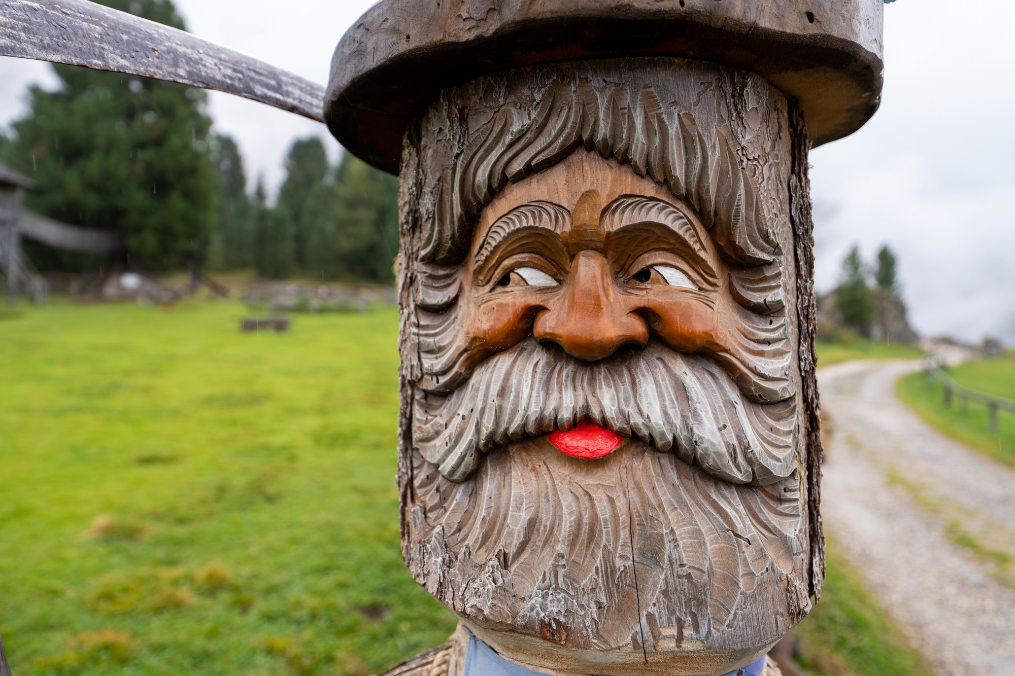 We passeren de nabijgelegen Gschnagenhardt Alm en zetten koers richting de puntige bergpieken van het Puez-Odle Nature Park. We lopen over de grasweides richting het bos met daarachter die grijze bergen. Dit is één van de mooiste delen van de hike. Wauw!