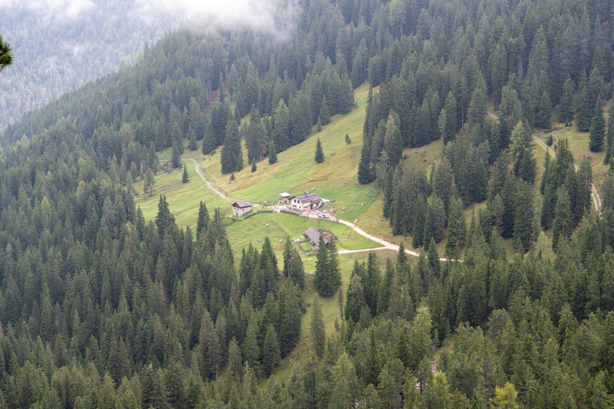 We houden het dit keer niet zo lang vol bij de Geisleralm en wandelen al vrij snel weer terug naar de plek waar we net de Adolf Munkel Trail verlaten hebben. We genieten nog altijd van het landschap. Tegelijkertijd blijft het regenen en vinden we het een paar kilometer later eigenlijk wel mooi geweest. We kiezen ervoor om iets eerder dan gepland de Adolf Munkel Trail te verlaten en lopen via Glatsch Alm terug naar de parkeerplaats. Dit laatste deel van de hike moeten we nog een paar honderd meter afdalen, maar over het brede, niet al te steile grindpad gaat dat eigenlijk heel soepel.