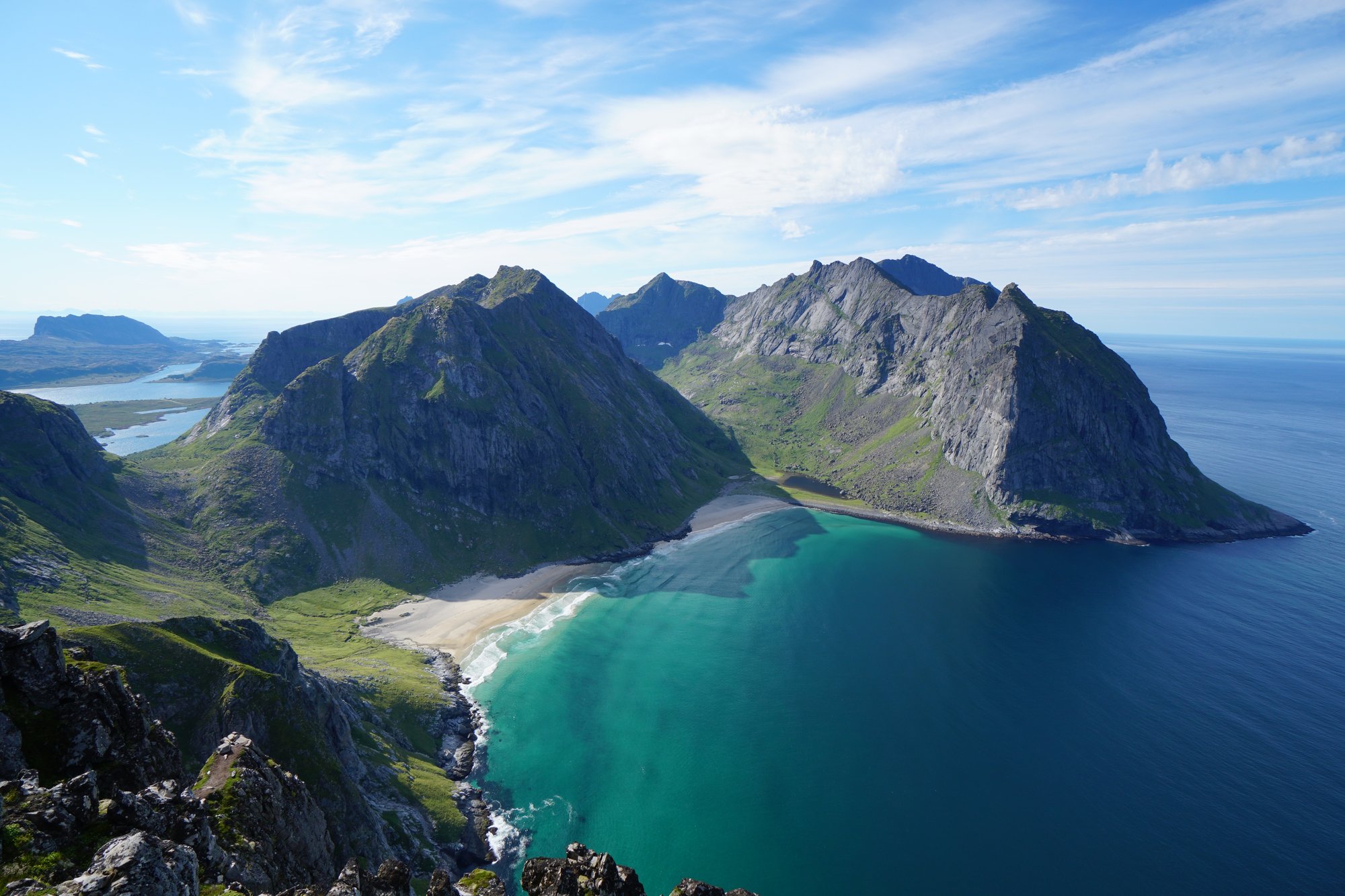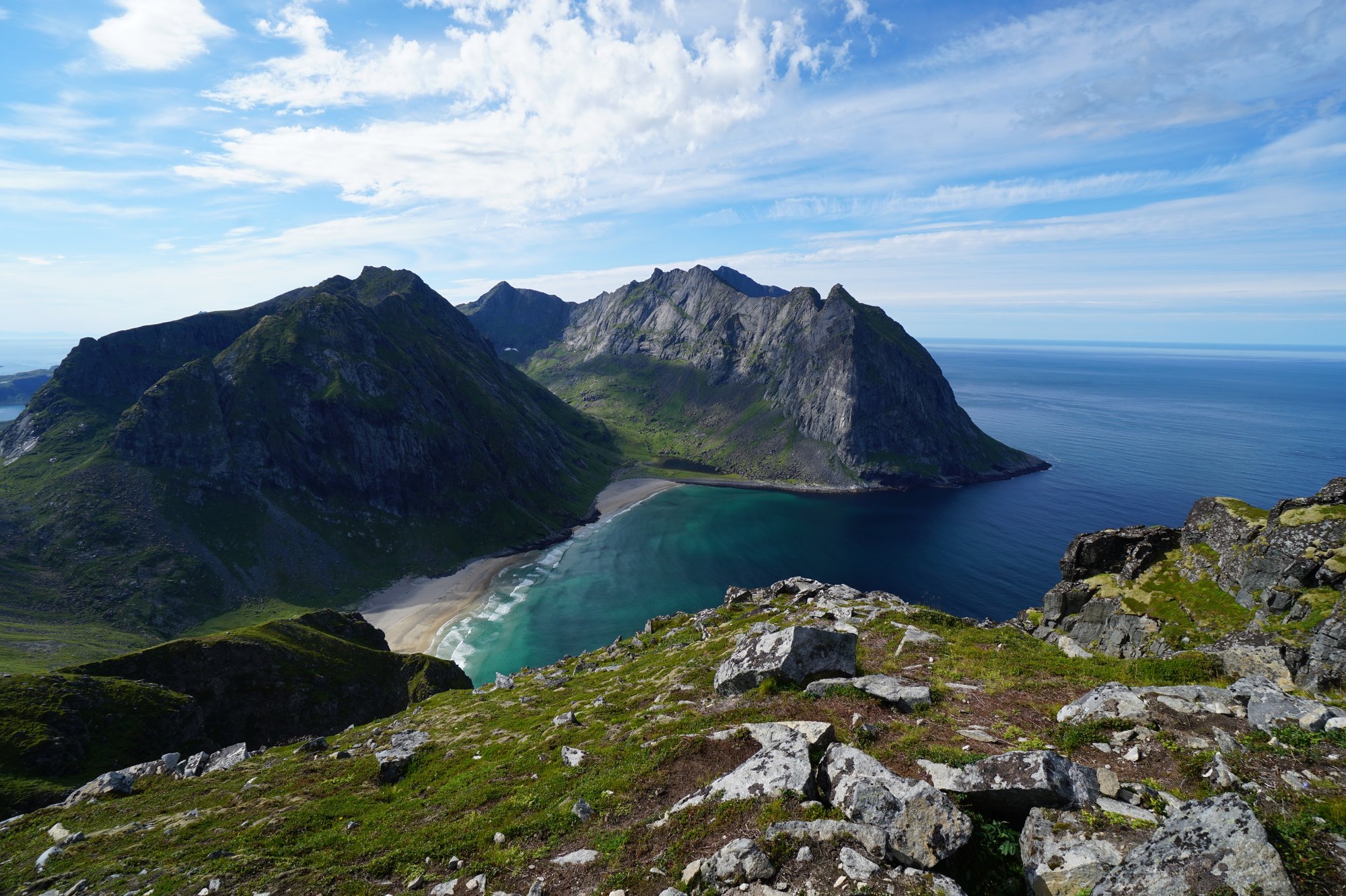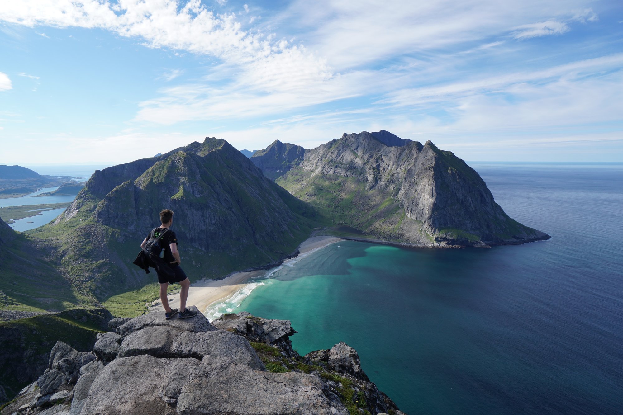 Het totaalplaatje van bergen, het mooi gekleurde water en het witte zandstrand is spectaculair. We blijven er een hele tijd gefascineerd naar kijken en krijgen geen genoeg van dit uitzicht. We kijken naar de tentjes op het strand (wat een topplek om wakker te worden!) en de verte in. Je kunt hier namelijk niet alleen Kvalvika Beach bewonderen, maar hebt ook een super uitzicht over de oneindige zee aan de ene kant en de bergen landinwaarts aan de andere kant. Je komt ogen tekort bij Ryten!