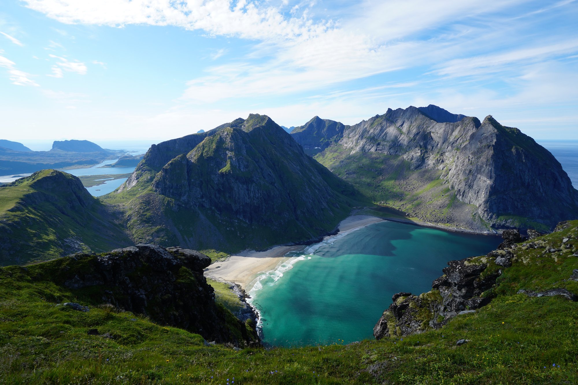 Niet veel later staan we op het uitzichtpunt – in ons eentje! – en zijn we opnieuw omver geblazen door de Lofoten. Het zeewater heeft een oogstrelende turquoise kleur en de golven slaan wild op het strand. Het strand wordt eigenlijk in tweeën gesplitst door de bergen erom heen. Het rechterdeel is daardoor nog onbereikbaarder en ongerepter. Fantastisch!