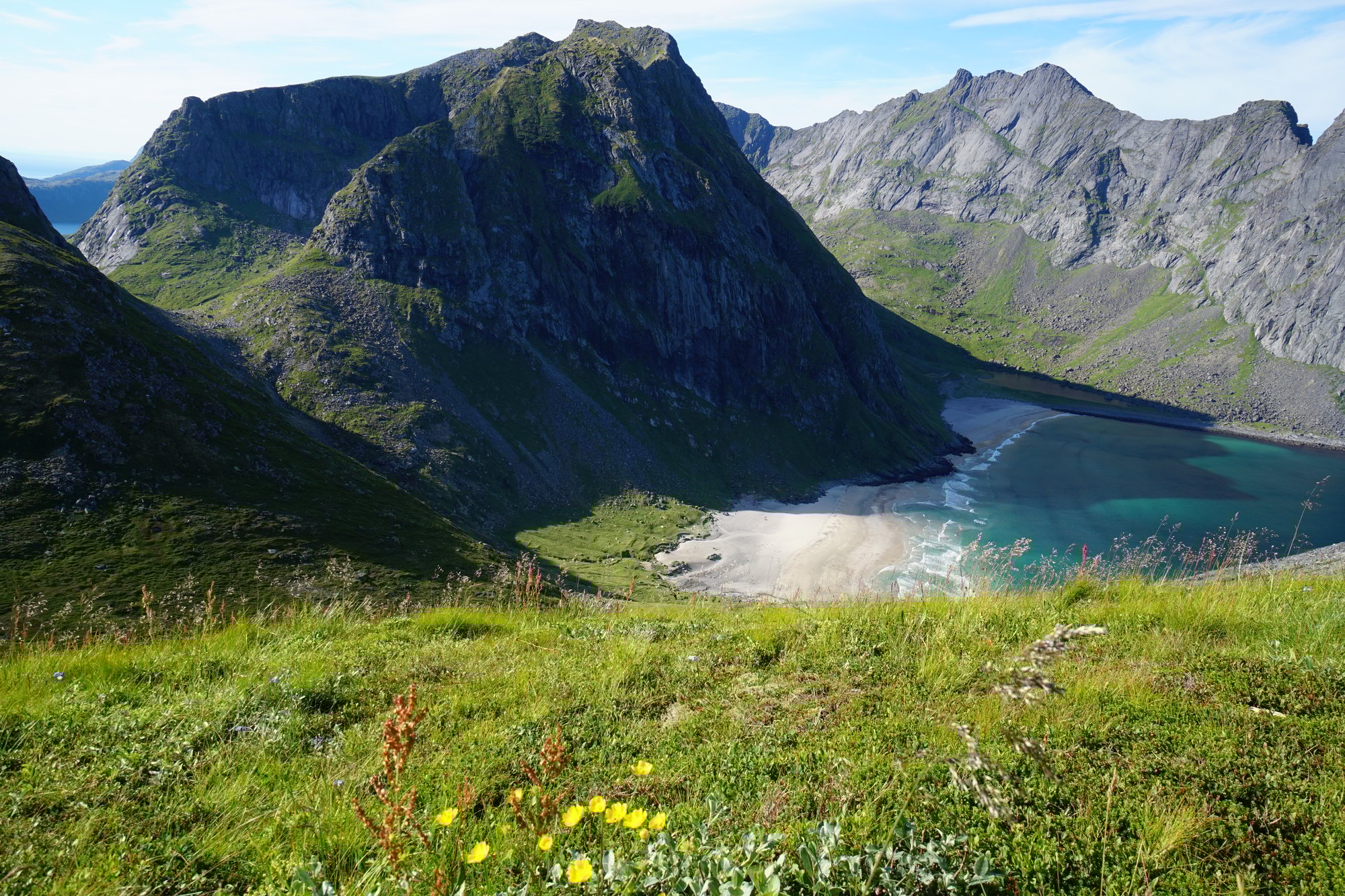 We blijven gestaag stijgen en ondanks dat we rustig aan doen, komt Kvalvika Beach al na een uurtje in zicht. Wauw, dit ziet er goed uit. Maar voor het echte uitzicht op dit schitterende strand moeten we nog wat verder lopen.