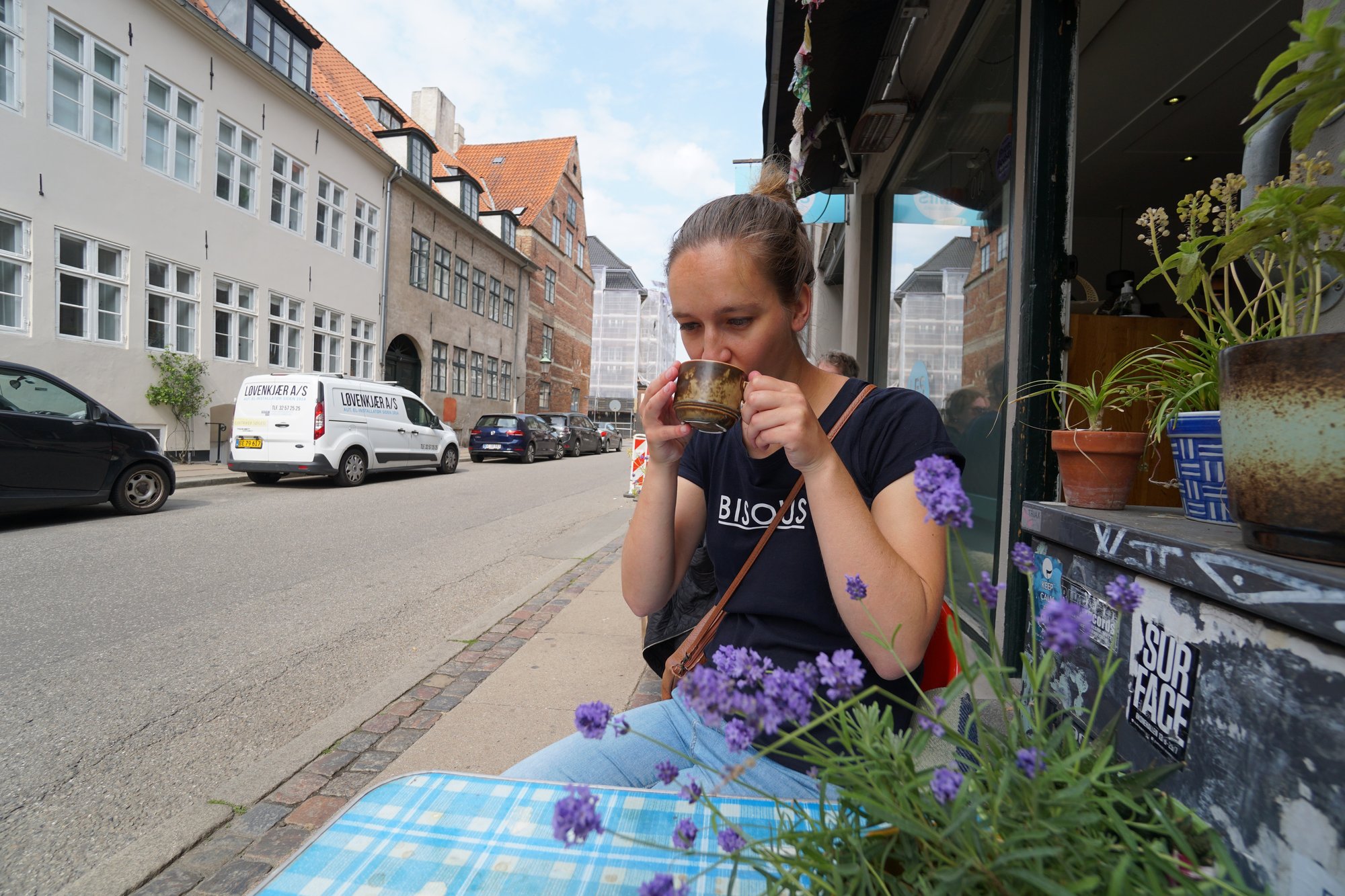 Daarna wandelen we door de straat Strandgade waar het straatbeeld bepaald wordt door karakteristieke en een tikkeltje ruw uitziende pakhuizen. Je bezoekt Kopenhagen ook voor de leuke horeca, dus wij vinden het wel tijd voor een eerste stop. Een bakje koffie bij Les Amis. Was lekker, en duur. ;-)