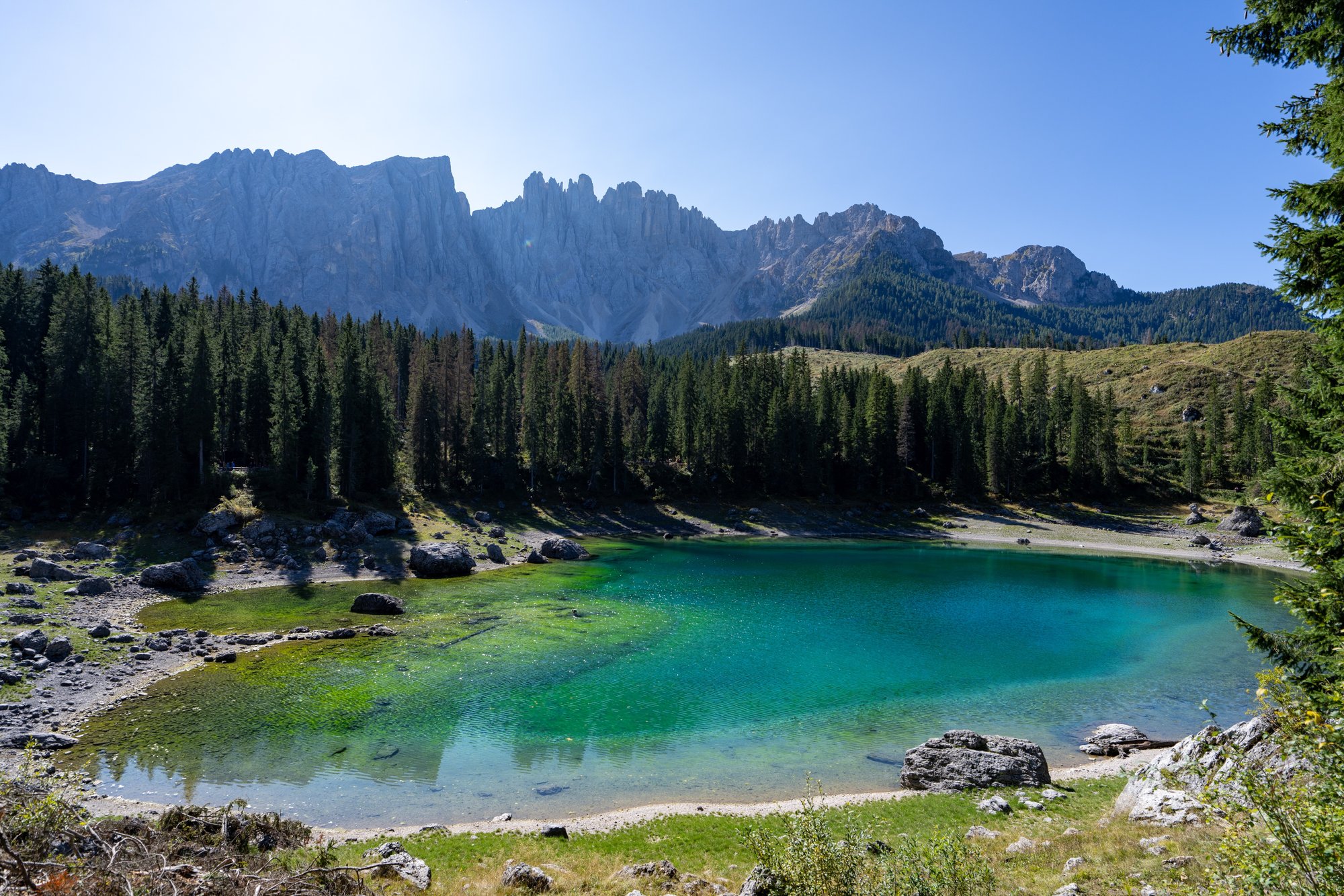 De Dolomieten hebben niet veel bergmeren en veel mensen komen daarom samen bij de drie bekendste: Lago di Braies, Lago di Carezza en Lago di Sorapis. Lago di Carezza ligt - net als Lago di Braies - direct aan de weg en wordt daarom veel bezocht. Helaas heeft er bij Lago di Carezza in 2018 een flinke storm gewoed waarbij onwijs veel bomen zijn gesneuveld. Wij vonden Lago di Carezza daardoor visueel een stuk minder aantrekkelijk, want er zijn overal kale plekken rondom het meer.
