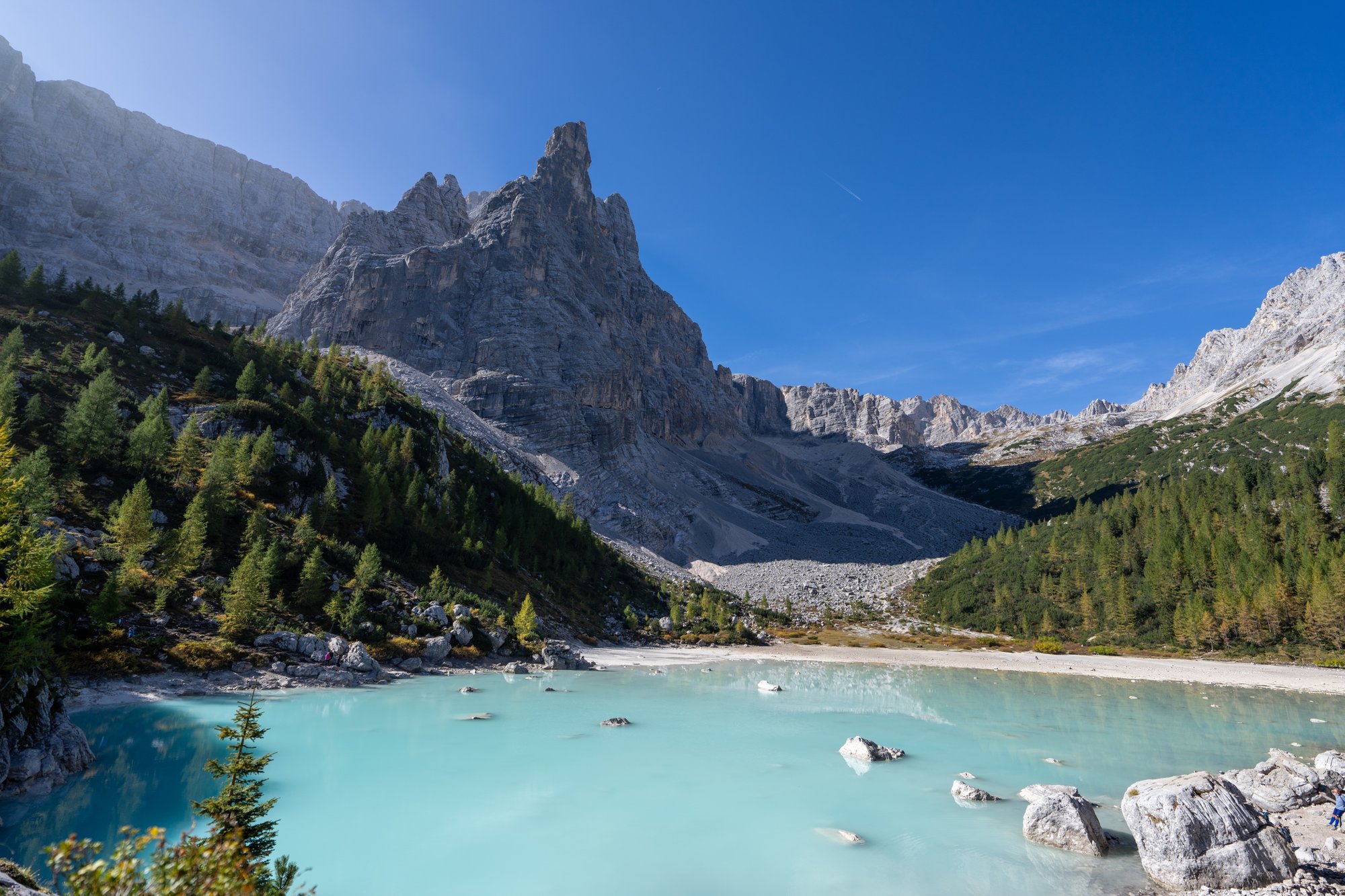 Als je het niet erg vindt om een stukje te hiken, kies dan voor Lago di Sorapis. Dit babyblauwe meer ligt verstopt tussen de bergen en is enkel te voet bereikbaar. Het is alsnog een populaire plek met veel andere mensen, maar door de kleur van het water, de bossen en de grillige rotsen is het absoluut een mooie plek.