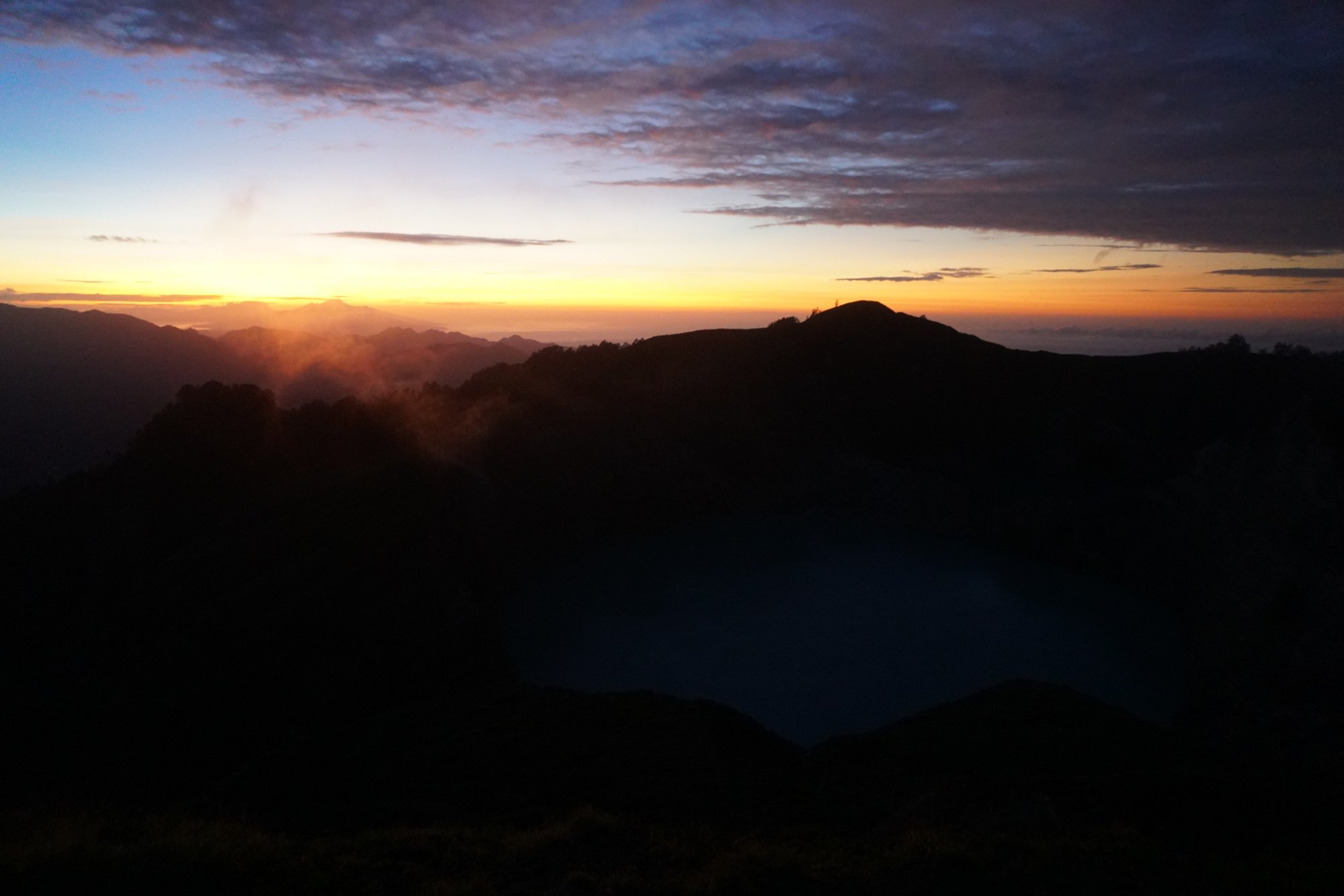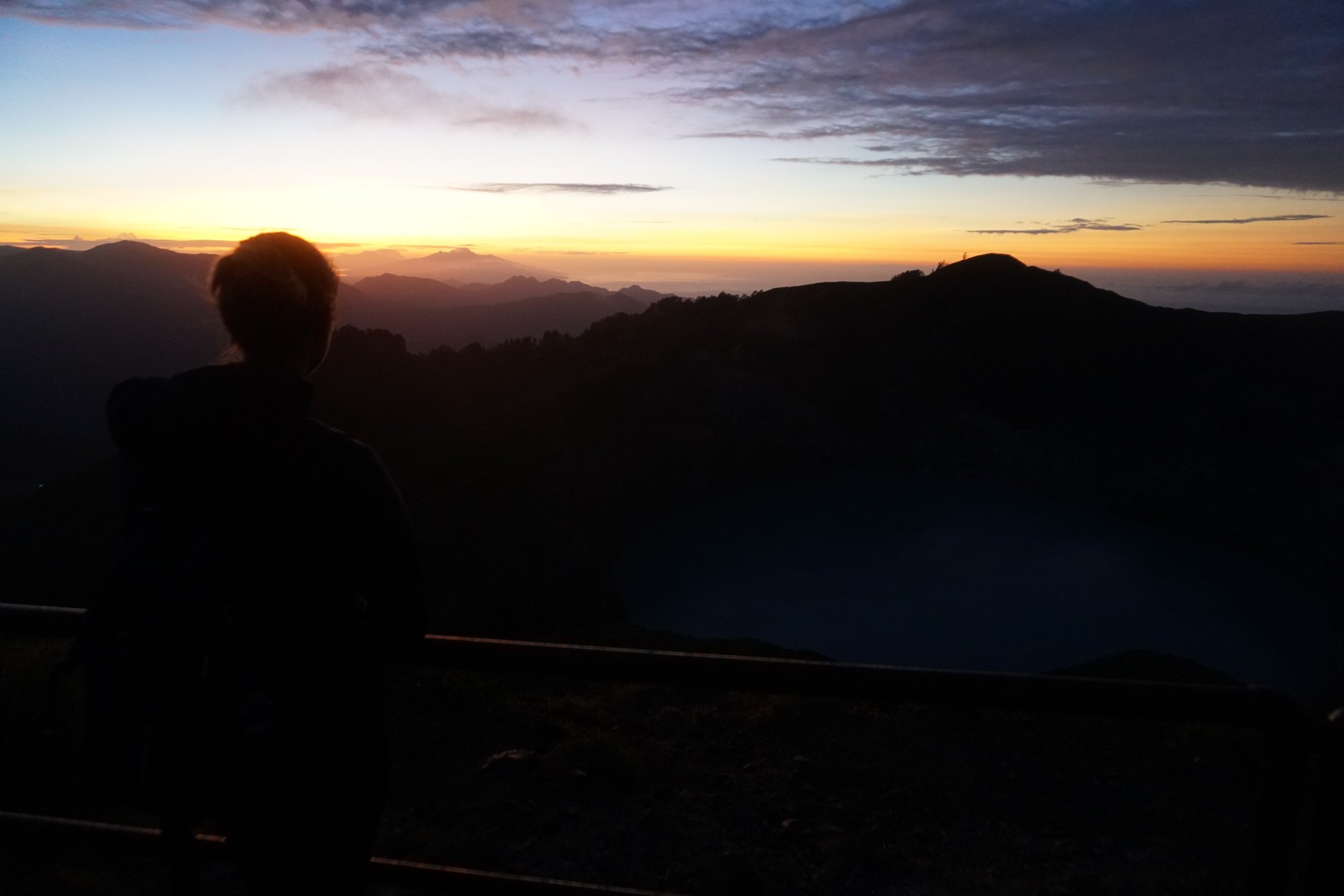 Al die verschillende kleuren in de lucht, de silhouetten van de bergen om ons heen en het blauwe kratermeer vlak voor ons maken deze zonsopkomst magisch mooi. Kippenvel momentje hoor! Of kwam dat toch door die stevige, koude wind? ;-)