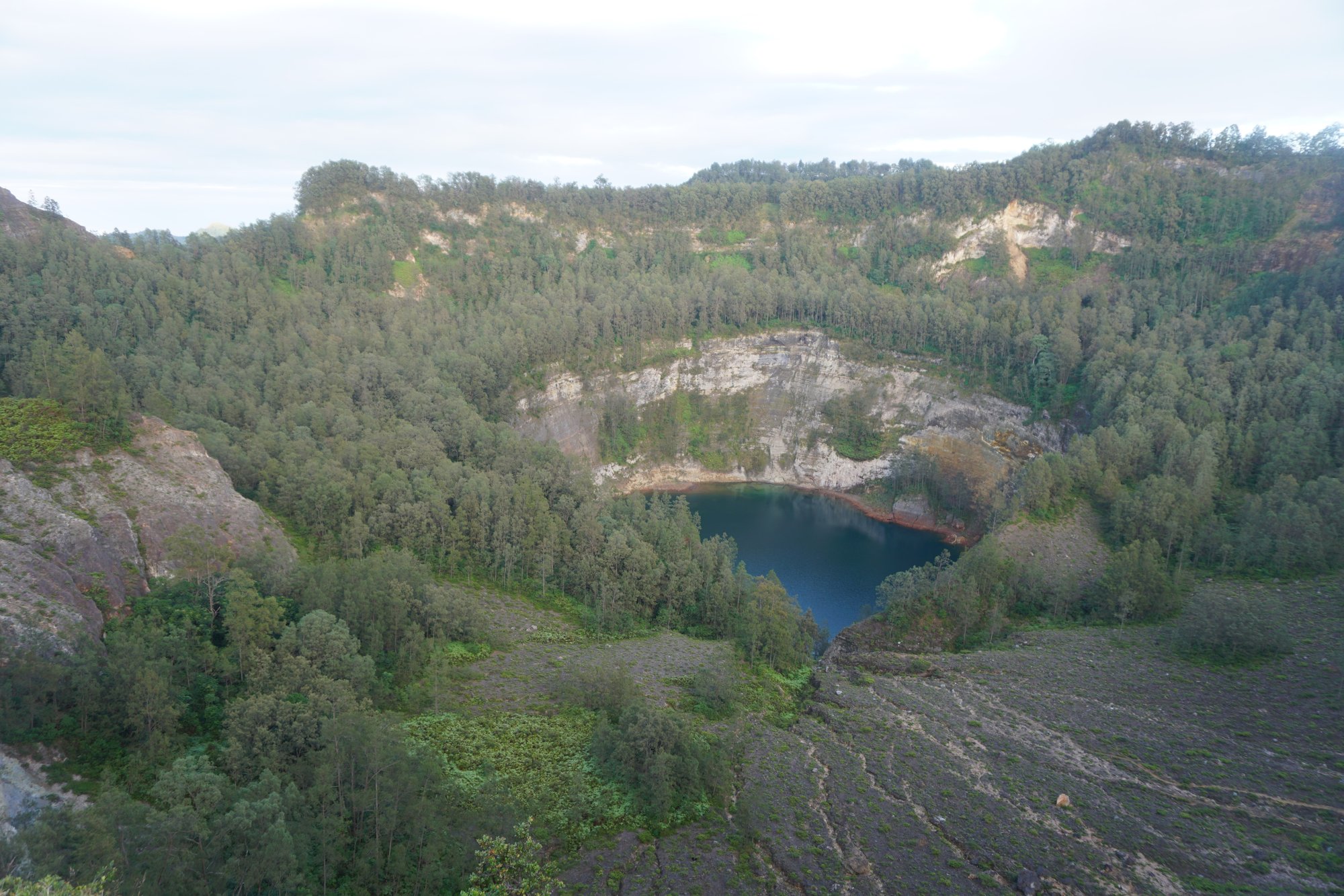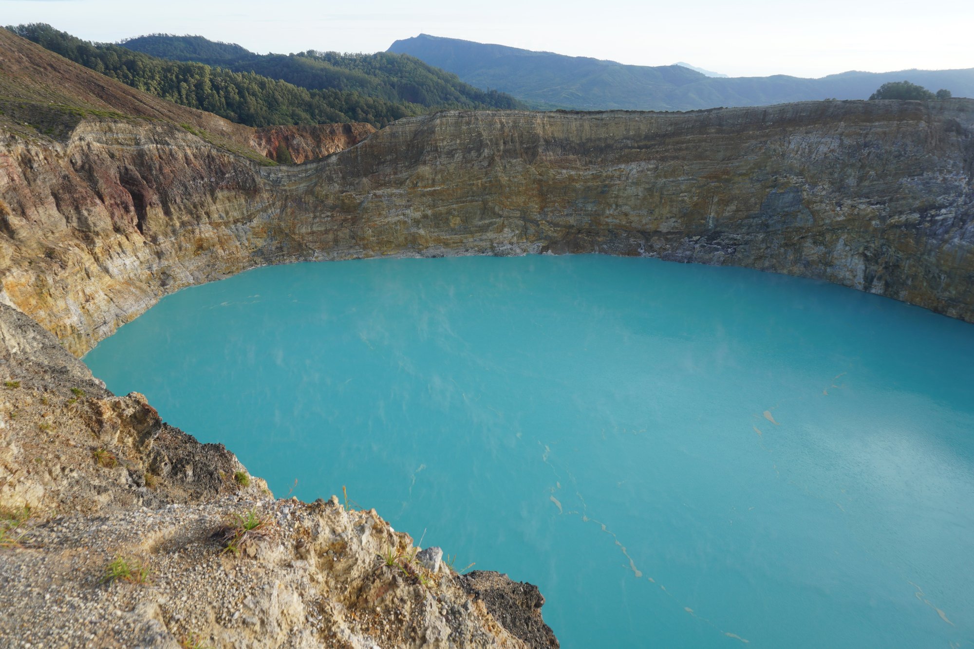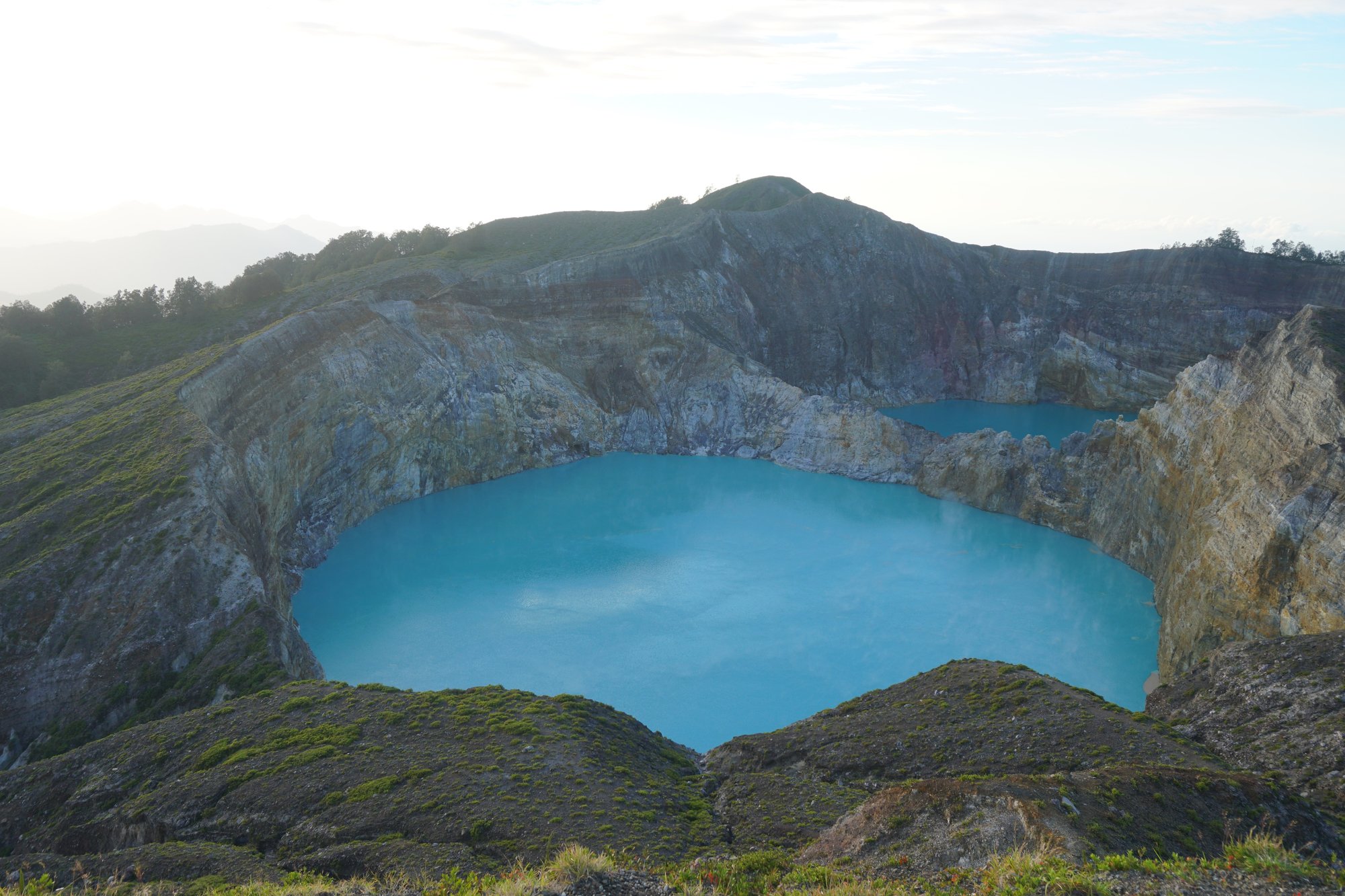 Iedere minuut veranderen de kleuren in de lucht. Het is een schitterend schouwspel! Als de zon eenmaal op is, zien we dat de kratermeren ook in het gewone daglicht onwijs mooi zijn. Het water is super blauw en steekt fel af tegen de grijzige rotswanden.