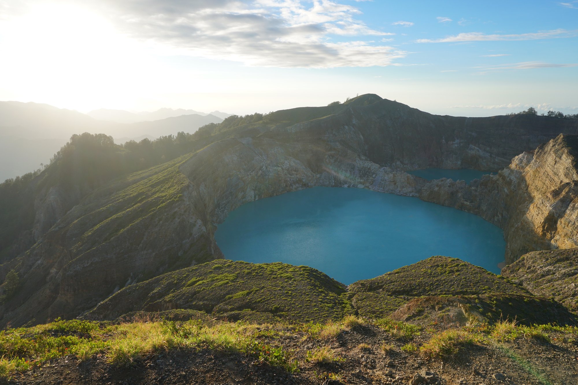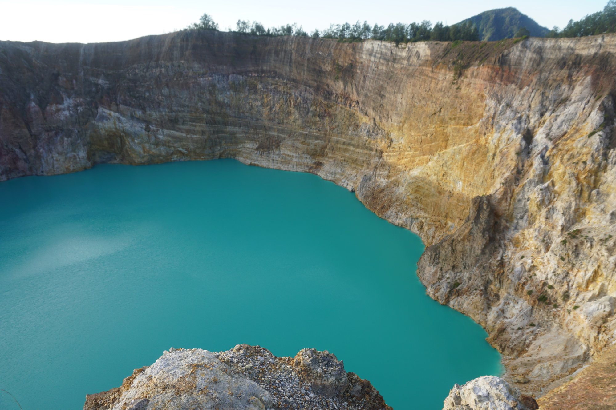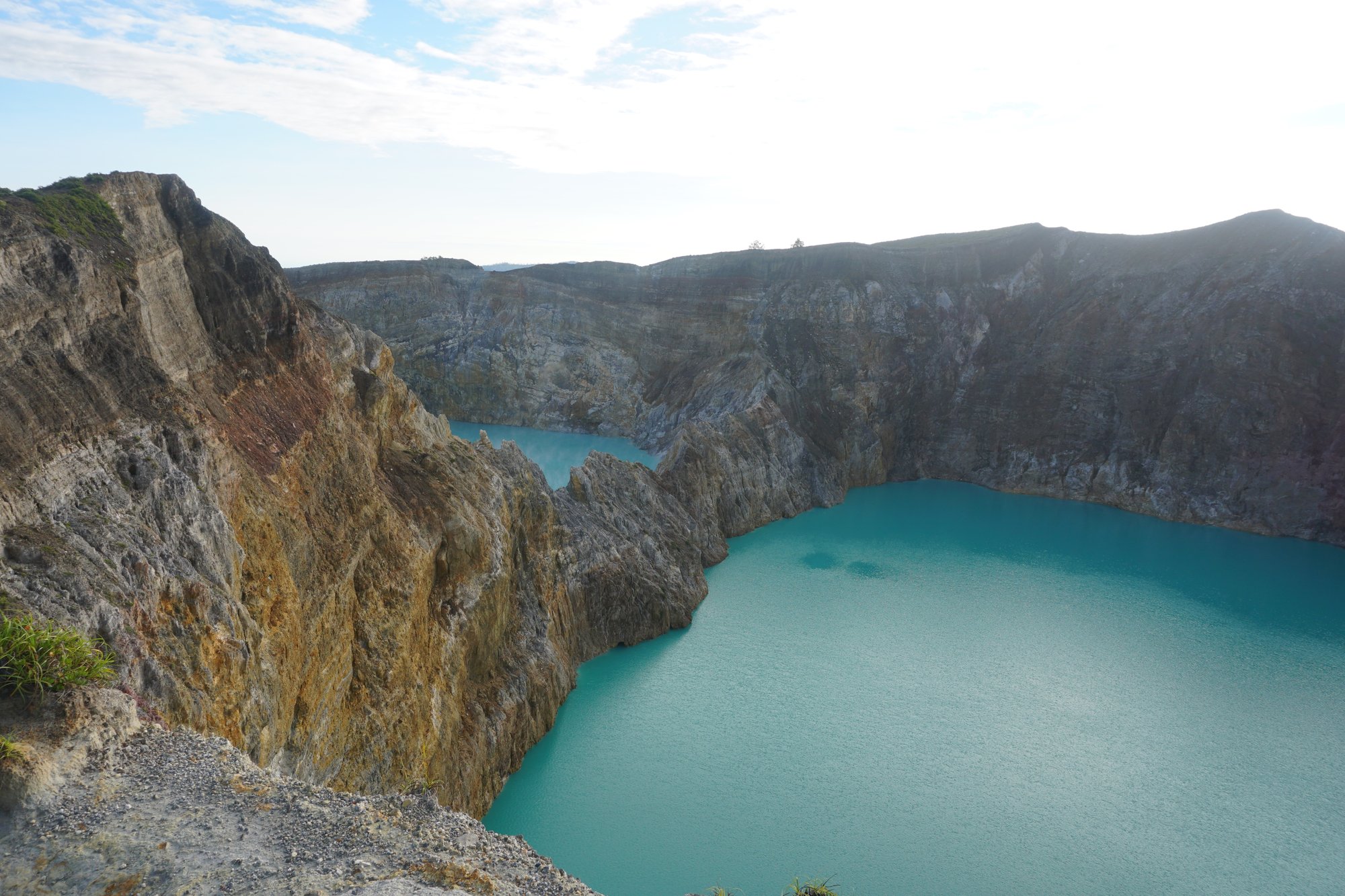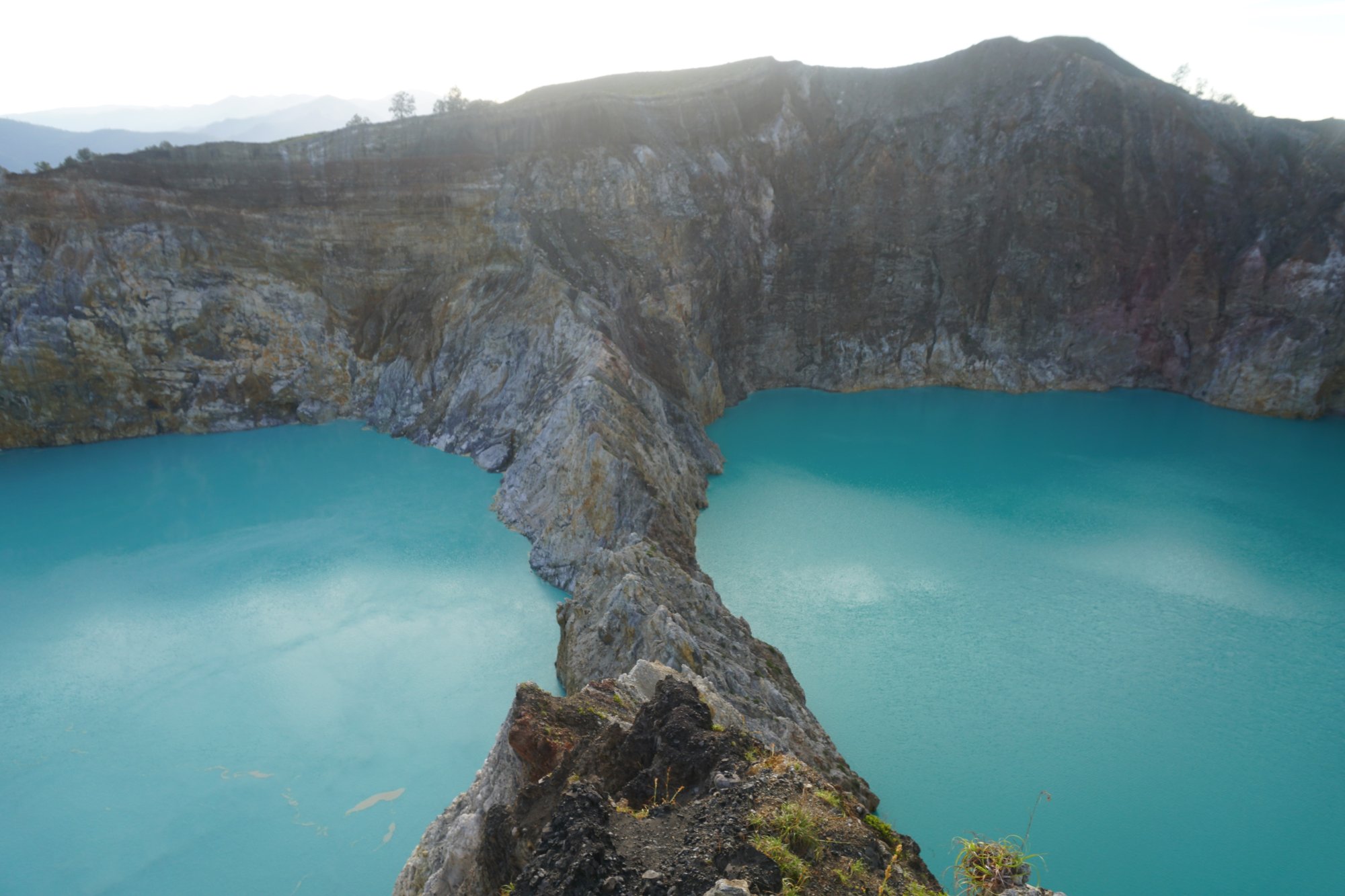 Na de zonsopkomst wandelen we naar wat andere uitkijkpunten om ook de andere kratermeren wat beter te kunnen zien. Bij ons is de kleur van de twee kratermeren die bijna tegen elkaar aan liggen vrijwel gelijk, maar soms kan hier dus wel een groot verschil in zitten. Het derde kratermeer heeft op dit moment niet zo'n spetterende kleur, dus daar zijn we vrij snel uitgekeken. Maar de kleur van de andere twee kratermeren compenseert dat ruimschoots. :-)