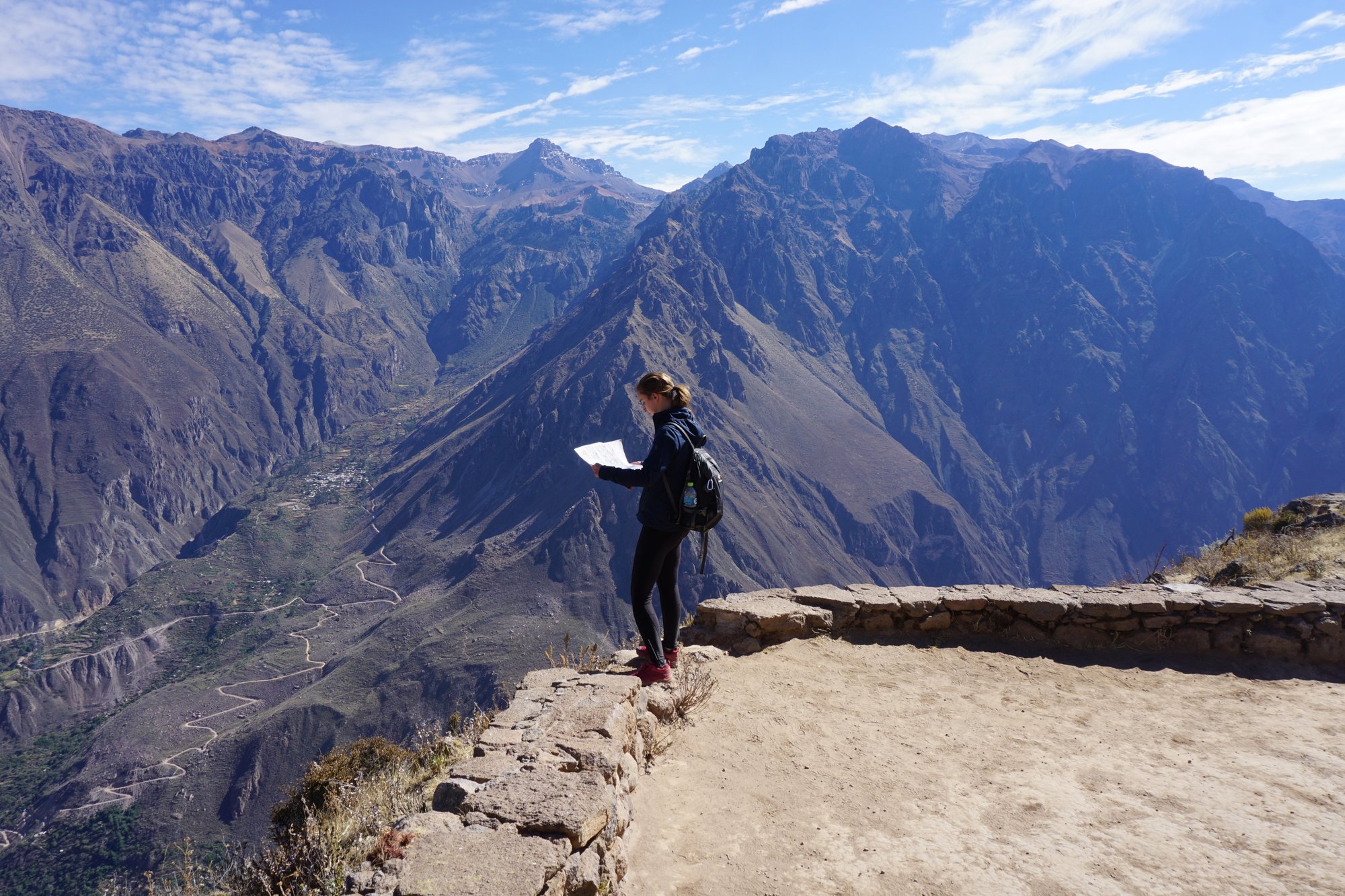 - Hoewel je misschien vroeg in de ochtend in Cabanaconde nog met je dikke trui en een jas aan loopt, zul je het in de Colca Canyon al snel warm krijgen! Tijdens de hikes heb je vrijwel nergens schaduw en doordat je in de kloof een stuk lager zit (meeste dorpen in de Colca Canyon liggen op 2.000 meter boven zeeniveau) is de temperatuur veel hoger dan aan de rand van de kloof. Kleding in laagjes is het beste advies. ;-)