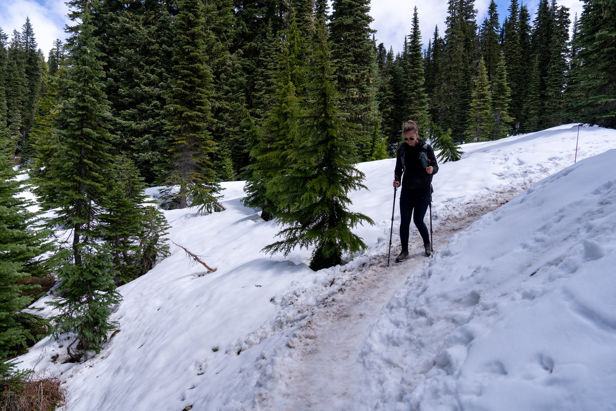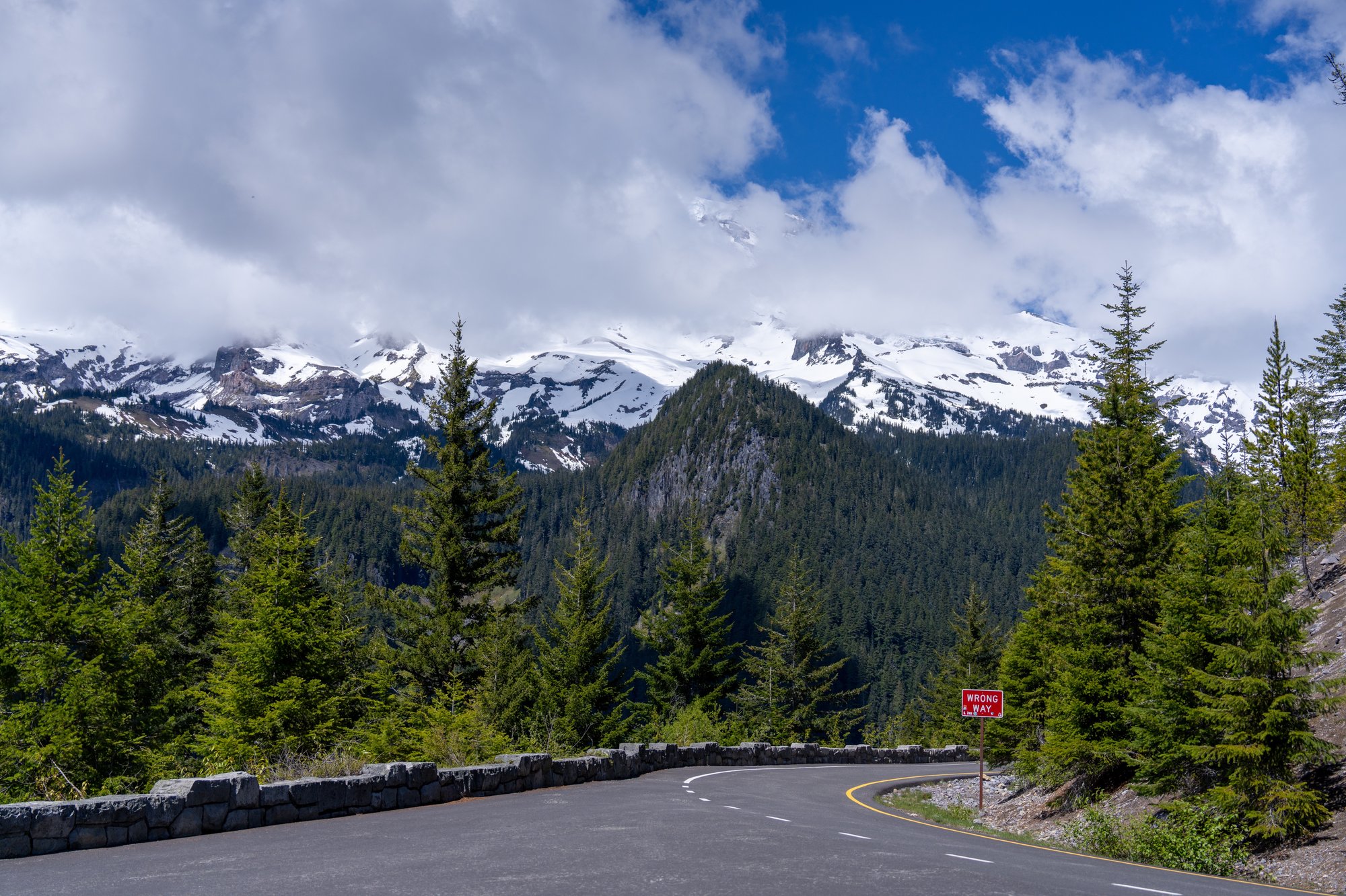 Niet alleen wegen zijn gesloten, maar ook veel wandelingen zijn nog onbegaanbaar door de sneeuw. Tenzij je een ervaren hiker bent in winterse omstandigheden, is wandelen in Mount Rainier National Park half juni echt nog niet te doen. Wegwijsbordjes zijn ondergesneeuwd en dus onzichtbaar en zelf navigeren door een landschap vol sneeuw (en dus zonder te weten wat er onder je zit) is best tricky als je niet weet wat je doet. We moeten onze verwachtingen bijstellen: het wordt een bliksembezoek aan Mount Rainier voor een eerste indruk.