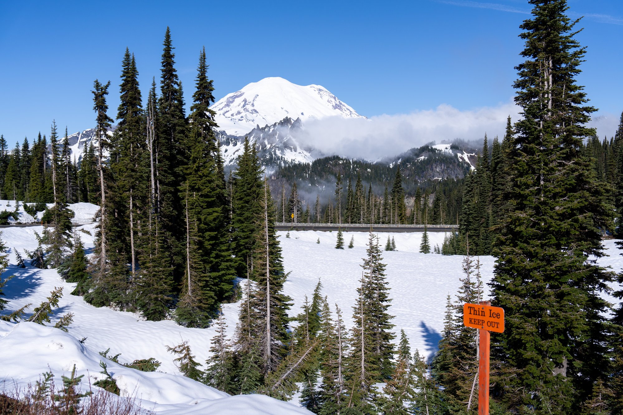 Nadat we het hoogste punt zijn gepasseerd, komen we bij Tipsoo Lake. Je moet goed opletten om het meer te zien, want deze ligt verstopt onder een dik pak sneeuw. We hadden dit niet helemaal verwacht, want zo hoog ligt het Tipsoo Lake nou ook weer niet. Maar we leren al snel: in Mount Rainier National Park ligt veel sneeuw en het blijft erg lang liggen. Meer dan een snelle fotostop zit er daarom niet in, we gaan door naar de Paradise zone!