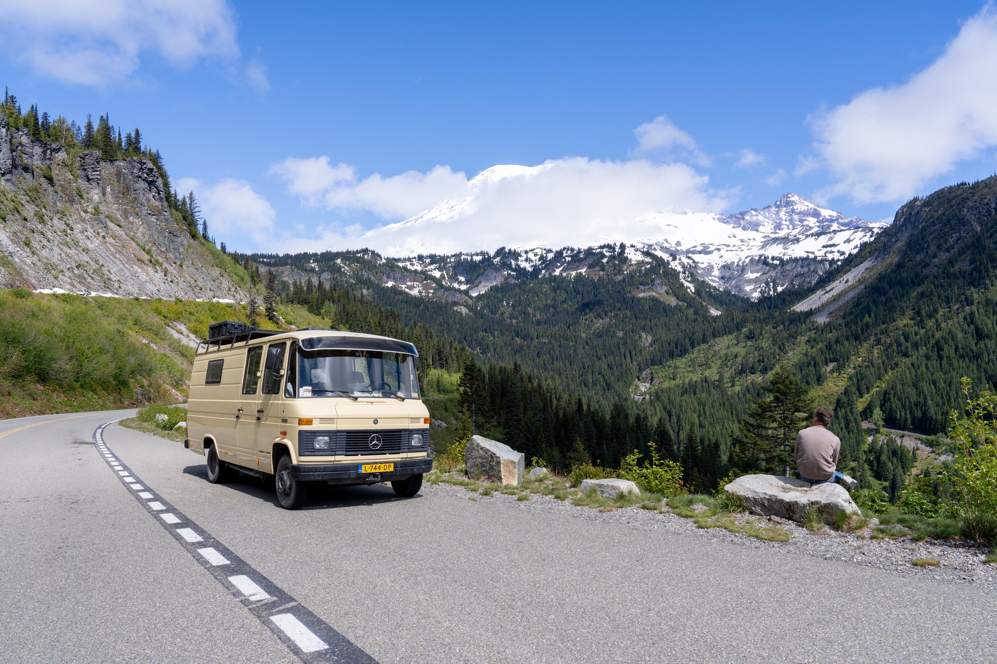 Wij rijden aan de oostkant Mount Rainier National Park binnen. Nog voordat we ons binnen de parkgrenzen bevinden, zetten we Bruno aan het werk om de Chinook Pass (1.657 meter) over te komen. Op zo’n moment is het helemaal niet erg om langzaam naar boven te tuffen, want zo kunnen we langer naar de bergen om ons heen kijken!