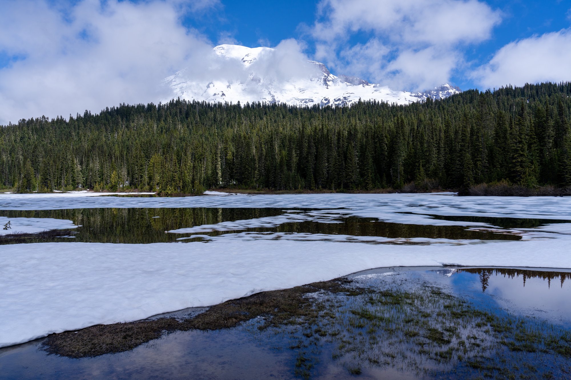 De naam zegt het al: in de Reflection Lakes kun je normaal gesproken de weerspiegeling van Mount Rainier in het water zien. Nu is dat nog niet het geval, want de meren zijn nog grotendeels bedekt door een laag ijs. Toch is het een mooie plek voor een kopje koffie en om nog eens wat langer naar Mount Rainier te staren.