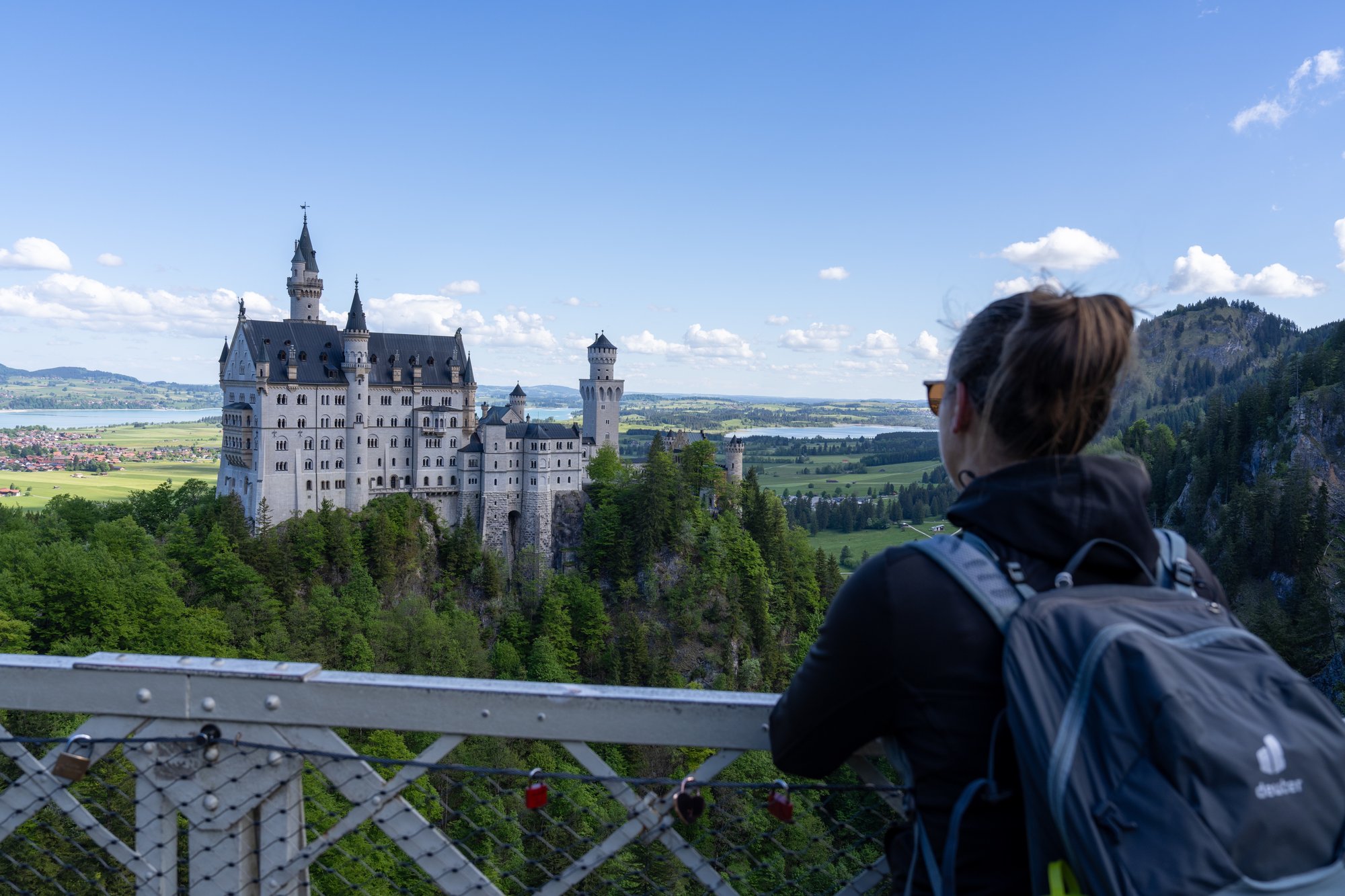 Marienbrücke is dé plek waar de meeste foto’s van het Neuschwanstein kasteel genomen worden. En eerlijk is eerlijk: dat is volkomen terecht. Het uitzicht is iconisch, de hoek perfect en het contrast met het groene landschap en de blauwe meren op de achtergrond maakt het compleet. Ondanks de bekendheid valt de drukte ons trouwens reuze mee. We kunnen rustig genieten en foto’s maken.