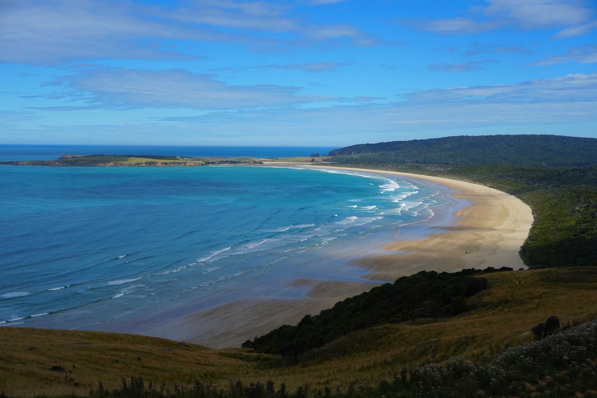 Direct naast Curio Bay ligt Porpoise Bay. Een enorm lange baai met een heerlijk ogend zandstrand. Dat ziet er niet verkeerd uit! Schijnbaar wordt de baai geregeld bezocht door dolfijnen en komen ze behoorlijk dichtbij als je in de zee aan het zwemmen bent. Voor ons zit een poging wagen er helaas niet in, de zee ziet er behoorlijk wild uit. Dat risico nemen we maar niet. ;-)