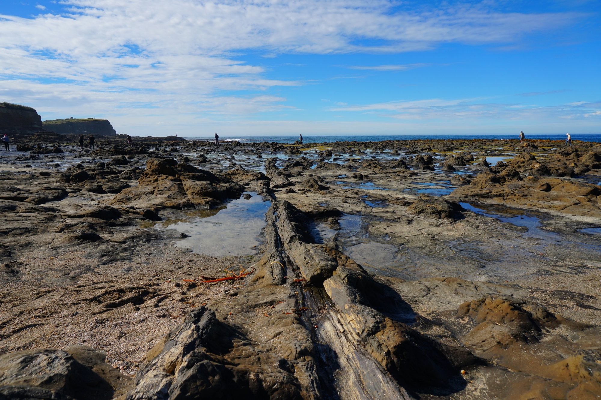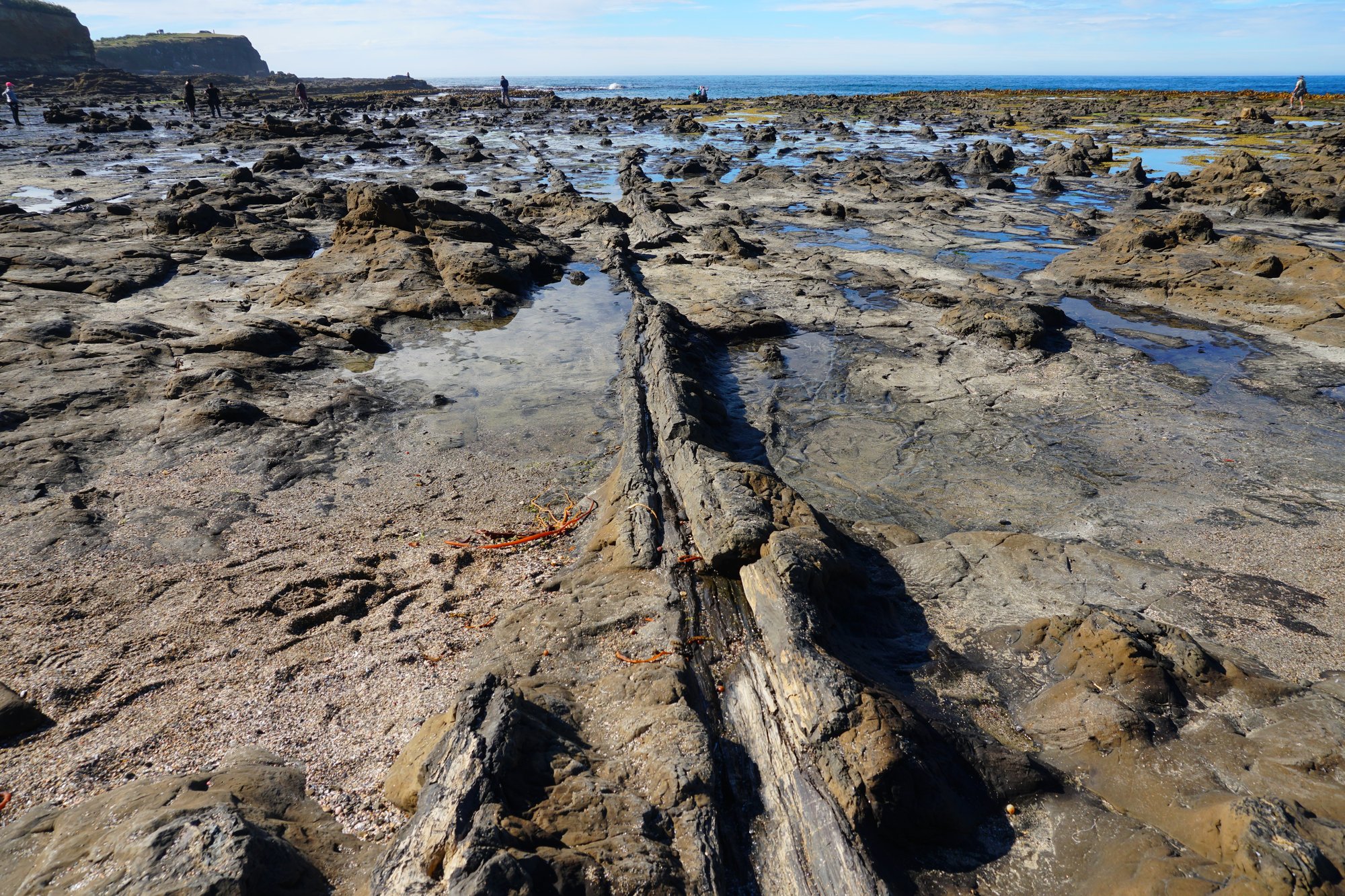 Na nog geen half uur rijden komen we bij onze volgende bestemming: Curio Bay. Het bijzondere van deze baai is dat er op de bodem fossielen van een miljoenen jaar oud bos liggen. En bij eb kun je dit perfect zien! De resten van de boomstammen in de bodem zijn bizar. Zoiets hebben we nooit eerder gezien.