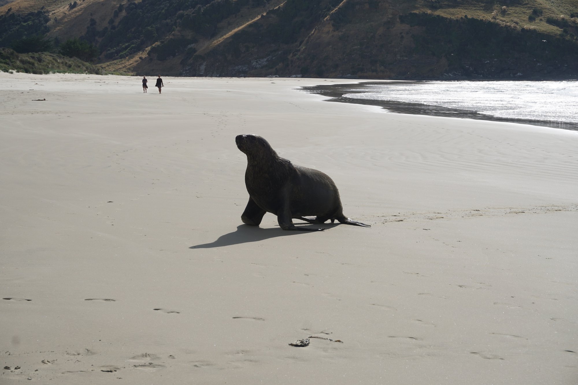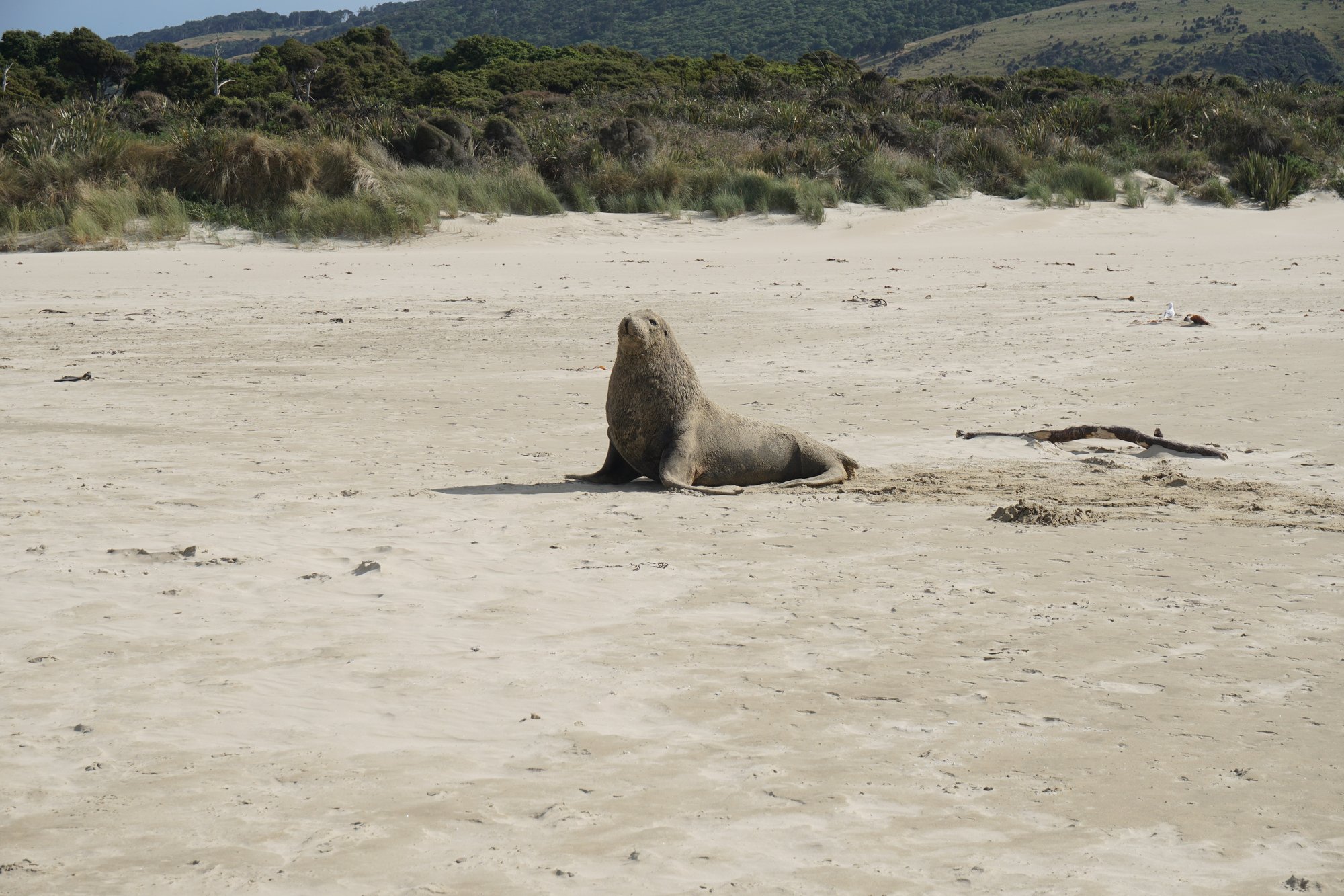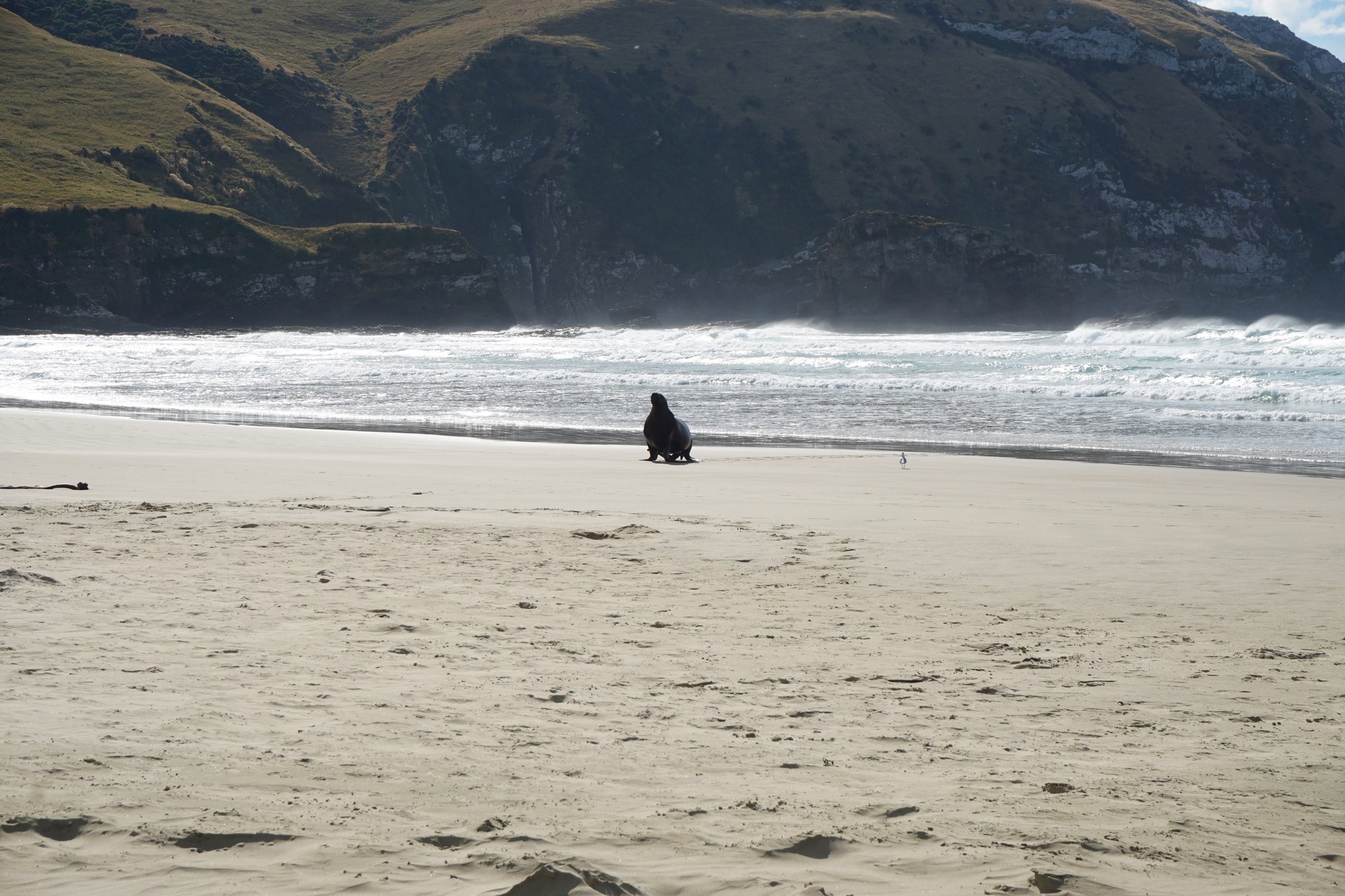 De volgende ochtend rijden we naar Surat Bay. Aan de baai heb je een lang zandstrand en daarom is het een geliefde plek voor zeeleeuwen om te rusten. Wij hopen natuurlijk dat we deze enorme dieren gaan zien! Maar helaas, we lopen zo’n 3 kwartier over het strand, maar geen zeeleeuw te bekennen. Hopelijk hebben we bij de volgende plek meer geluk!