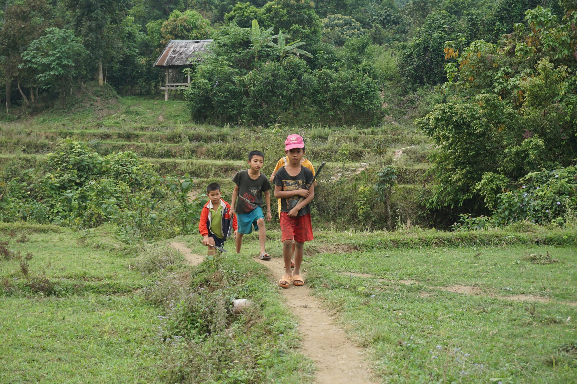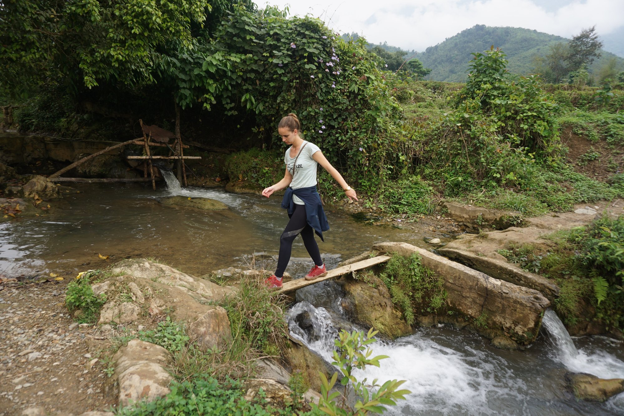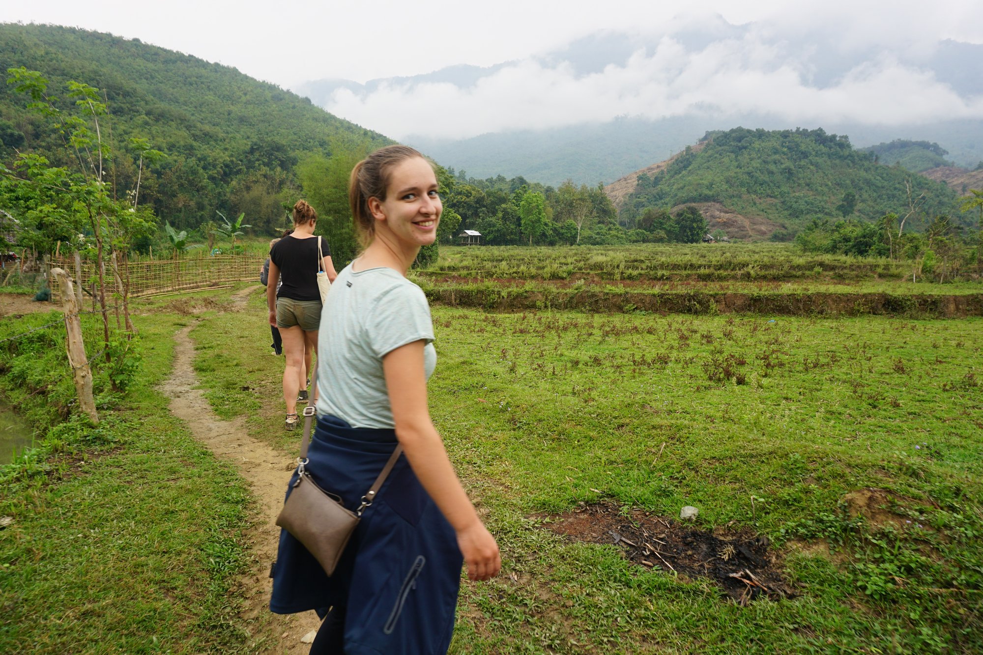 Meerdere mensen uit onze groep hadden een bloedzuiger-beet te pakken. Gelukkig doet het geen pijn en konden we - nadat we elkaar en onze schoenen grondig hadden gecontroleerd op deze rotbeesten - verder met de tour. We varen naar een dorpje in de buurt van Muang Ngoi en eten hier onze lunch die verpakt is in bananenbladeren op. Dan beginnen we aan de trekking naar de waterval. We lopen door groene velden, steken kleine riviertjes over en horen om ons heen niets anders dan geluiden van de natuur. Een mooie wandeltocht met de waterval als beloning. Heel tof!
