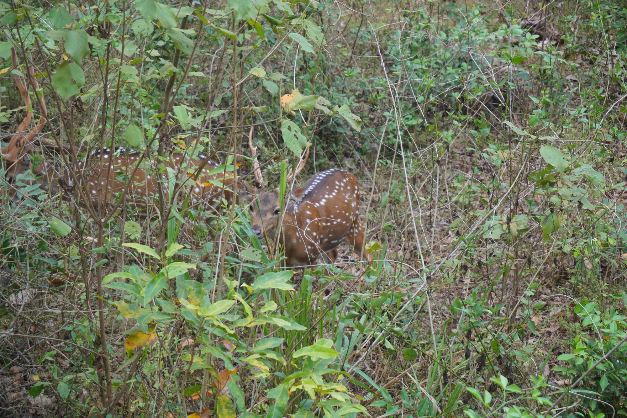 Als de kudde is gepasseerd, rijden we verder het park in. Onderweg zien we herten, aapjes en varanen. En dan ineens staat er vlak langs het pad een grote olifant in zijn eentje. Zodra hij ons ziet, schiet hij achter een boom. Vanaf een veilige afstand blijft hij toch wel naar ons kijken. Een verlegen maar ook nieuwsgierige olifant! ;-)
