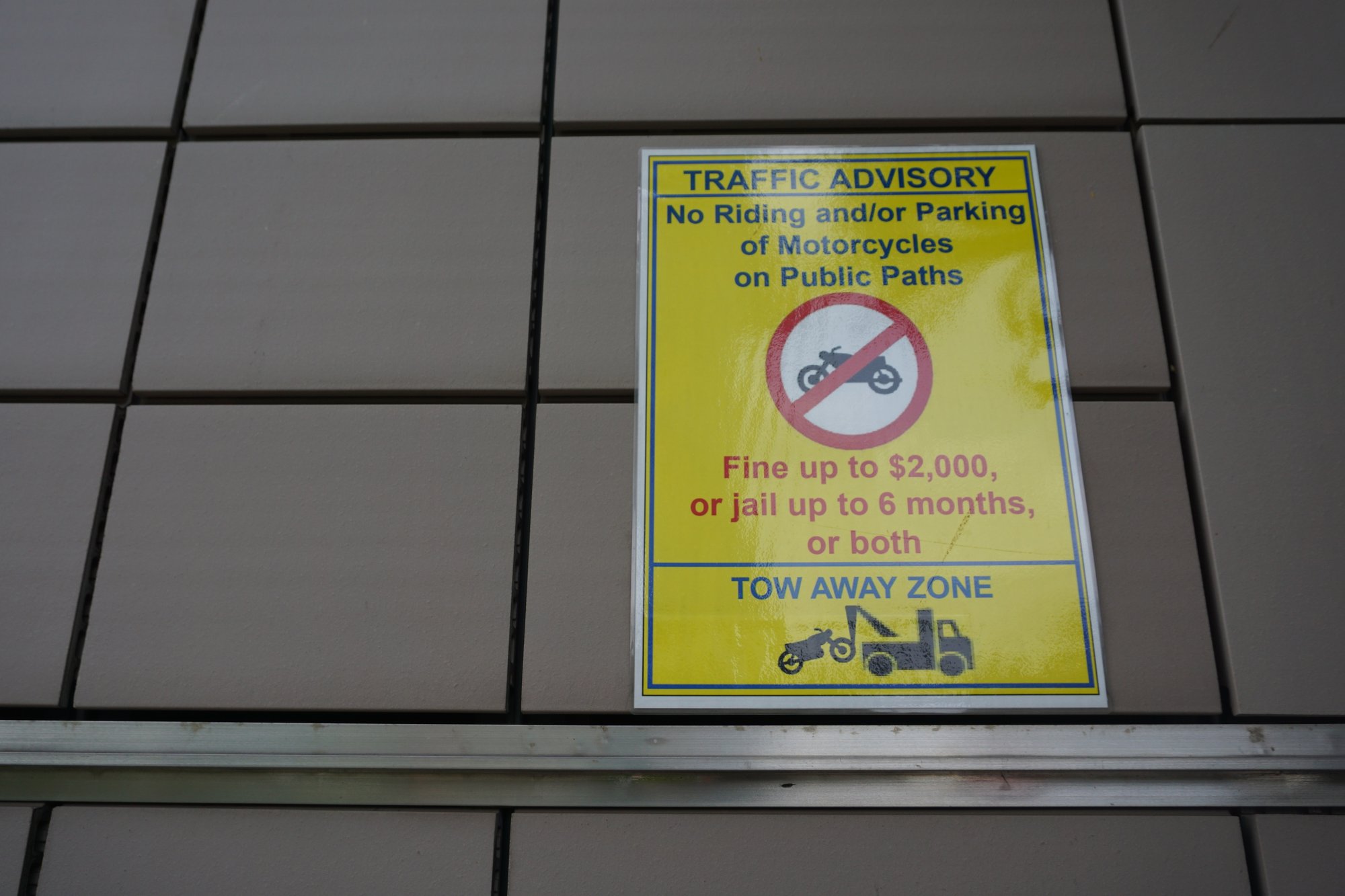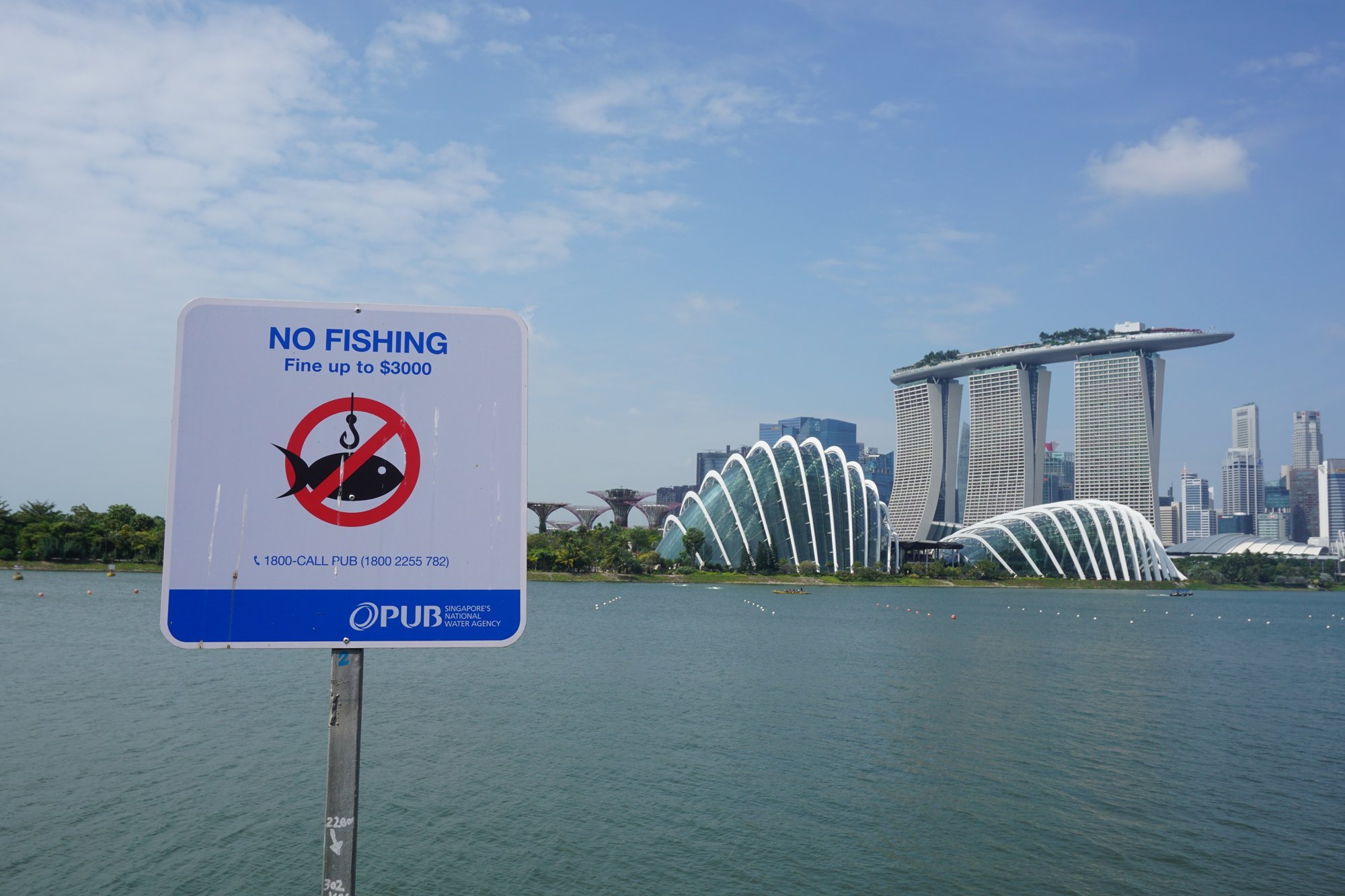 In de dagen erna verkennen we Singapore. Naast de strakke organisatie van eigenlijk alles in dit land, valt ons nog iets op. Constant zie je bordjes met dingen die niet mogen. Plus de straf die ervoor geldt als je het wel doet. In de metro mag je niet aan de noodrem trekken (straf: boete van duizenden euro's), op diverse plekken mag je niet vissen (straf: boete van duizenden euro's), je mag niet met je motor over het voetpad rijden (straf: boete en/of 6 maanden gevangenis).