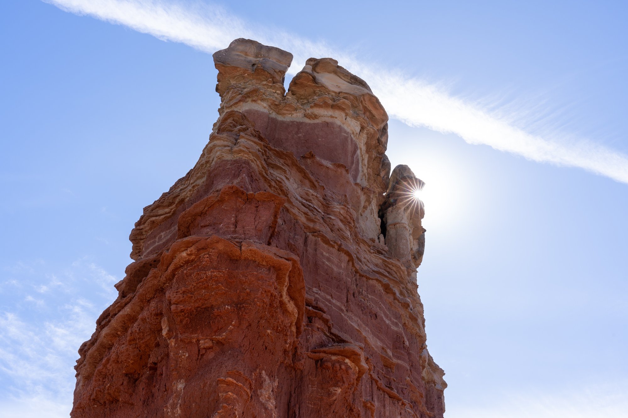 Op de heenweg leiden we onszelf af van de hitte door goed om ons heen te kijken. Alle vormen en kleuren in de rotsen zijn tof om te zien. De bruinrode kleuren domineren het landschap, maar als je goed kijkt, dan zie je ook wit, geel, paars en groen. Na een uur hiken zien we de Lighthouse voor ons verschijnen. Dit is natuurlijk geen echte vuurtoren (er is hier immers weinig water te bekennen!), maar een bijzondere rotsformatie die direct opvalt in het landschap. Om bij de Lighthouse te komen, moeten we het laatste stukje even wat steiler klimmen. Gelukkig groeien daar wel wat bomen en hebben we dus eindelijk een beetje schaduw. Precies op het juiste moment, zo tijdens de klim!