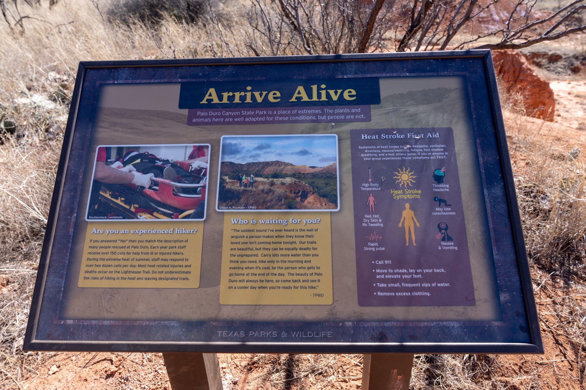 Het is eind februari, maar de zomer is al begonnen in Texas. Het is vandaag uitzonderlijk warm voor de tijd van het jaar: 28 graden. In de schaduw. Dat maakt een relatief simpele hike zoals de Lighthouse Trail ineens andere koek. Althans, daar komen wij al snel achter. In het begin doen we nog een beetje lacherig over de vele waarschuwingsborden aan het begin van de hike. Veel mensen krijgen tijdens deze hike blijkbaar problemen door oververhitting / een zonnesteek. In de zomermaanden moeten er gemiddeld 24 mensen per dag gered worden op dit pad! Er wordt geadviseerd om bijna 1 liter water per persoon per mijl mee te nemen. De Lighthouse Trail is in totaal bijna 6 mijl, dus dat zou wel erg sjouwen worden met water!
