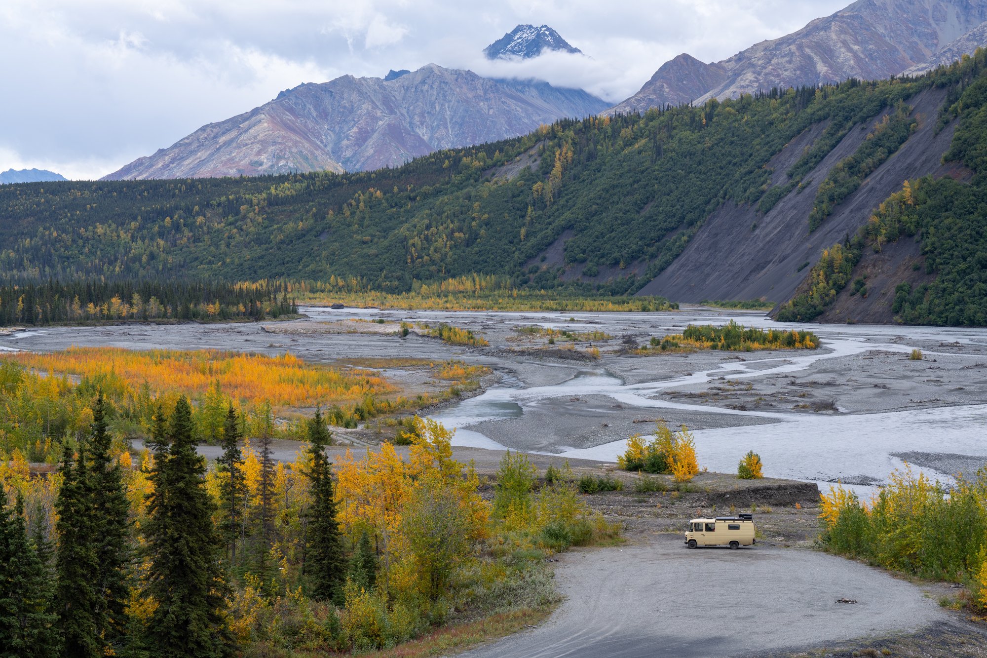 We verbleven uiteindelijk meer dan een maand in Alaska. Niet alleen omdat we zo genoten van de landschappen, maar ook omdat we Bruno’s kleppen wilden laten stellen. Kleppen stellen is vrij specifiek voor oudere dieselmotoren (bij nieuwere auto’s gaat dit automatisch) en moet eigenlijk elke 20.000 kilometer gebeuren. We hadden in Vancouver al een poging gedaan om dit klusje te laten klaren, maar deze monteur had hier niet de juiste tools voor. En omdat Bruno nog goed reed, was de urgentie voor ons nog niet zo groot om snel iemand te zoeken voor de kleppen.