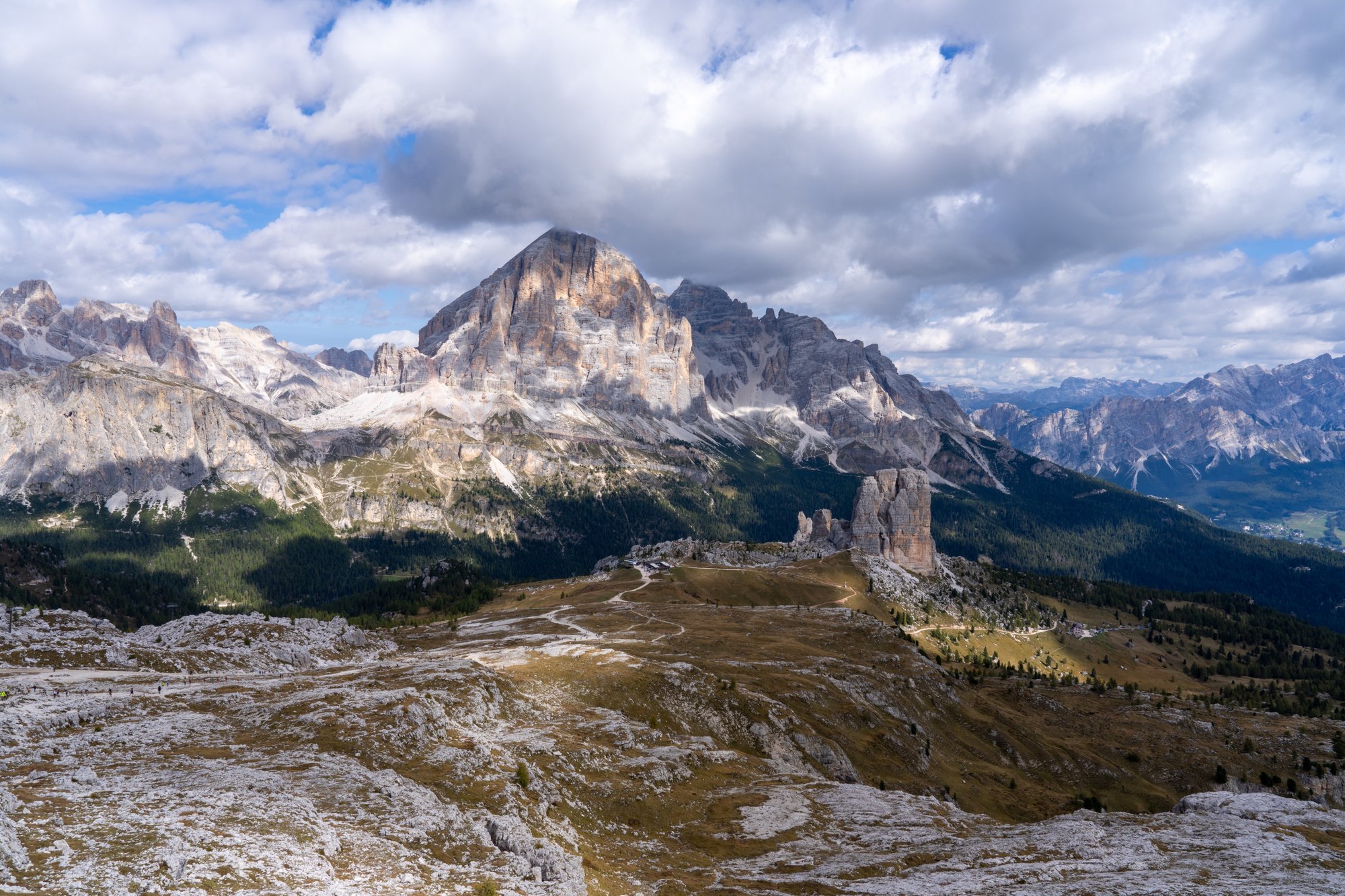 We zoeken een rustig plekje op en genieten van dit waanzinnige uitzicht. We turen naar de rotsachtige bergen tegenover ons met hun kenmerkende bruine en grijze kleuren, naar de groene vallei aan de andere kant, naar het stadje Cortina d’Ampezzo en natuurlijk naar de eyecatcher in het landschap: Mount Averau. Wat een fantastische berg is dat!