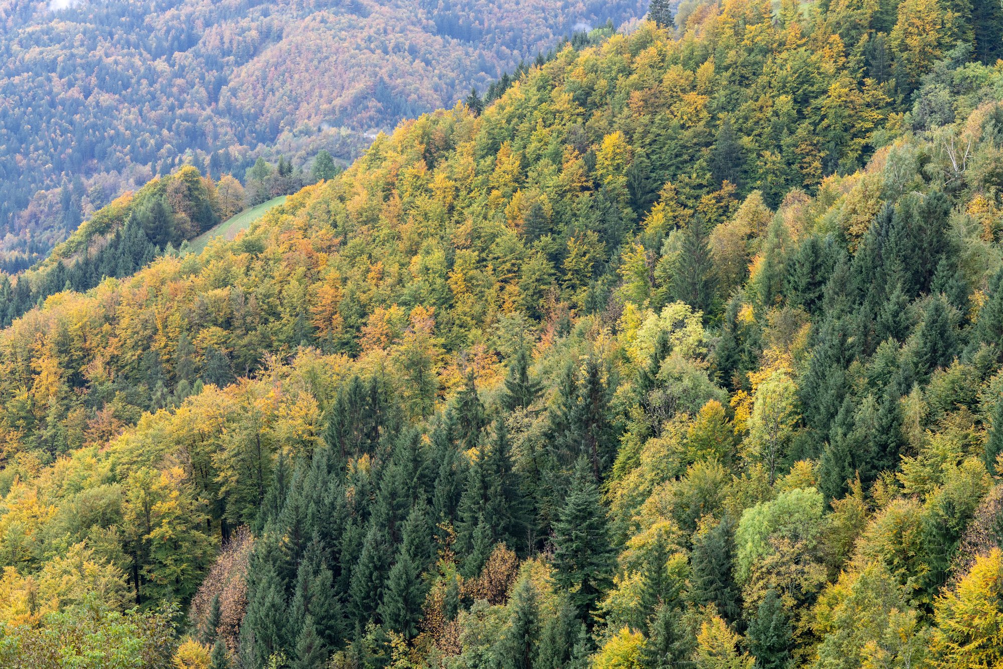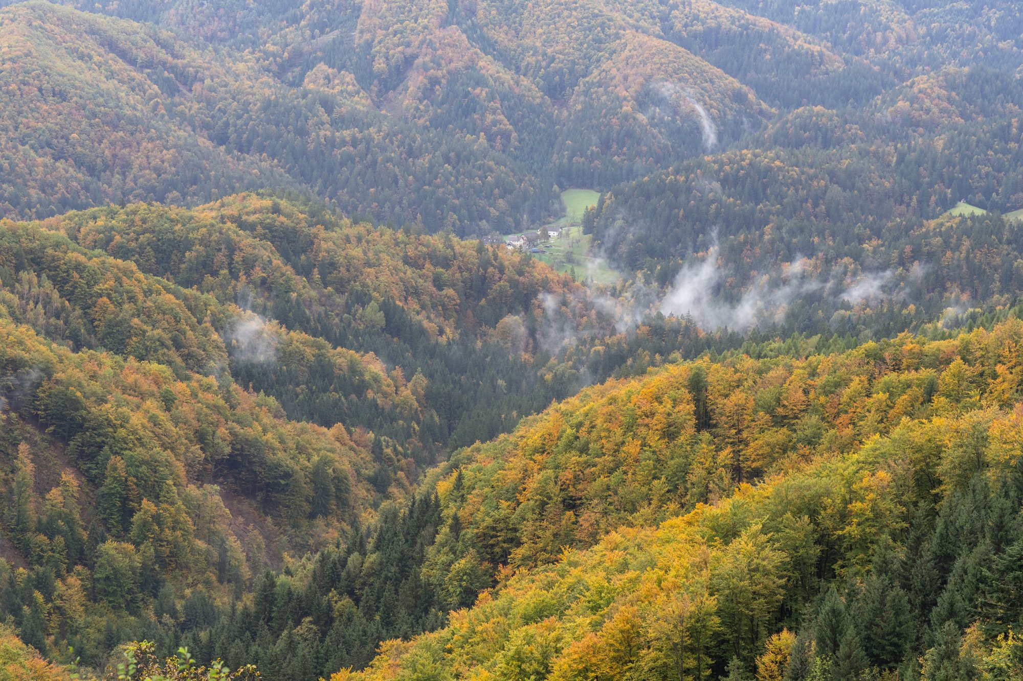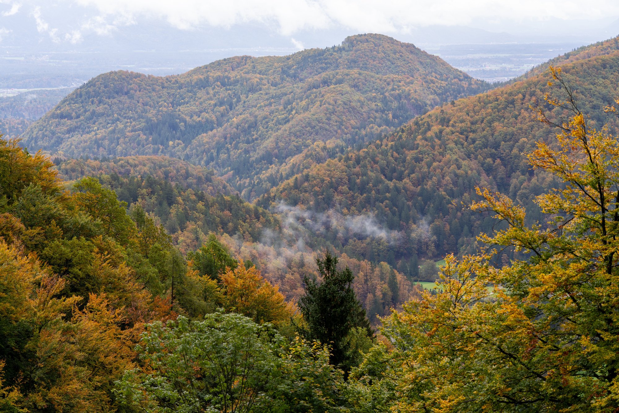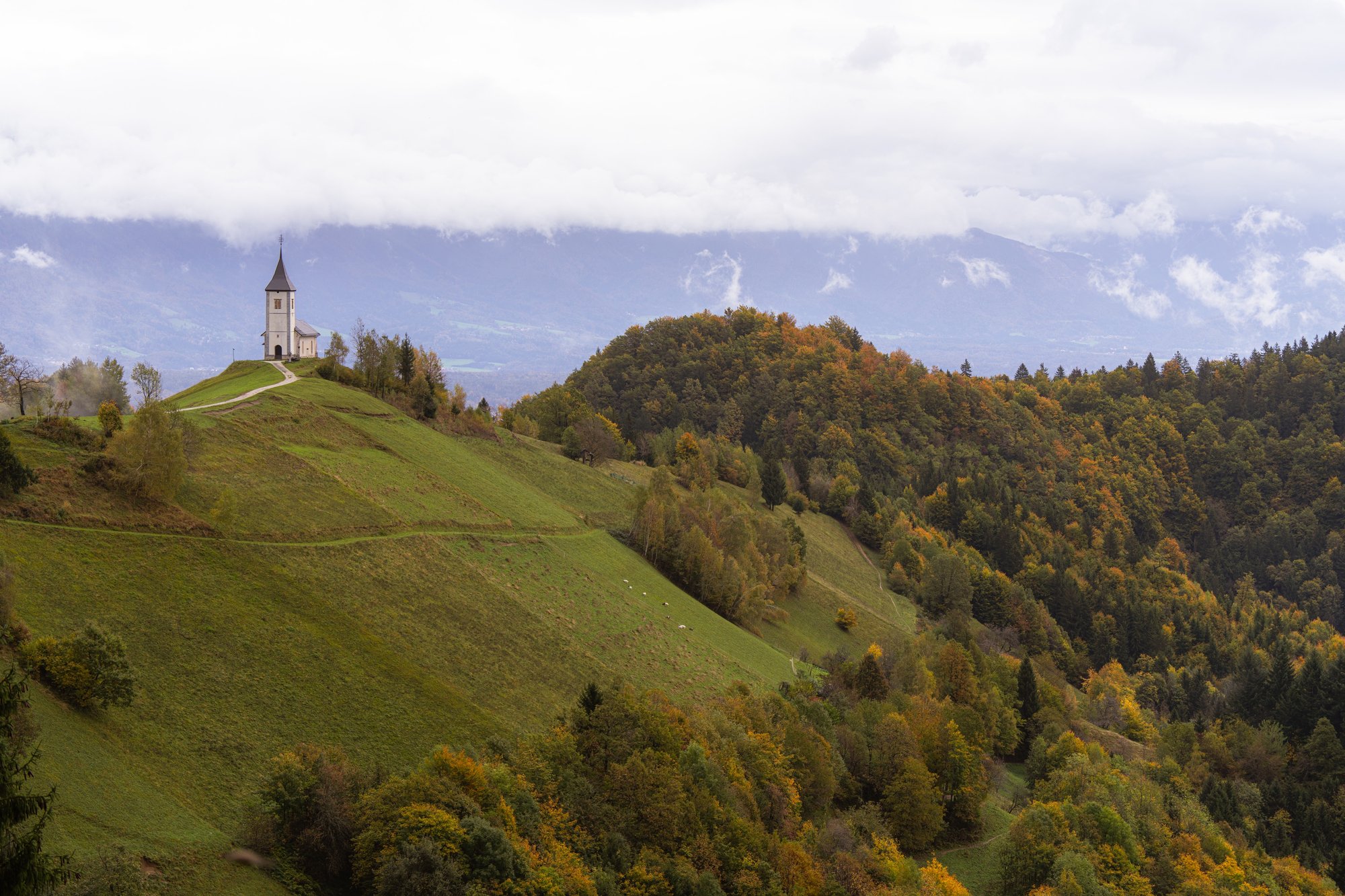 Het meest pittoreske kerkje van Slovenië ligt in Jamnik. De kerk ligt ietwat verscholen in het binnenland, op een heuvel en met een weids uitzicht over de beboste bergen erachter. Het is de droom van veel fotografen en dus gingen ook wij hier een kijkje nemen. Helaas namen de laaghangende wolken een deel van het uitzicht weg, maar wij hadden in oktober dan wel weer prachtige herfstkleuren voor onze lens. Elk jaargetijde heeft wel iets!