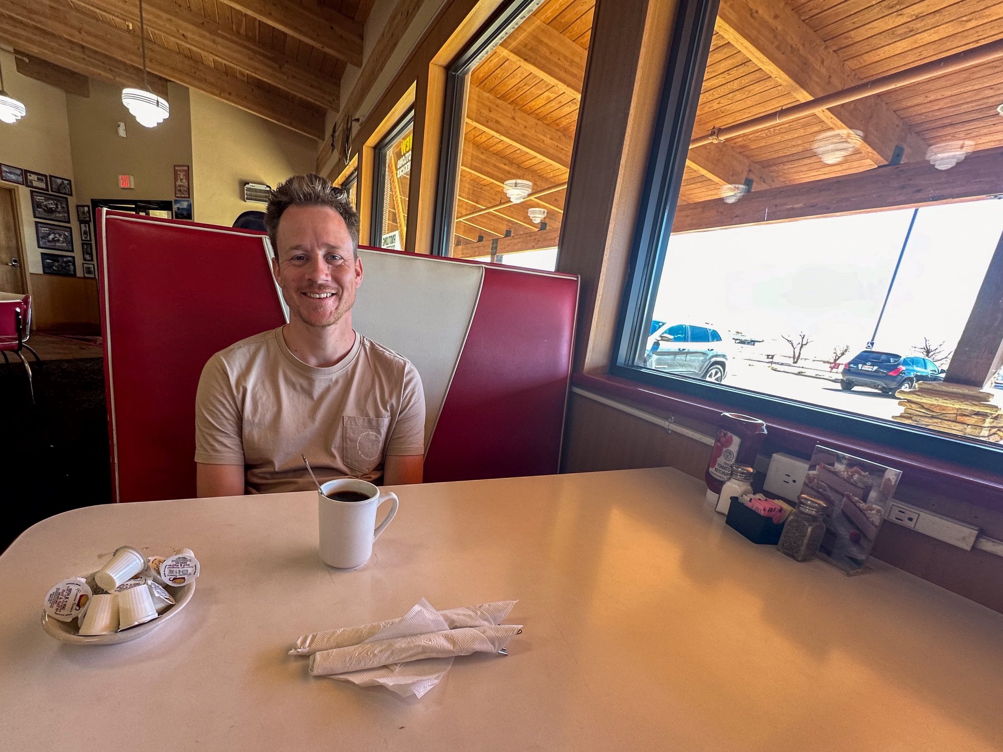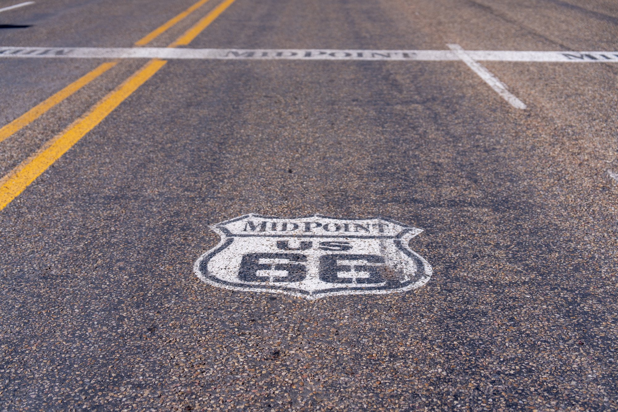 Precies in het midden van Route 66 - op 1.970 kilometer van zowel Chicago als Santa Monica - vind je Midpoint. Hier staat het logo van Route 66 op het wegdek geschilderd en je vindt er Midpoint Cafe. Dit zou een plek moeten zijn met de typische Amerikaanse sfeer zoals je ziet in films. Rode, leren banken in een U-vorm, een retro inrichting en oneindig veel koffie. Helaas zat Midpoint Cafe midden in een verbouwing en was het daarom gesloten. Jammer, want wij wilden er lunchen om die echte Route 66 vibe te ervaren.